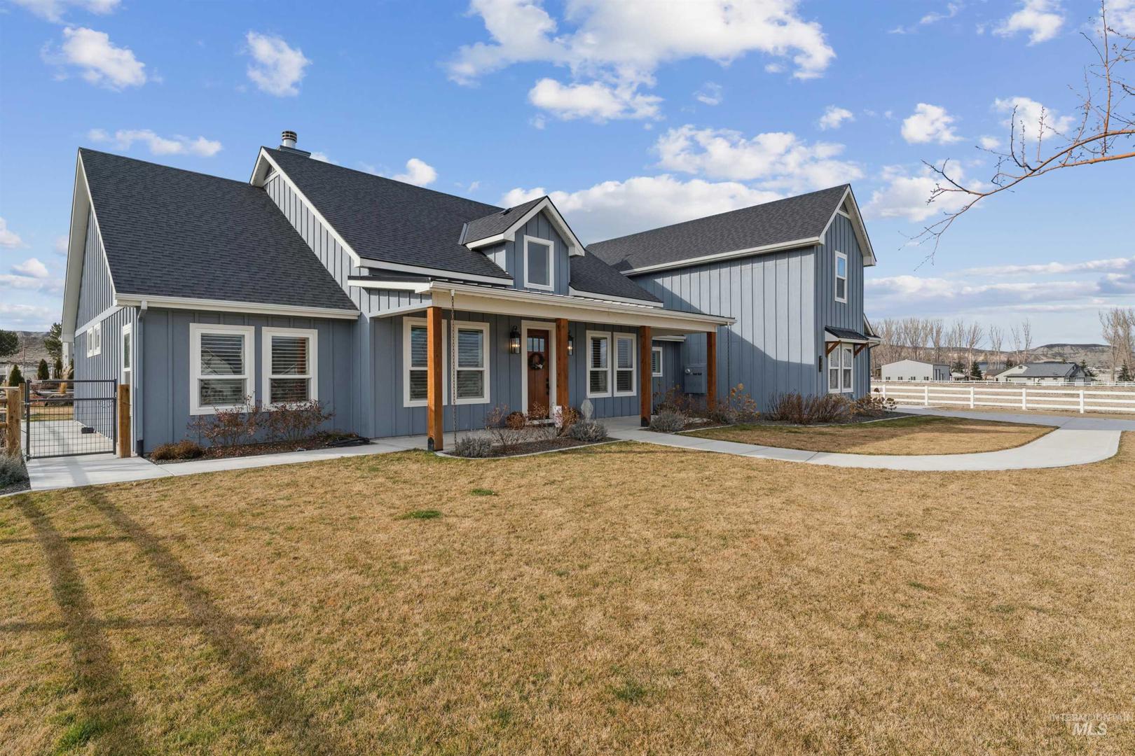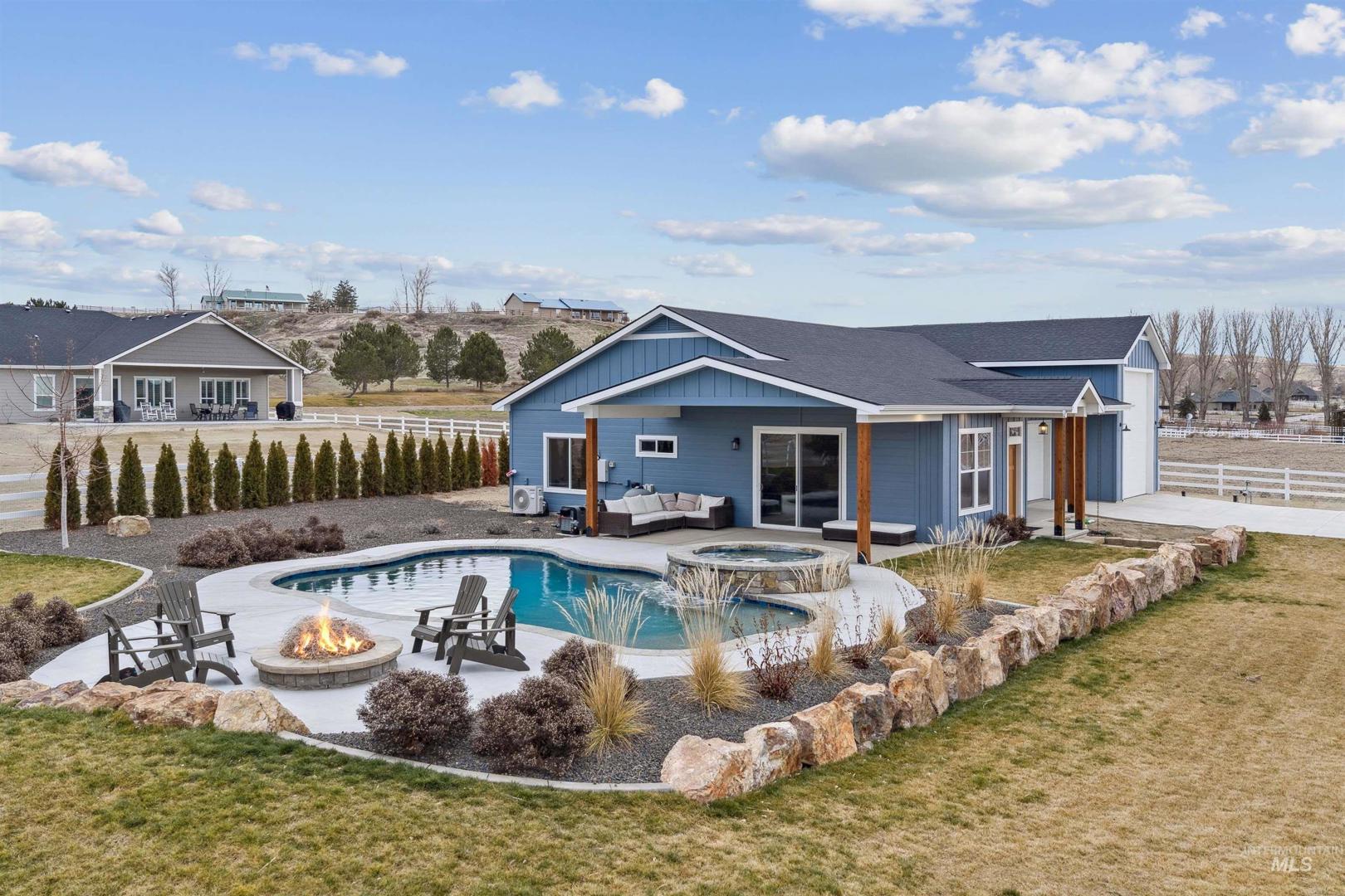 Luxury Custom Estate | 1.5 Acres | Pool House | Snake River Access Exceptional custom estate in desirable Hidden Valley Estates in the county area of Marsing. 1.5 landscaped acres, this property offers luxury finishes, flexible living space and private community dock & access to the Snake River. Main Res: 4-bedroom, 4.5-bath with 12’ ceilings, expansive windows, and abundant natural light. Great room with wood-burning fireplace. Chef’s kitchen has 48” Wolf rangetop & dbl ovens, 48” Sub-Zero fridge, 33” Kohler sink, knotty alder cab’s, and quartzite counters. Laundry rm includes add’l 30” Sub-Zero fridge. LVP flooring throughout. Bonus room above garage w/ ¾ bath—ideal for guests, office, or media room. Cust. 4” wood shutters, blackout window coverings in primary suite, whole-home Ethernet, permanent ext. holiday lighting, and oversized 3 car gar. with epoxy flooring. Pool House: Fully permitted pool house ideal for multigen living or ext’d stays. Has custom cabinetry, LVP flooring, Sub-Zero bev. fridge, BR w/ full bath. Att’d 2car garage w/epoxy flooring (currently gym) + RV bay. Outdoor Amenities: Resort-style backyard w/upgraded in-ground pool & attached 8’ spa, fire pit, & cov’d patio. Fully irrigated & fenced lot w/fenced pasture, chicken coop, run-in shelter, and Kohler backup generator. Rare opportunity to own a luxury estate w/acreage, flexible living and private river access