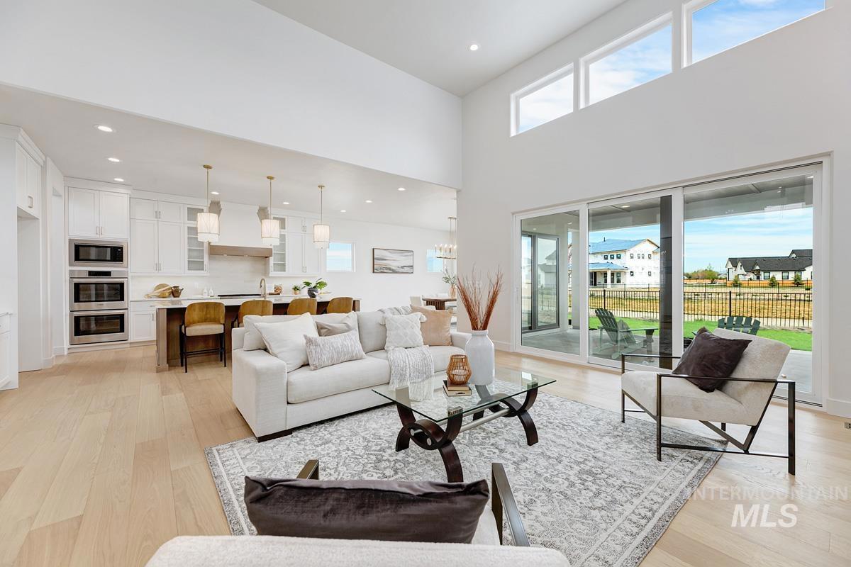 Single-story located in Star’s premier waterfront community. Beyond its stunning curb appeal, this home boasts a split garage with dual entry points: one door opens to an ensuite guest room with a luxurious bath and nearby flex room, the other leads into the expansive great room—featuring soaring ceilings and a glass-enclosed wine cellar. The chef’s kitchen, centered around a large island, overlooks the fireplace in the great room and offers ample counter space and handsome cabinetry.The corner primary impresses with massive 8’ windows and a spa-inspired bath complete with a freestanding tub, tiled shower, and an enormous walk-in closet.Now open, the River Park Estates Clubhouse offers endless opportunities for activity and relaxation. Enjoy pickleball, swimming, lounge areas, and more, all presented in a beautiful modern aesthetic. Home is ready now.