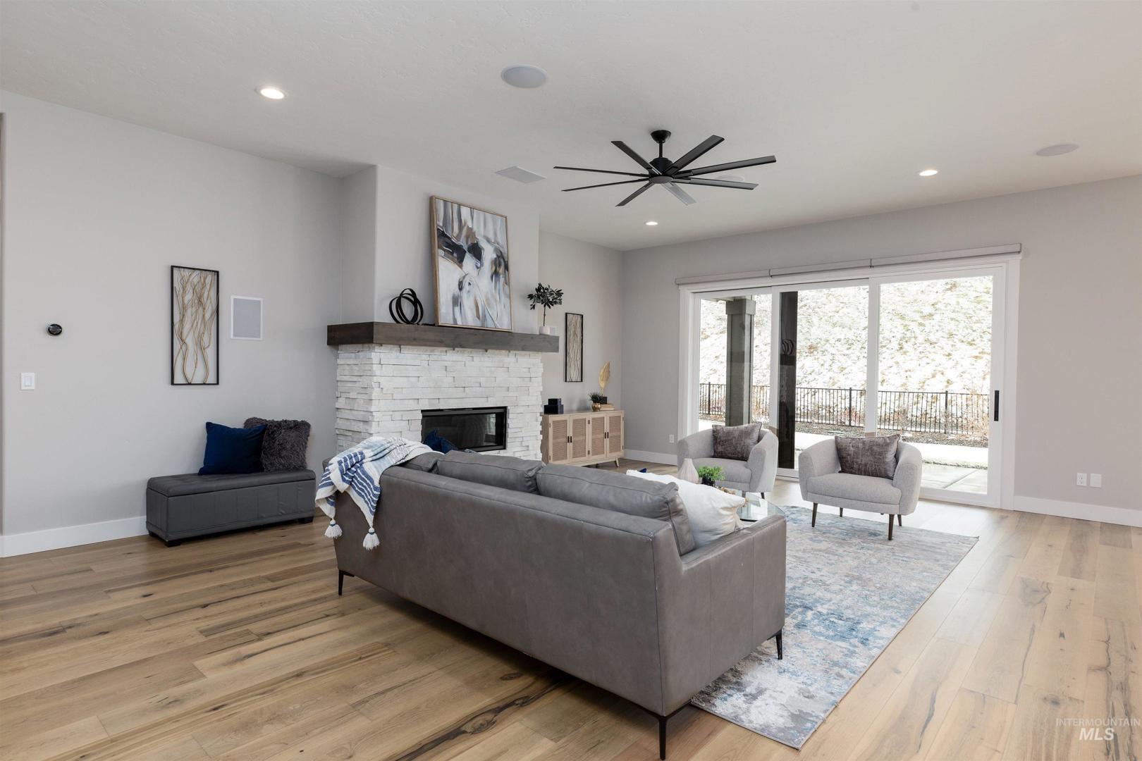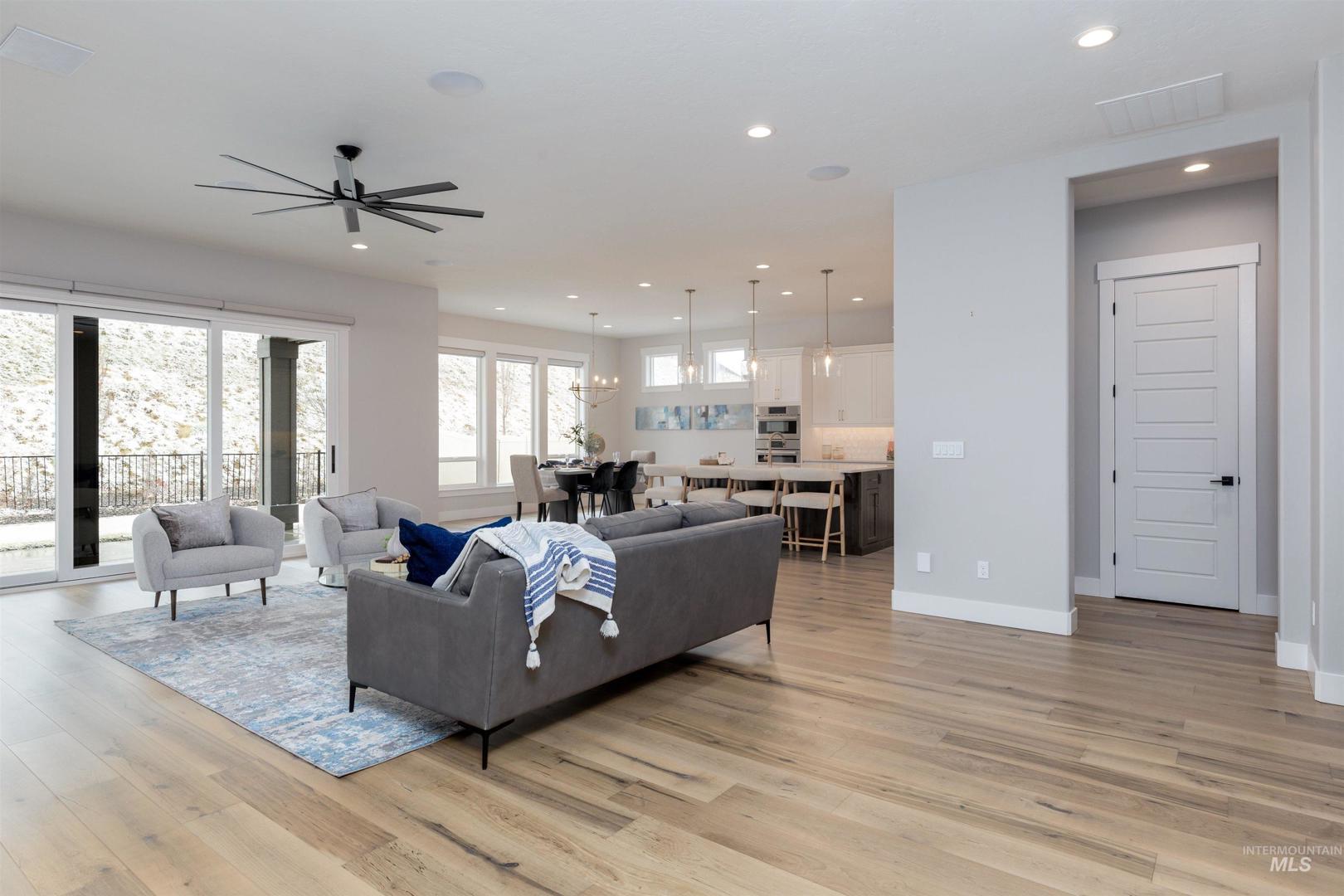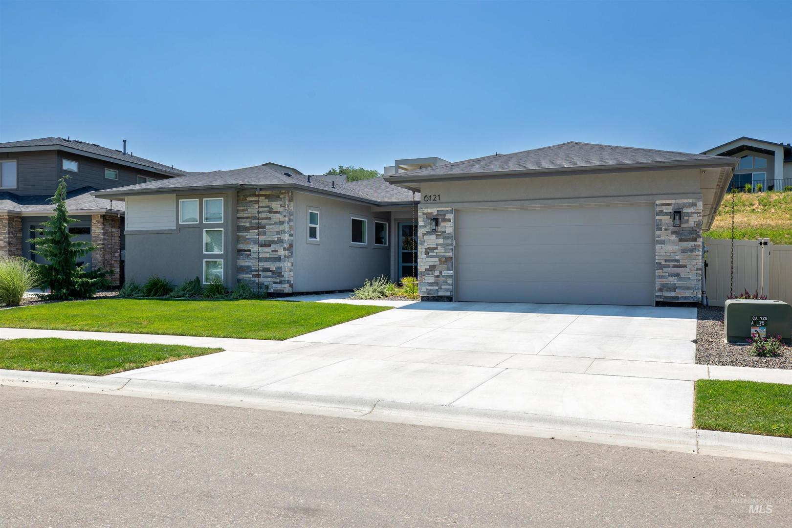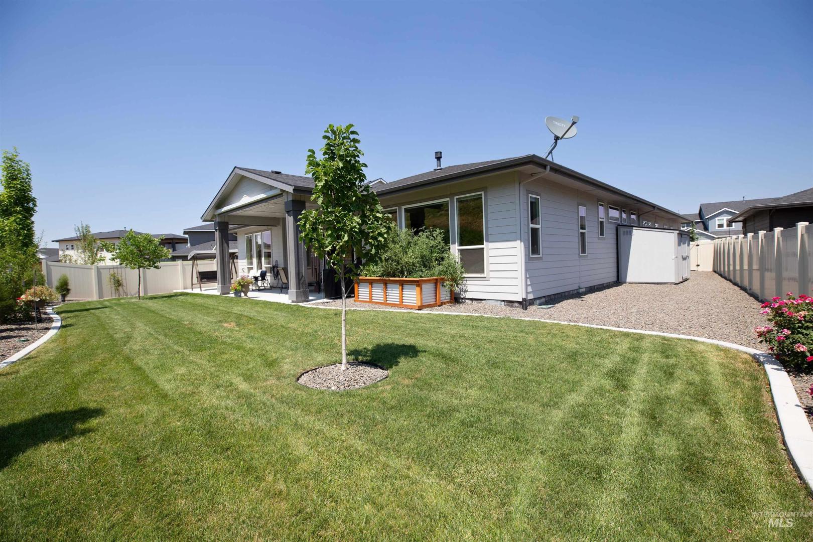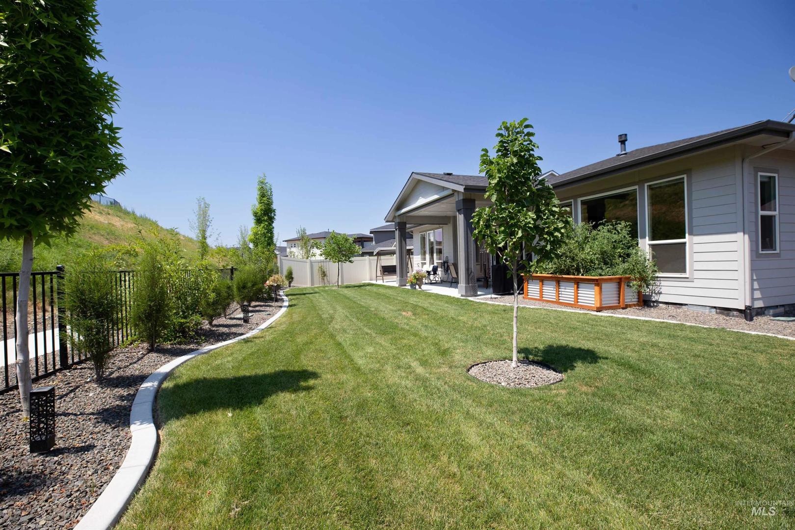 Thoughtfully designed, like new single level home in Sky Mesa. Inside find tons of natural light, elegant finishes, plenty of storage & perfect layout. Kitchen features quartz countertops, induction stovetop (plumbed for gas too!) double oven, granite composite sink, beautiful white cabinetry inc pull-out trash & soft close feature, HUGE island/breakfast bar & engineered hardwood. Great Rm w/cozy fireplace. Primary suite boasts LG walk-in closet, granite countertops, separate dual vanities, framed mirrors, step-in tile shower & freestanding Maxx Ariosa soaker tub. Bonus/Flex Rm could be a bedroom, second living space, etc. The extended covered patio offers a 12` wide patio door, motorized shade, 7.1 surround sound, and a HDMI outlet for TV. Backs to a hillside so no back neighbors! Extensive concrete curbing, garden box & shed. The finished 3-car tandem garage is upgraded w/polyaspartic concrete floors, sink & storage racks. Sky Mesa offers top-tier amenities inc two infinity pools, basketball & walking paths!