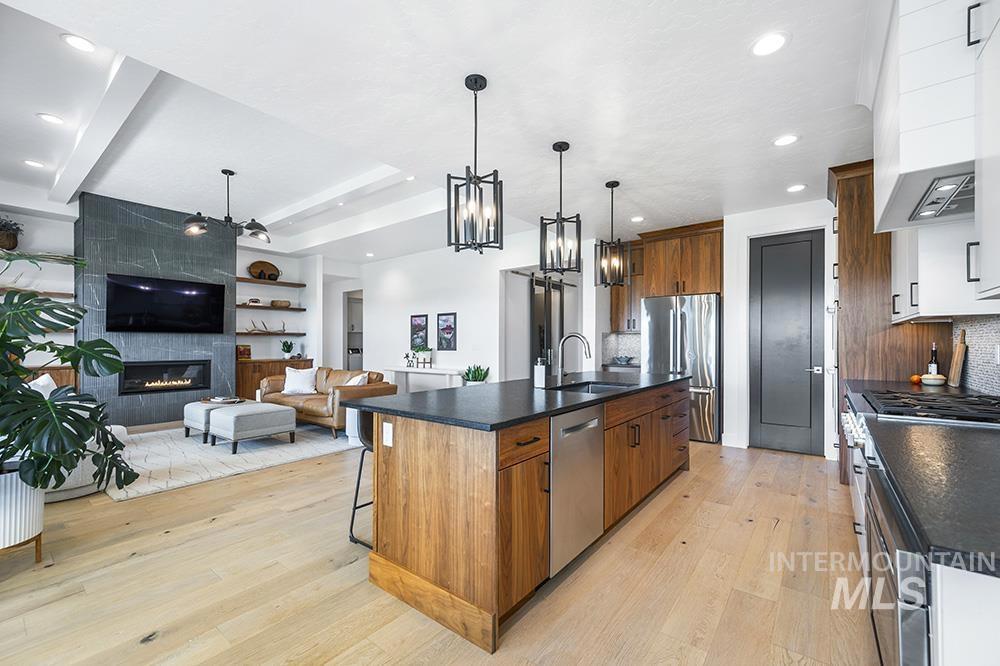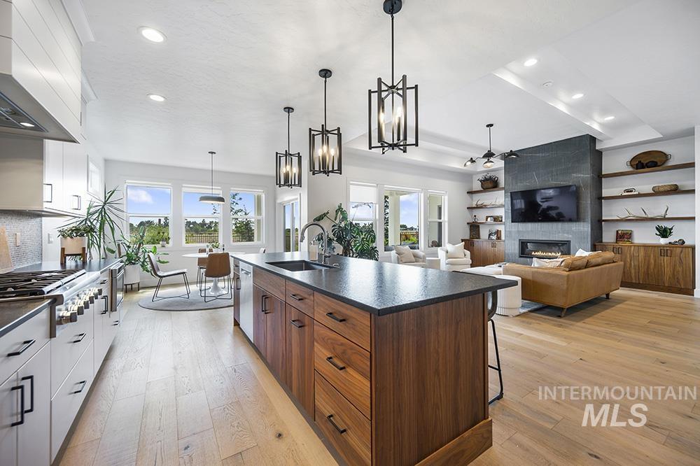 An exquisite modern retreat in Eagle’s premier Legacy community, where lush landscaping, shimmering ponds, and resort-style amenities create a lifestyle of luxurious comfort. Designed by Solitude Homes with striking architectural lines & a sophisticated, warm-meets-modern aesthetic, this single-level residence features sunlit open-concept living, tall ceilings, & oak hardwoods. The gourmet kitchen is a chef’s dream with a walnut island, Bosch double ovens, Thermador gas range, leathered counters, and spacious walk-in pantry. A sleek fireplace with floor-to-ceiling textured tile anchors the great room, while a dining room and covered patio offer seamless indoor-outdoor living. The indulgent, spa-inspired primary suite includes patio access, terrazzo tile, soaking tub, and dual-sink vanity. 2 additional bedrooms & designated office add desirable function to the space. Legacy’s 590-acre grounds feature a 3-hole golf course, pools, courts, clubhouse, trails, & preserved open space, close to downtown Eagle.
