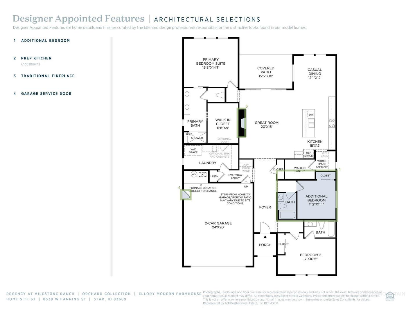 The Ellory seamlessly blends charm and elegance within a beautifully designed floor plan. An extended foyer hallway flows past 2 spacious secondary bedrooms with their own bathrooms, revealing the expansive great room and a gorgeous covered patio. A bright casual dining area can be found adjacent to the well-appointed kitchen that offers an oversized center island with breakfast bar, plenty of counter and cabinet space, a roomy workspace, and a sizable walk-in pantry. The superb primary bedroom suite is defined by a stunning walk-in closet and a spa-like primary bath with dual-sink vanity, a large luxe shower with seat, and a private water closet. Easily accessible laundry, an everyday entry, a powder room, and ample additional storage are additional features of the Ellory. Discover the Regency difference at this premier new home community for 55+ active adults. Front and rear landscape included. Home is under construction and photos are similar. BTVAI