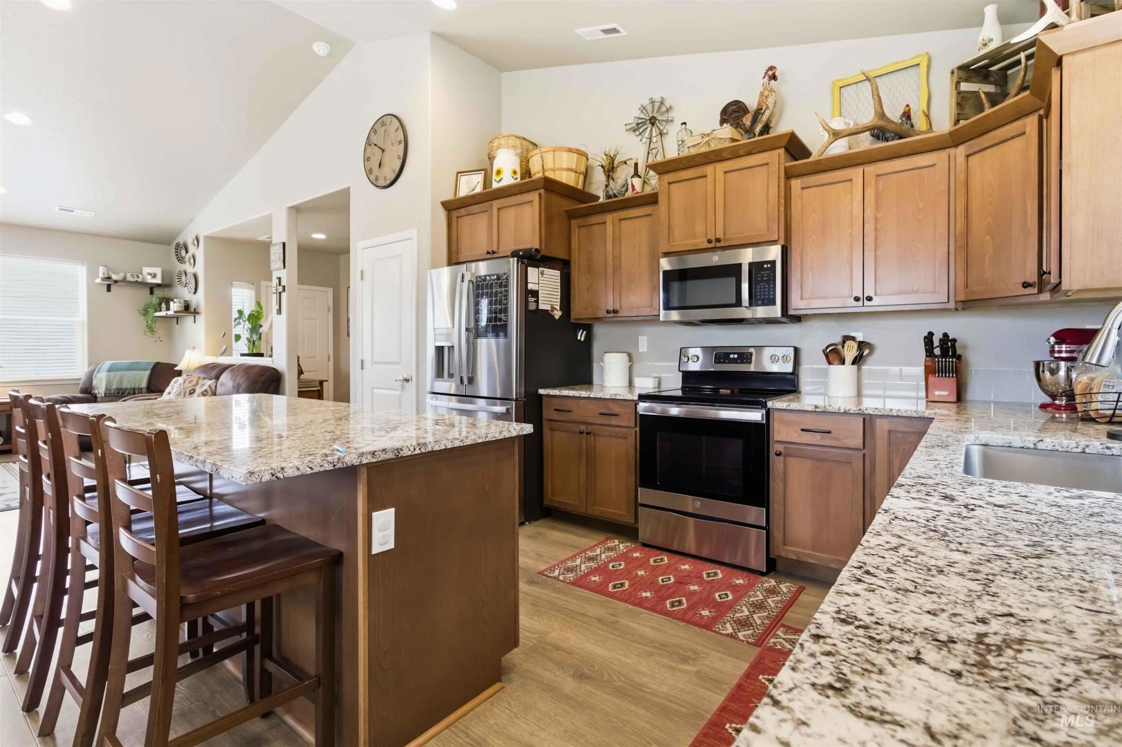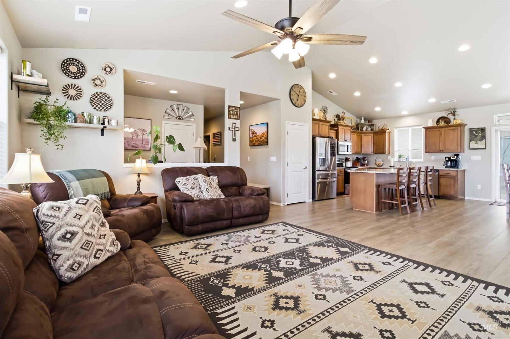 Breathtaking custom-built home on 3.7 acres with 360-degree mountain views overlooking the Payette River. Constructed in 2021, this 2,052 sq. ft. residence offers a bright, open-concept floorplan with vaulted ceilings, engineered hardwood floors, knotty pine accents, stacked stone wood-burning fireplace, and walls of windows framing panoramic scenery. The gourmet kitchen is a chef’s dream with a large custom granite island and solid surface countertops, custom cabinetry, designer tile, and pantry. The flexible floorplan includes 4 bedrooms and central laundry room. The luxurious main suite features a spa-like bath with soaking tub, walk-in shower, dual vanities, and an oversized closet. Enjoy Idaho mountain living from the covered patio while watching wildlife or taking in views of Bogus Basin. The property includes an expansive three car garage with RV parking, and is horse-friendly. Located just 30 minutes to Eagle with HOA private river access, this home perfectly blends adventure, comfort, and tranquility. A must see property close to all your outdoor recreation fun!
