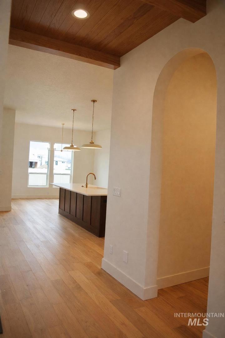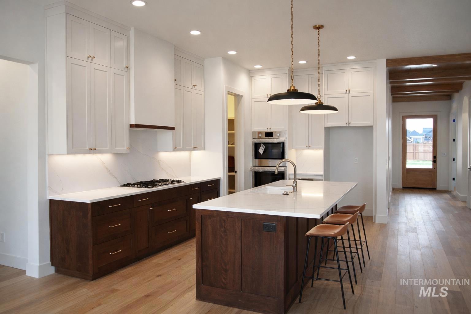 Introducing the Donato by Oakmont Homes, a beautifully designed 5-bedroom home with a bright, open layout and 10’ ceilings. Natural hardwood floors and large windows fill the space with warmth and light. The kitchen features quartz countertops, a stylish backsplash, soft-close shaker cabinetry, and Bosch appliances including double ovens, a gas cooktop, and drawer microwave. Custom touches like wall paneling, shiplap, and wainscoting add charm throughout. The great room offers exposed beams, a cozy fireplace, and easy patio access. The primary suite includes a shiplap ceiling, freestanding soaking tub, champagne bronze fixtures, and a spacious walk-in closet. A main-level office and upstairs bonus room provide flexibility, while the 3-car garage offers plenty of room for vehicles and storage. Located in the Centera community with a pool, walking paths, and open green space just minutes from Eagle’s shopping and dining