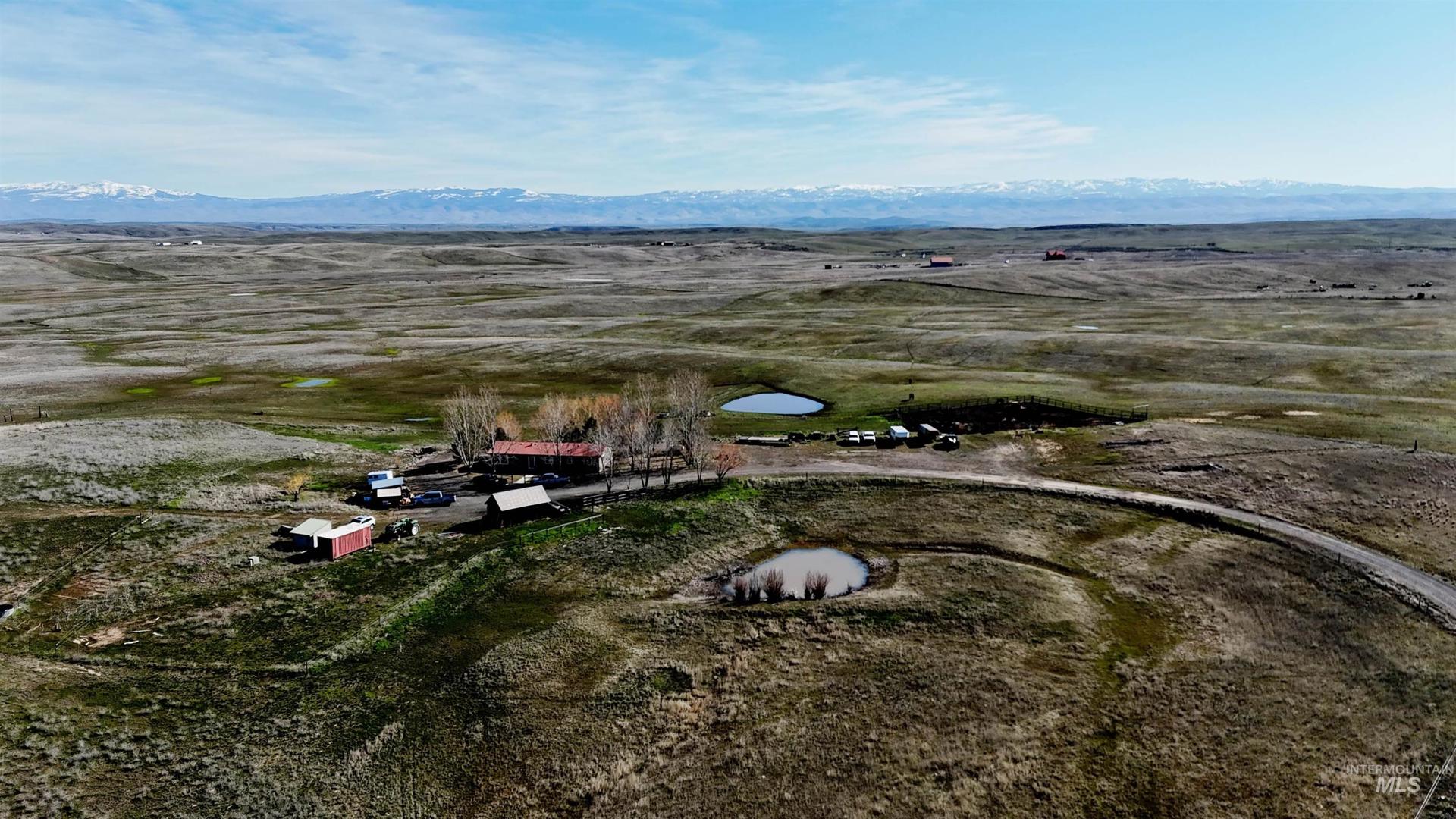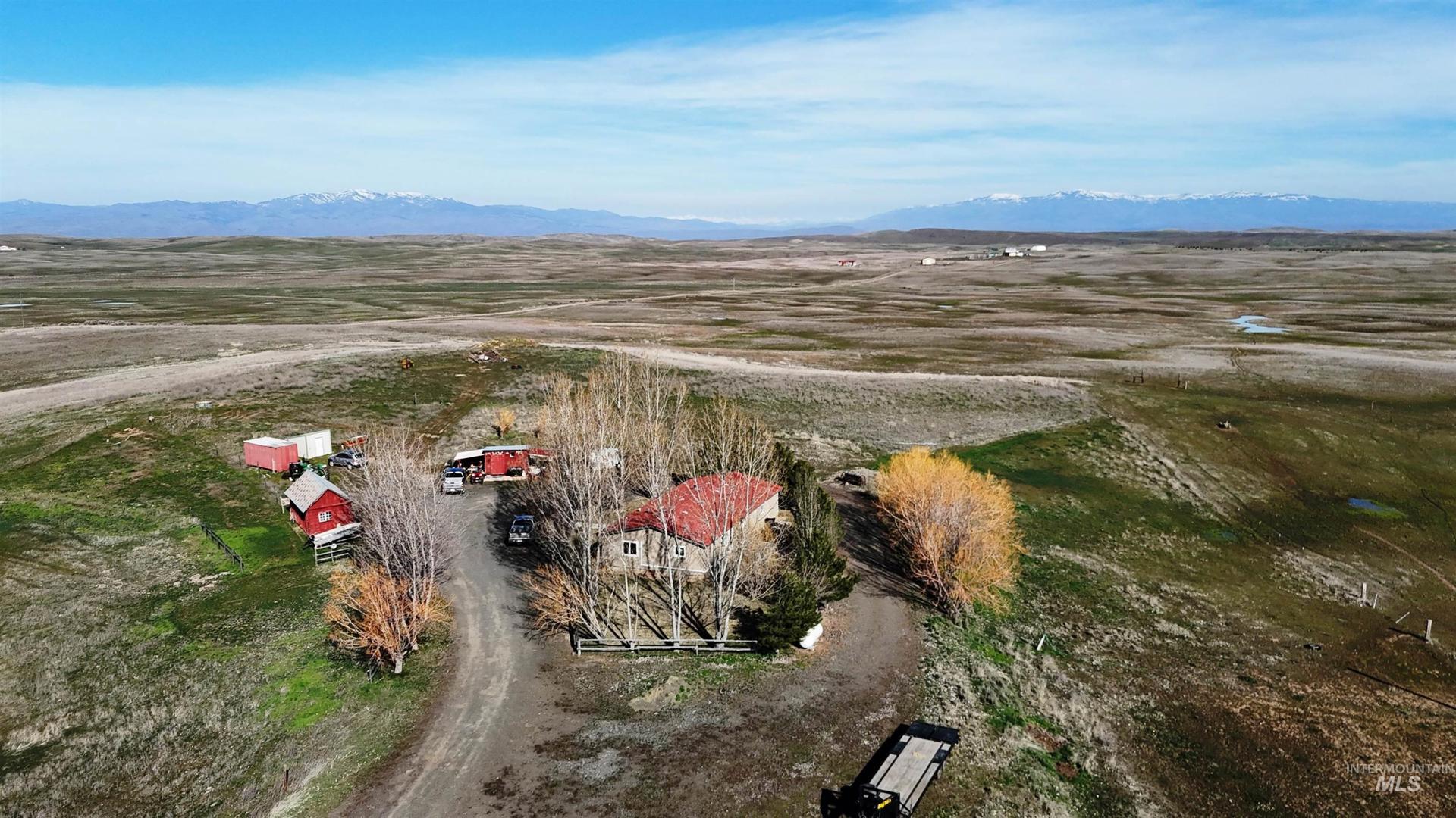 Private 100-acre homestead with additional building potential. This scenic country property features ponds, corrals, and panoramic views of Hitt, Cuddy, the Wallowas, Cornucopia Range, Council Mountain, and West Mountain. The open-concept floor plan is ideal for entertaining and has been extensively updated with LVP flooring, new vinyl windows and blinds, modern lighting, custom beams and trim, fresh texture, and paint. The remodeled kitchen includes a farm-style stainless sink, custom island and cabinetry, laminate countertops, subway tile backsplash, and propane range/oven. Bedrooms offer custom closets and doors. Enjoy year-round comfort with a split-unit heat pump/AC system (3 handlers), propane furnace, pellet stove with cultured stone hearth, and a 48,000-grain water softener with iron removal. Bathroom fully renovated. Exterior highlights include a new front door, concrete patios and walkways, mature landscaping, ponds, corrals, and multiple outbuildings. For just house & 80 acres see MLS #98978186.