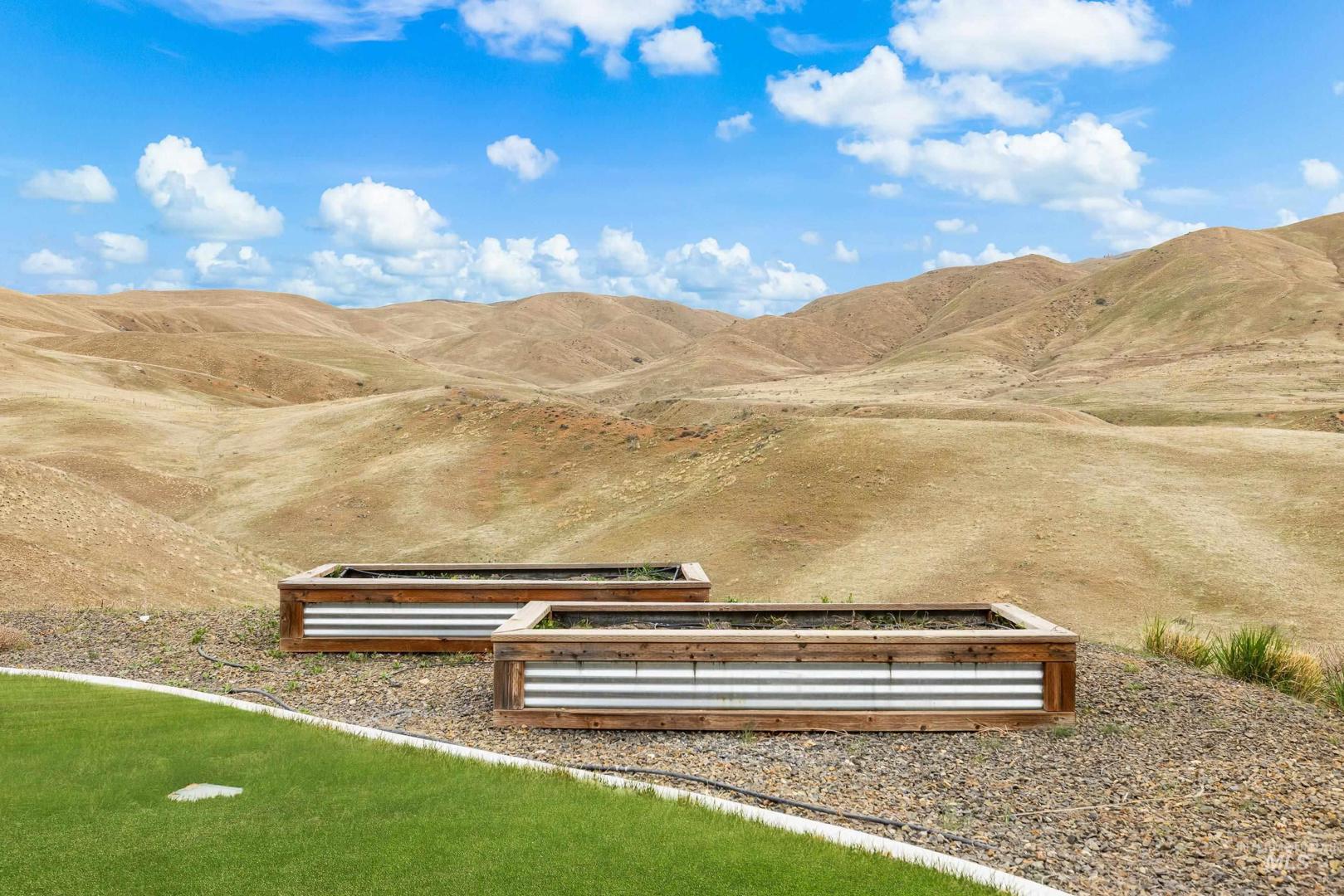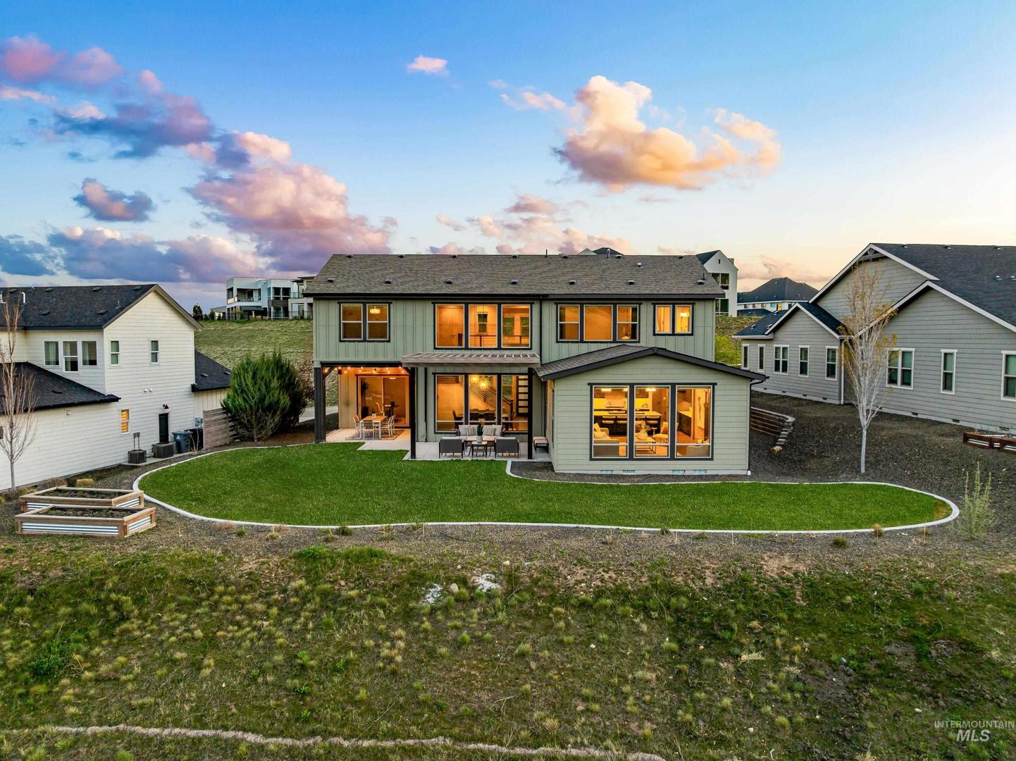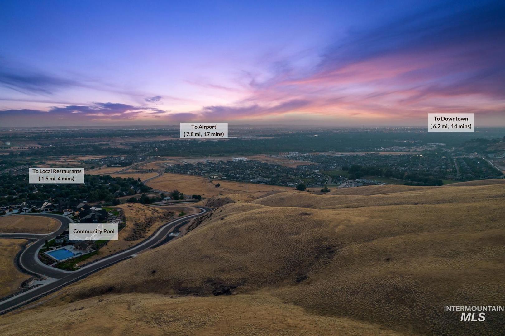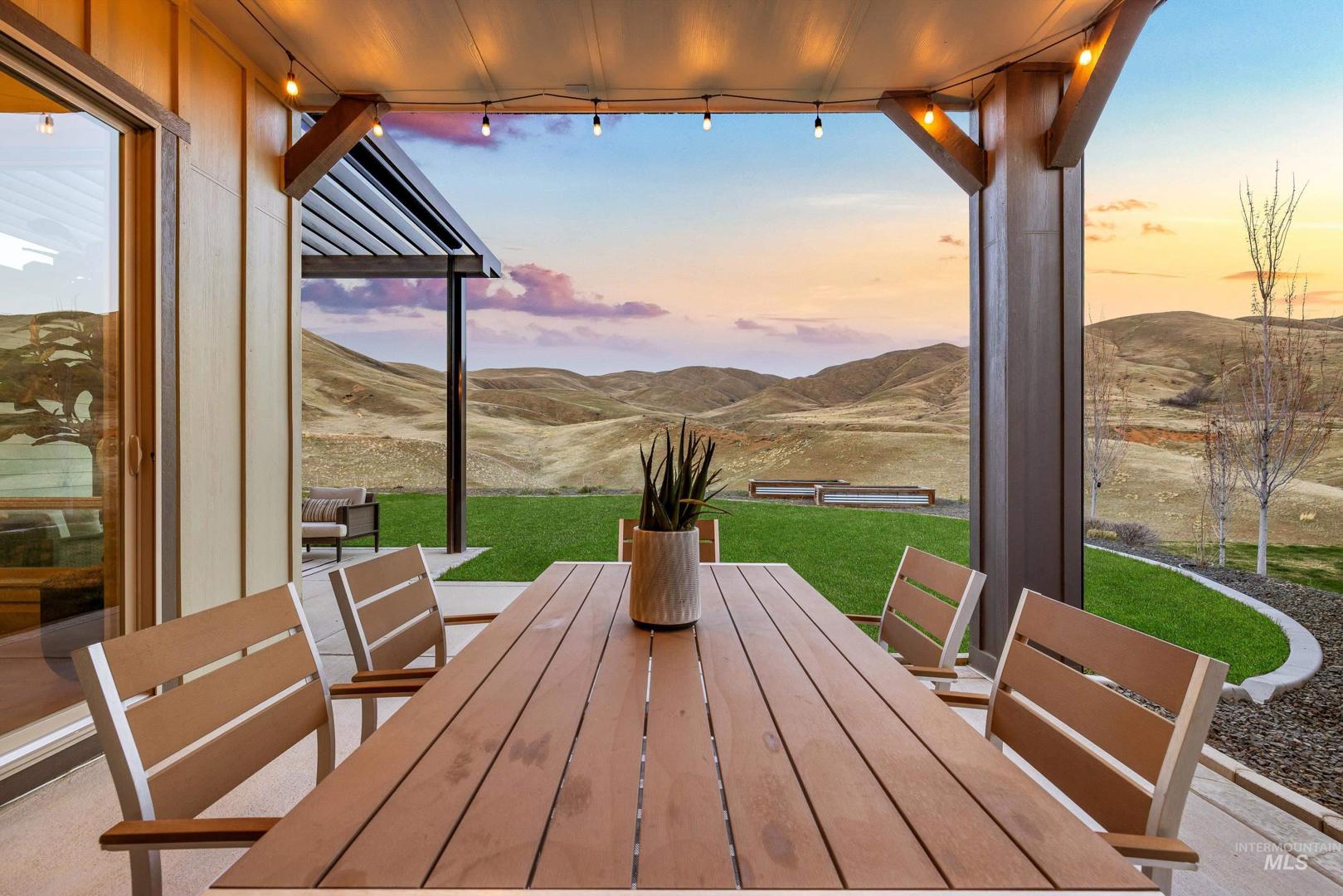 Nestled against the rolling Boise foothills in beautiful Harris North, this modern masterpiece offers mesmerizing views creating the ideal backdrop for entertaining and relaxing in style. An unparalleled level of craftsmanship is highlighted by the ideal blend of rich hardwoods, modern fixtures and high-end custom details at every turn. Stunning chef`s kitchen boasts upgraded appliance package including double oven, gas range, a walk-in pantry, and expansive island overlooking the great room anchored by a warm, gas fireplace. Thoughtfully designed main level features a private guest suite with attached full bathroom and a dedicated office with access to the patio for an elevated work from home experience! Wake to idyllic foothill views in the secluded master reminiscent of a luxurious day spa with dual vanities, lavish soaker tub, and tiled shower. Two generous bedrooms plus a loft complete the second level offering ample space for everyone. Enjoy al-fresco dining beneath a charming pergola or on the extended covered patio shaded by automatic sunshades for year-round enjoyment of the rolling topography. Meticulous landscaping including lush, green grass, concrete curbing and garden boxes, completes the impressive backyard retreat. Three car garage with epoxy floors is the perfect spot for storing toys or use as a workshop with a mini split for added comfort in the single bay!