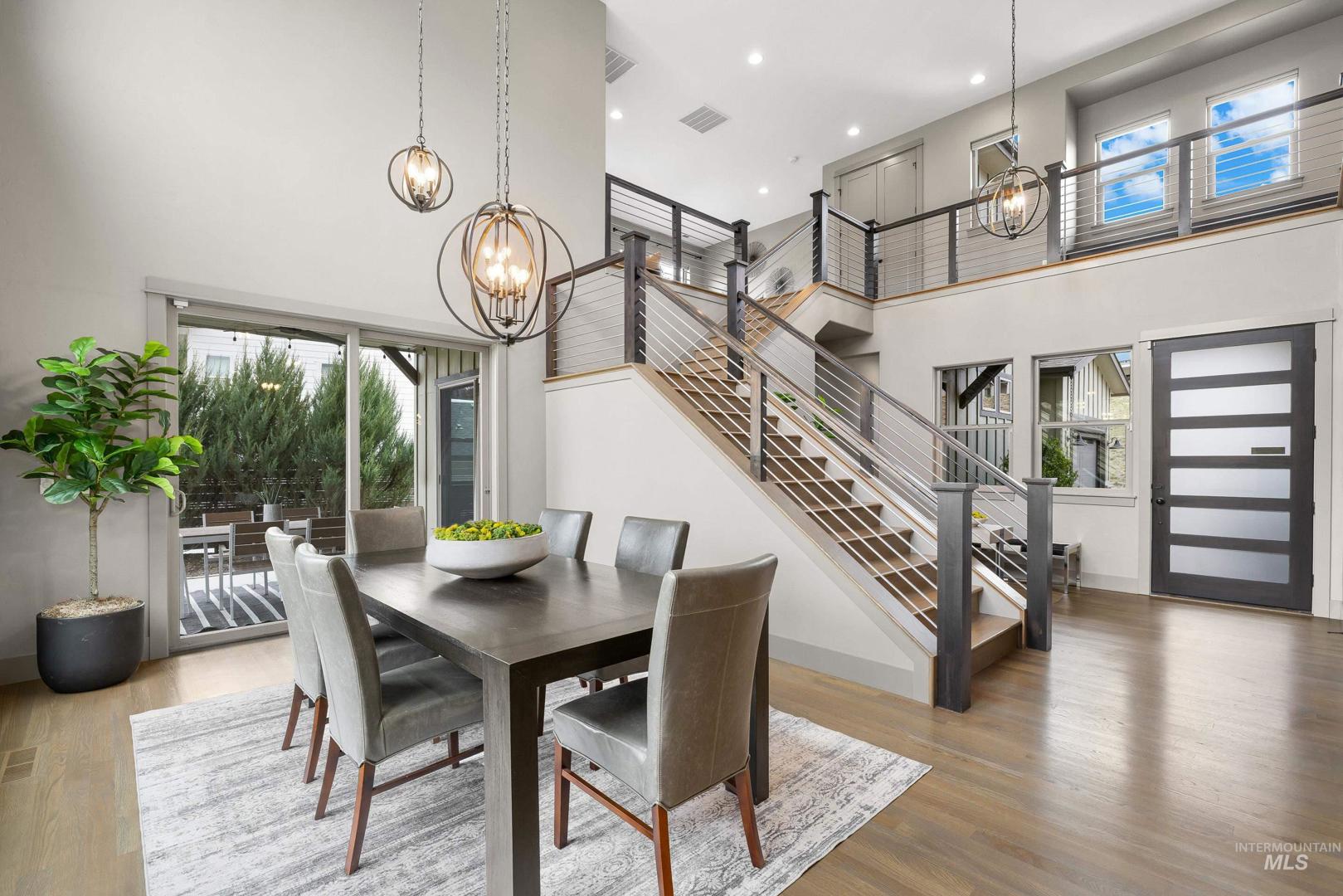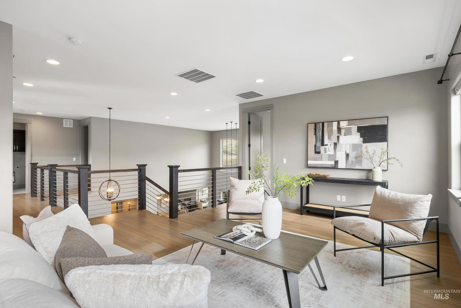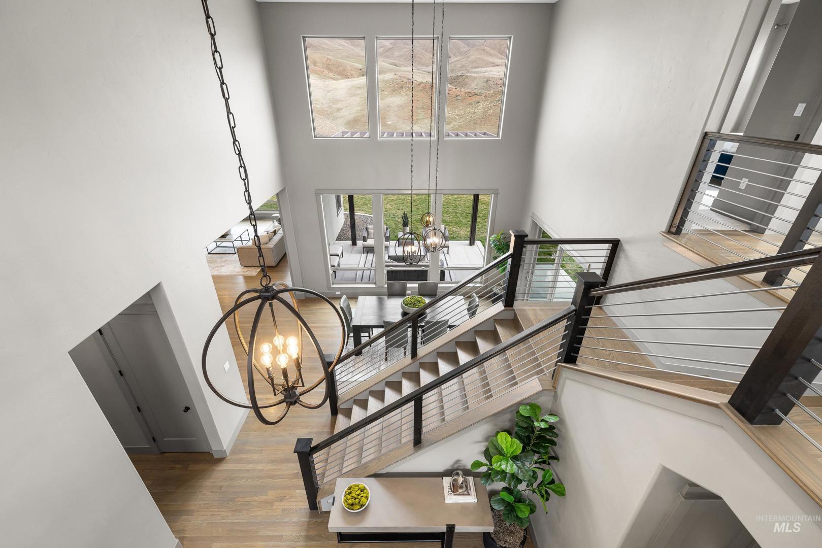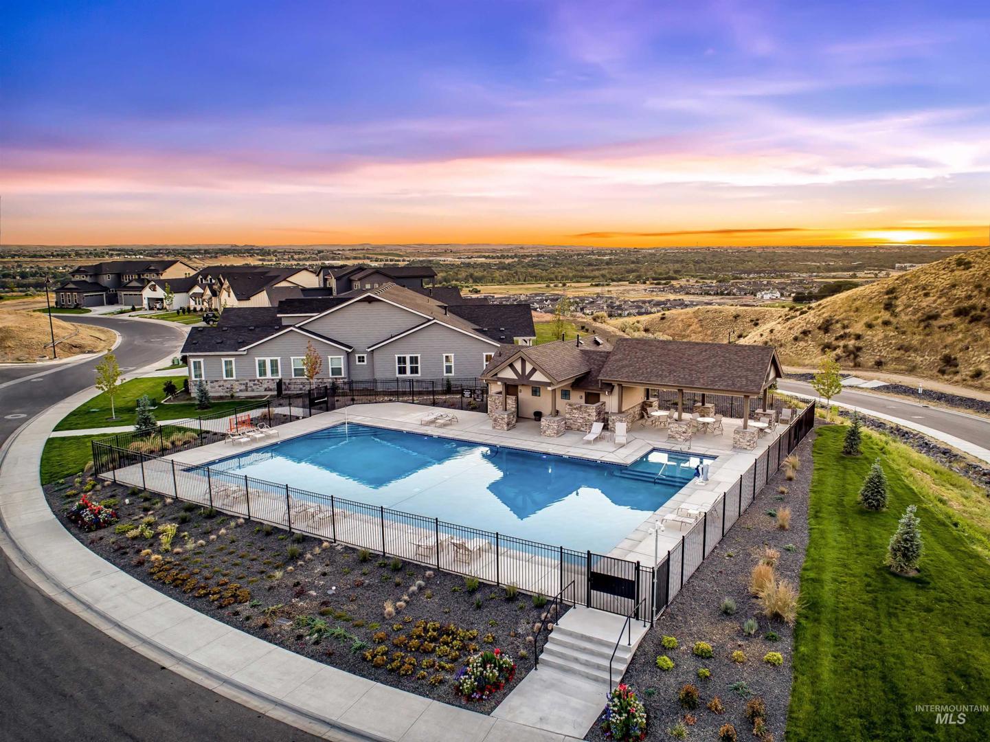 Nestled against the rolling Boise foothills in beautiful Harris North, this modern masterpiece offers mesmerizing views creating the ideal backdrop for entertaining and relaxing in style. An unparalleled level of craftsmanship is highlighted by the ideal blend of rich hardwoods, modern fixtures and high-end custom details at every turn. Stunning chef`s kitchen boasts upgraded appliance package including double oven, gas range, a walk-in pantry, and expansive island overlooking the great room anchored by a warm, gas fireplace. Thoughtfully designed main level features a private guest suite with attached full bathroom and a dedicated office with access to the patio for an elevated work from home experience! Wake to idyllic foothill views in the secluded master reminiscent of a luxurious day spa with dual vanities, lavish soaker tub, and tiled shower. Two generous bedrooms plus a loft complete the second level offering ample space for everyone. Enjoy al-fresco dining beneath a charming pergola or on the extended covered patio shaded by automatic sunshades for year-round enjoyment of the rolling topography. Meticulous landscaping including lush, green grass, concrete curbing and garden boxes, completes the impressive backyard retreat. Three car garage with epoxy floors is the perfect spot for storing toys or use as a workshop with a mini split for added comfort in the single bay!