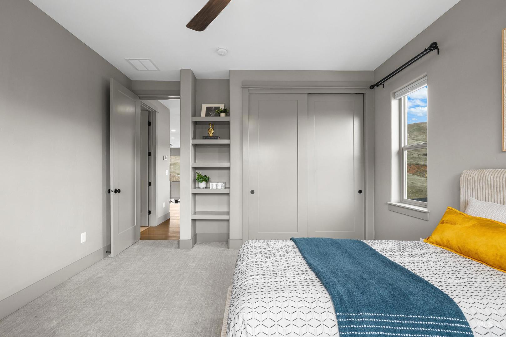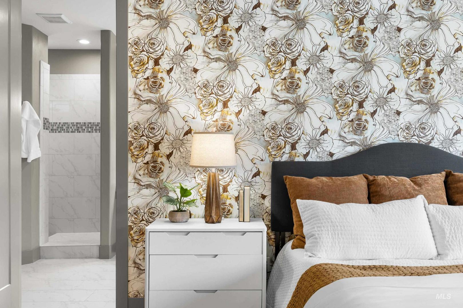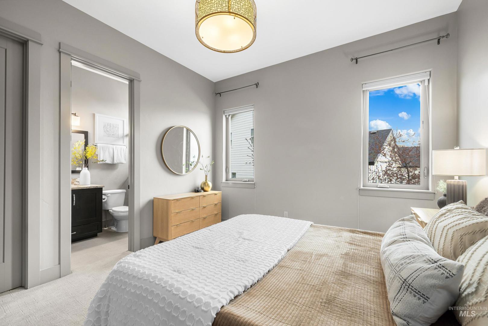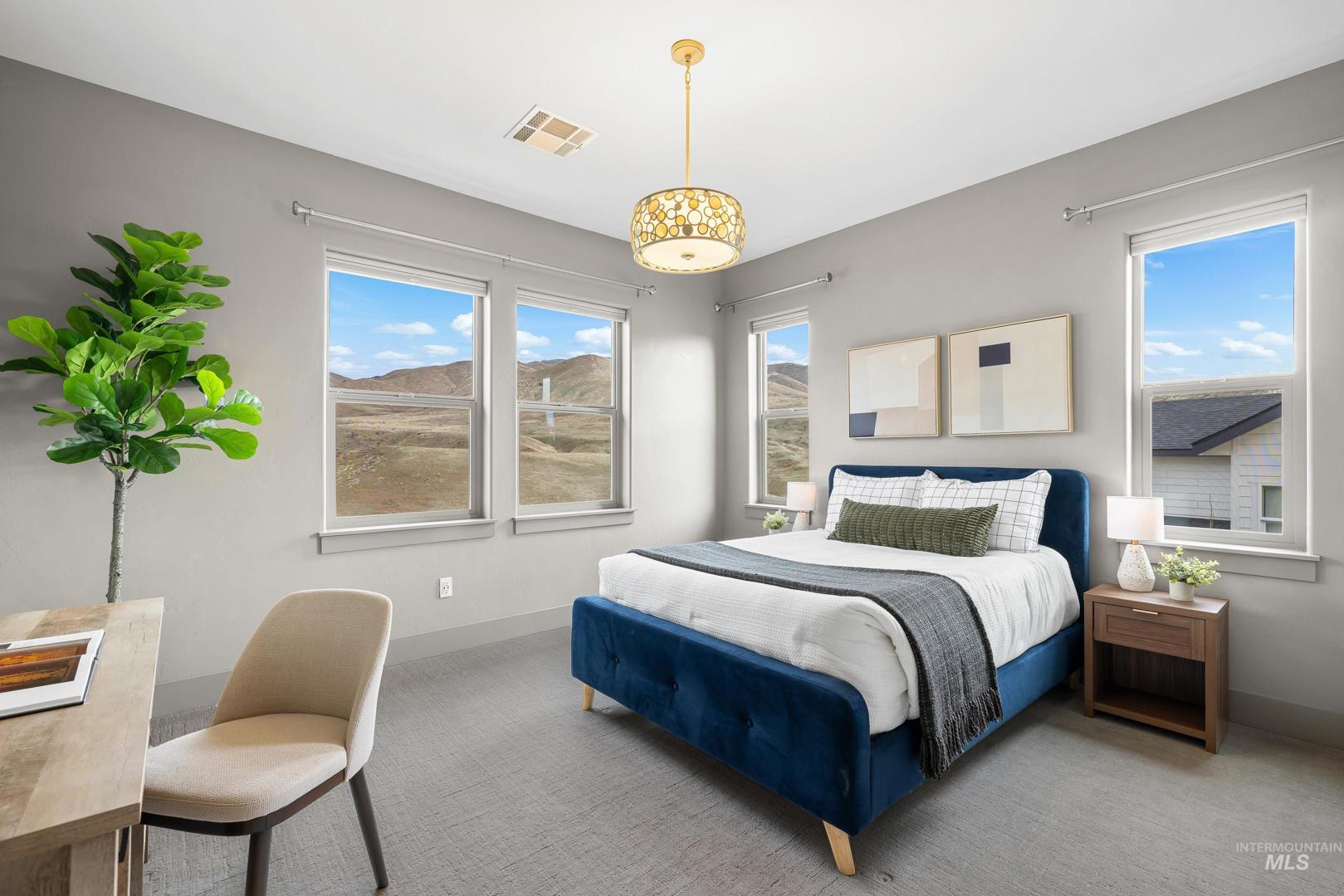 Nestled against the rolling Boise foothills in beautiful Harris North, this modern masterpiece offers mesmerizing views creating the ideal backdrop for entertaining and relaxing in style. An unparalleled level of craftsmanship is highlighted by the ideal blend of rich hardwoods, modern fixtures and high-end custom details at every turn. Stunning chef`s kitchen boasts upgraded appliance package including double oven, gas range, a walk-in pantry, and expansive island overlooking the great room anchored by a warm, gas fireplace. Thoughtfully designed main level features a private guest suite with attached full bathroom and a dedicated office with access to the patio for an elevated work from home experience! Wake to idyllic foothill views in the secluded master reminiscent of a luxurious day spa with dual vanities, lavish soaker tub, and tiled shower. Two generous bedrooms plus a loft complete the second level offering ample space for everyone. Enjoy al-fresco dining beneath a charming pergola or on the extended covered patio shaded by automatic sunshades for year-round enjoyment of the rolling topography. Meticulous landscaping including lush, green grass, concrete curbing and garden boxes, completes the impressive backyard retreat. Three car garage with epoxy floors is the perfect spot for storing toys or use as a workshop with a mini split for added comfort in the single bay!