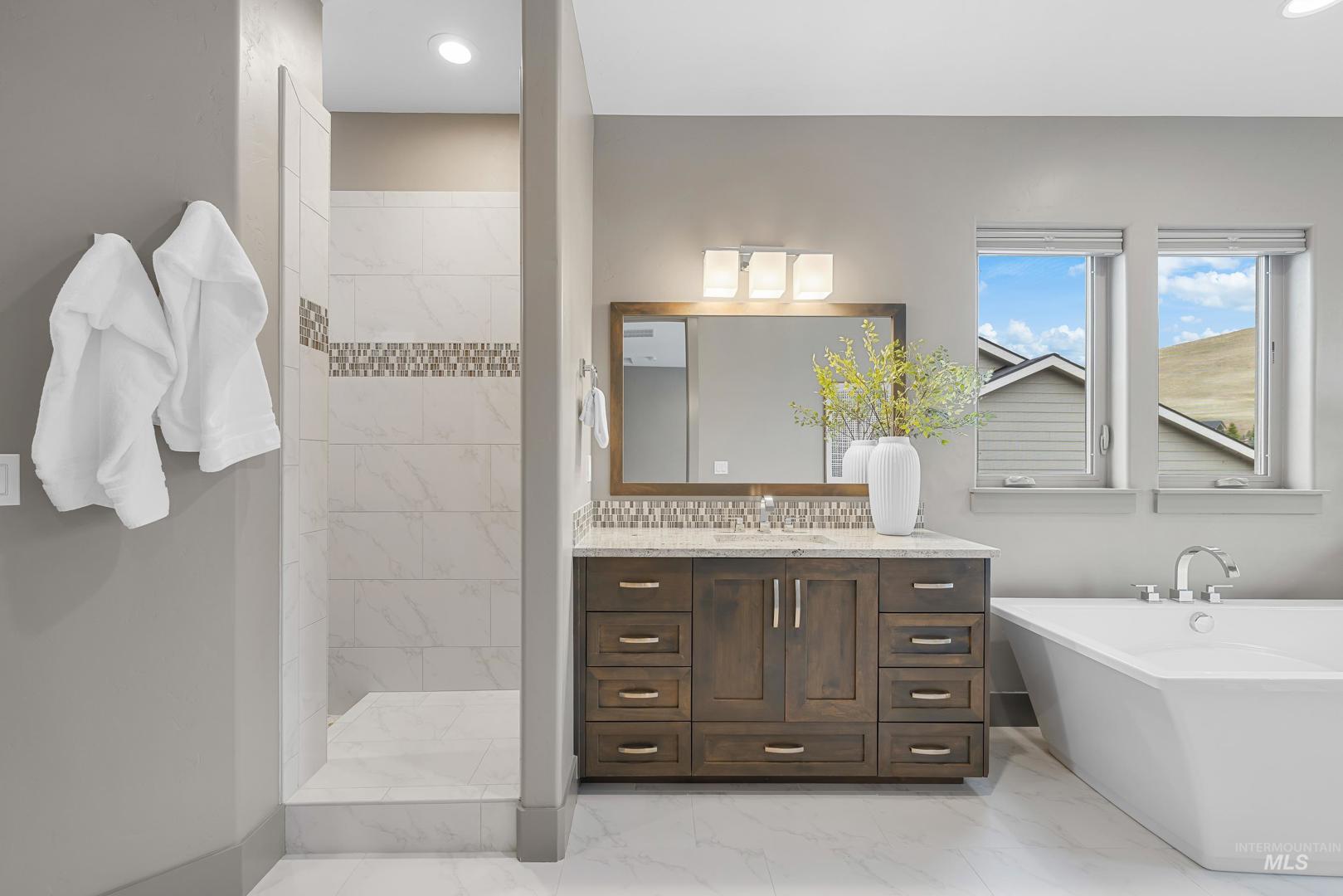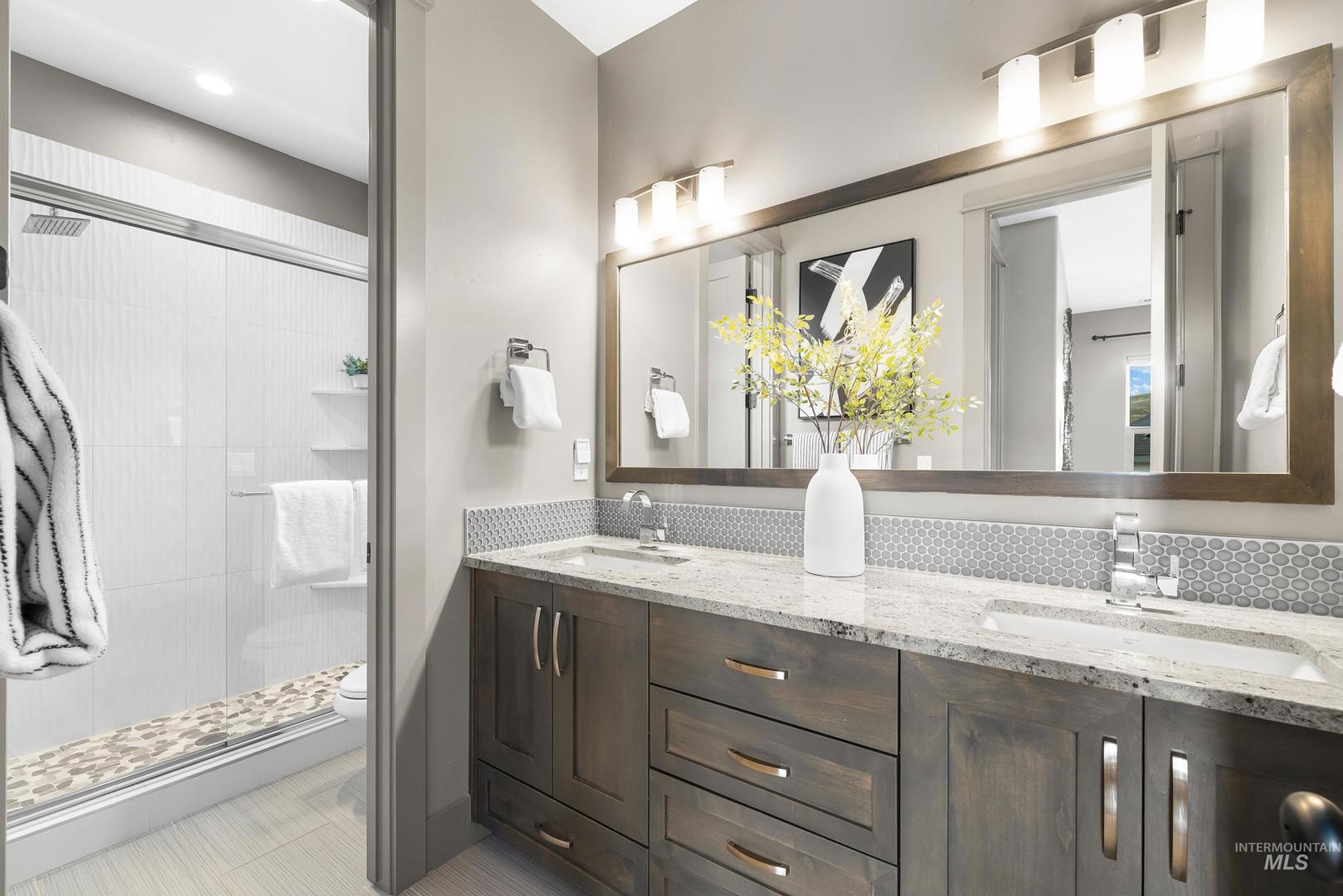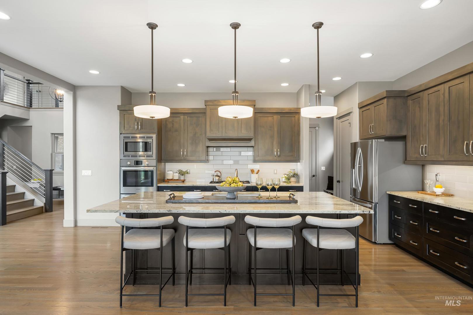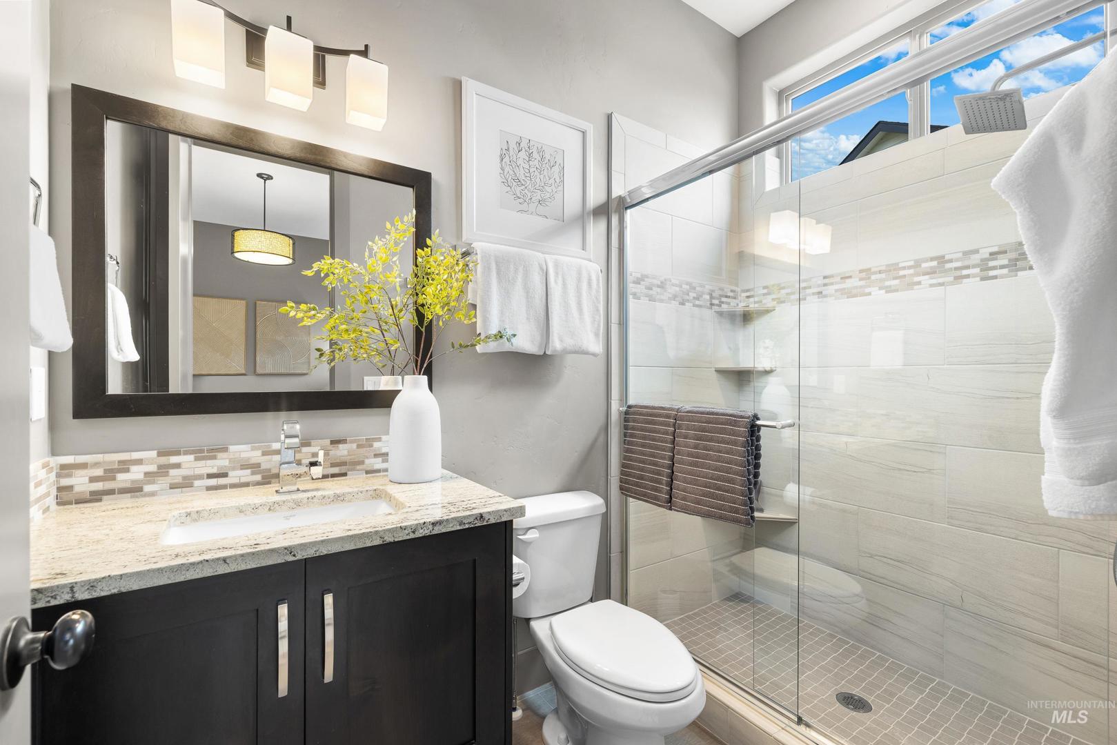 Nestled against the rolling Boise foothills in beautiful Harris North, this modern masterpiece offers mesmerizing views creating the ideal backdrop for entertaining and relaxing in style. An unparalleled level of craftsmanship is highlighted by the ideal blend of rich hardwoods, modern fixtures and high-end custom details at every turn. Stunning chef`s kitchen boasts upgraded appliance package including double oven, gas range, a walk-in pantry, and expansive island overlooking the great room anchored by a warm, gas fireplace. Thoughtfully designed main level features a private guest suite with attached full bathroom and a dedicated office with access to the patio for an elevated work from home experience! Wake to idyllic foothill views in the secluded master reminiscent of a luxurious day spa with dual vanities, lavish soaker tub, and tiled shower. Two generous bedrooms plus a loft complete the second level offering ample space for everyone. Enjoy al-fresco dining beneath a charming pergola or on the extended covered patio shaded by automatic sunshades for year-round enjoyment of the rolling topography. Meticulous landscaping including lush, green grass, concrete curbing and garden boxes, completes the impressive backyard retreat. Three car garage with epoxy floors is the perfect spot for storing toys or use as a workshop with a mini split for added comfort in the single bay!