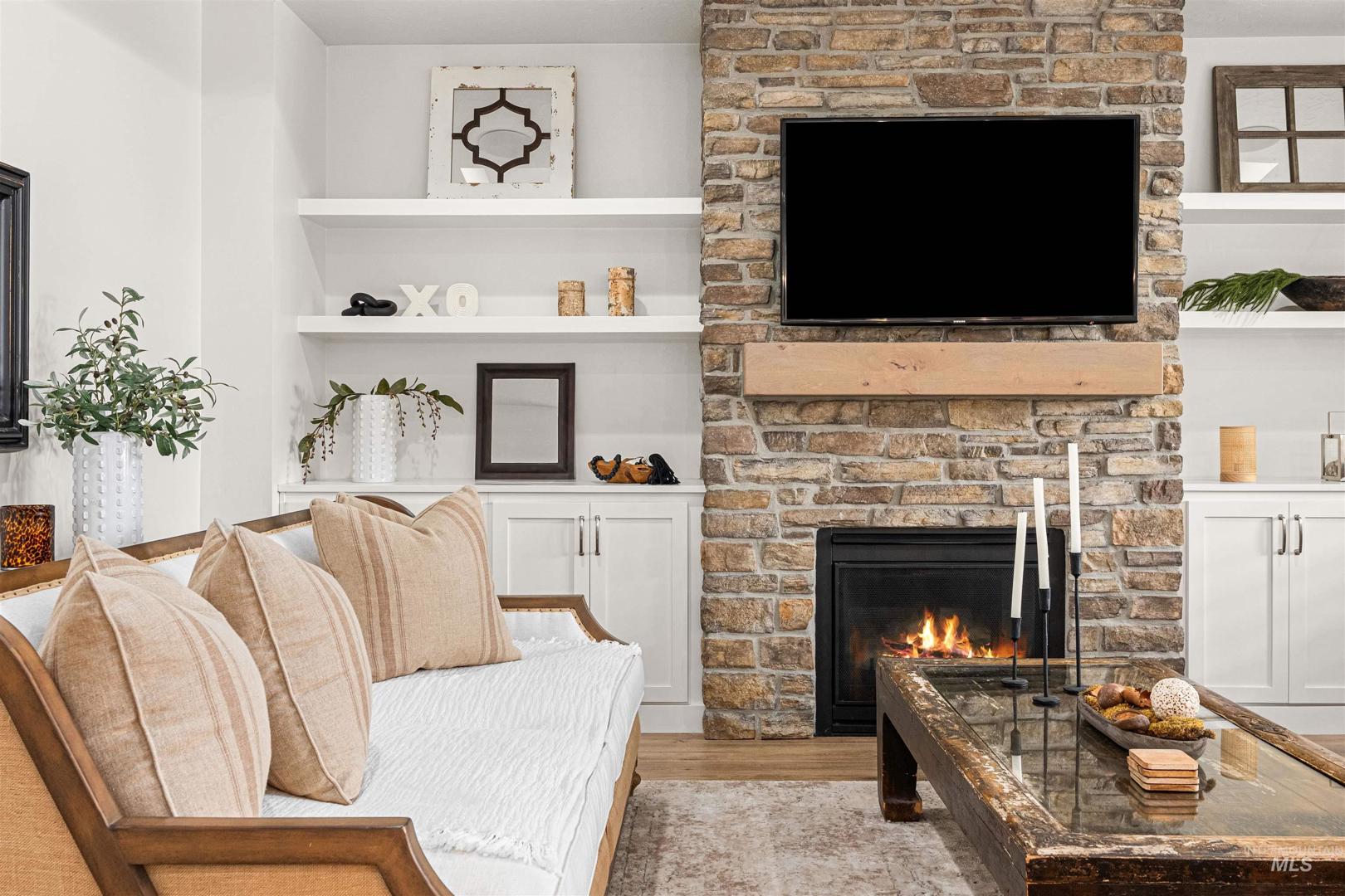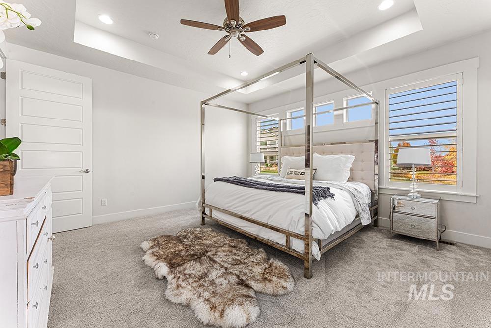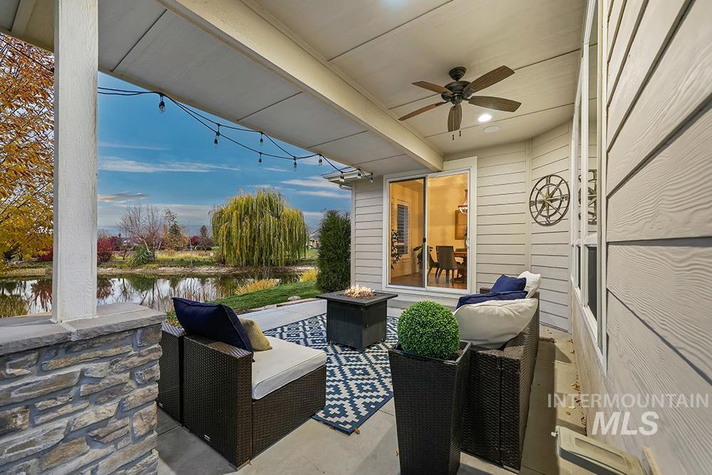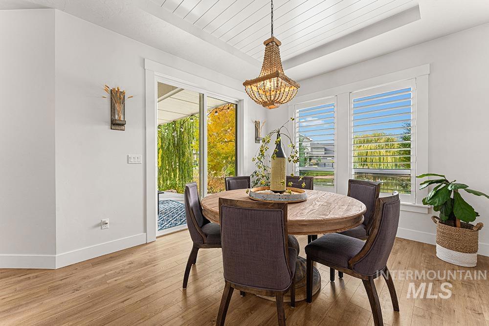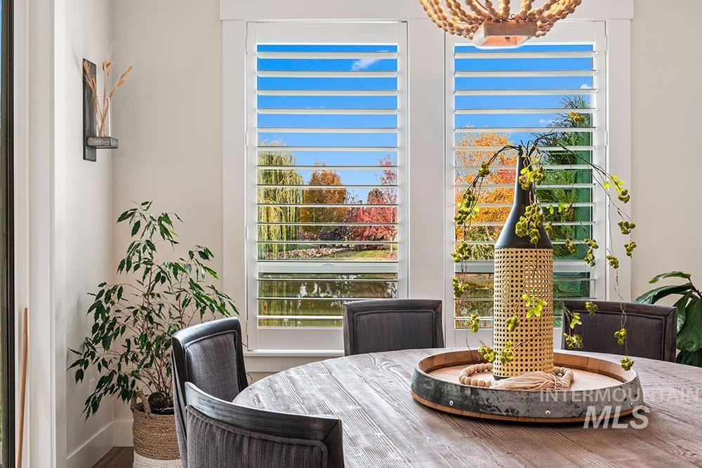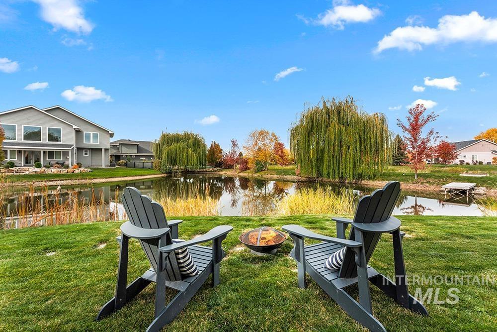Tucked at the end of a quiet cul-de-sac in Eagle’s Foxglove Estates, this waterfront residence feels like a private retreat – modern yet warm, sophisticated yet serene. Built in 2018 and meticulously maintained, the home offers like-new construction, main-level living, and a large RV bay. Soft, organic design elements blend crisp white walls and natural light with warm wood tones and stone accents, creating a seamless connection between the home and its tranquil surroundings. An inviting entry opens to a spacious great room with tall ceilings, rich wood floors, and abundant windows framing the water. A stone fireplace with built-ins anchors the space, while a tray ceiling with beam detail adds architectural depth. The chef’s kitchen pairs style with function, featuring floor-to-ceiling cabinetry, stainless steel appliances, quartz countertops, a wood-accent island, and a walk-in pantry. The dining area, with its shiplap ceiling, beaded chandelier, and patio access, invites effortless indoor-outdoor living. The main-level primary suite is a peaceful retreat with serene water views, tray ceiling detail, and a spa-inspired bath complete with soaking tub, dual vanities, walk-in shower, and generous closet. Upstairs, three additional bedrooms and a full bath offer versatile space for guests or hobbies.