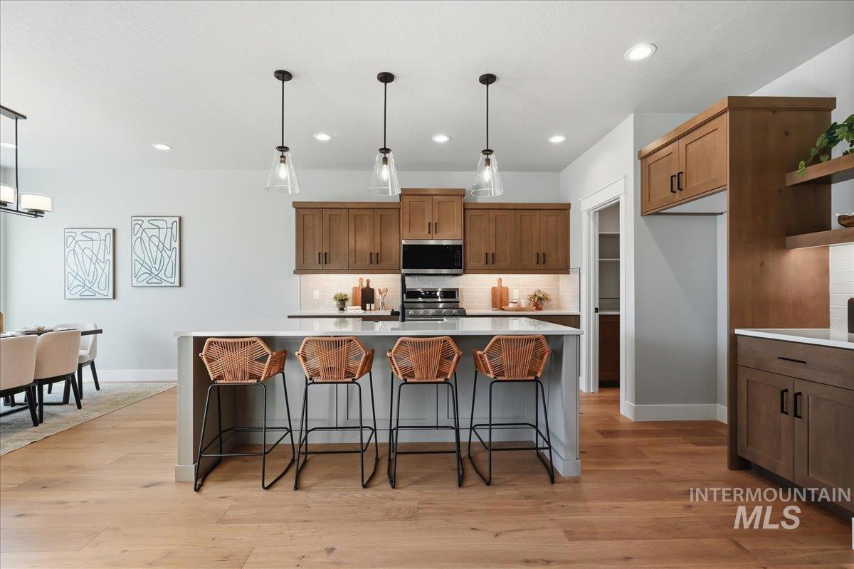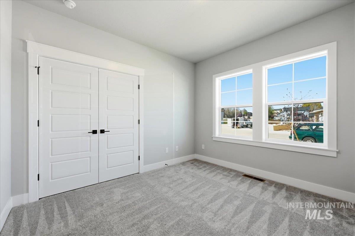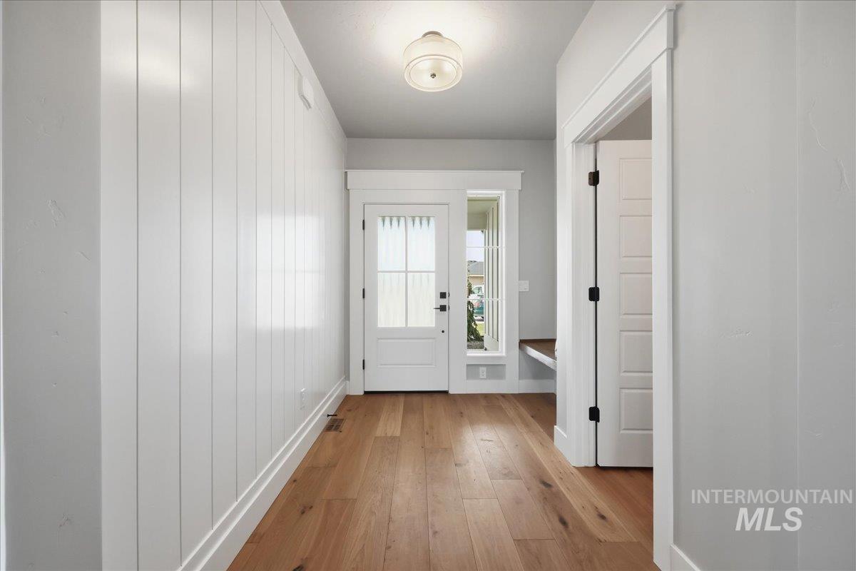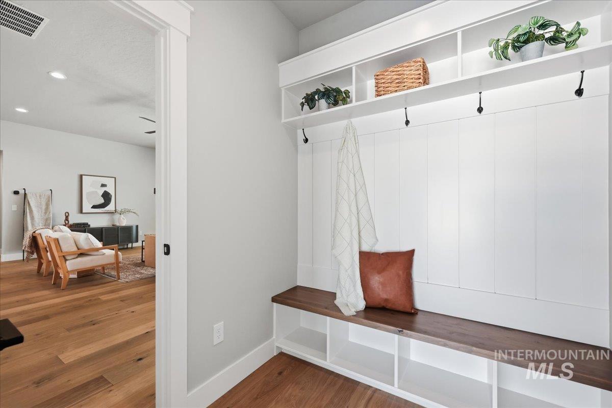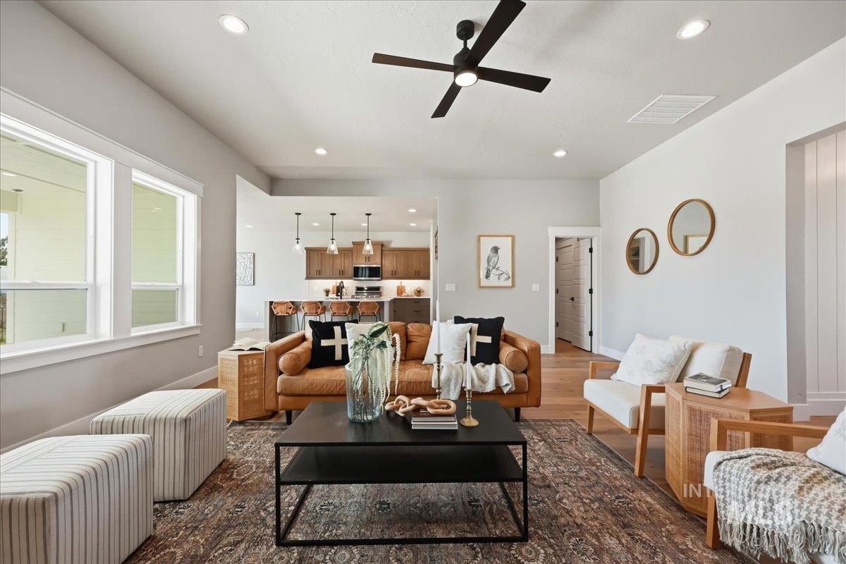 Single-level living meets upscale comfort in the desirable new community of The Mill. This thoughtfully designed 3-bedroom, 2.5-bath home offers the perfect blend of country charm and modern finishes. A welcoming front elevation features a spacious covered patio, setting the tone for the warmth found throughout. Step inside to a wide entry accented with wainscoting and a convenient built-in bench. The open-concept great room is filled with large windows and anchored by a beautiful stone fireplace—ideal for both relaxing and entertaining. The stylish kitchen is a standout, complete with quartz countertops, a double oven/gas cooktop, and KitchenAid appliances. The oversized pantry is a must-see, featuring abundant storage, a dedicated coffee bar, and direct access to the mudroom and garage. The private primary suite offers direct patio access and a spa-like bathroom with dual vanities, a soaker tub, and a walk-in shower. Secondary spaces are equally well-appointed, including a guest bath with a walk-in shower and a generously sized laundry room. The covered back patio provides plenty of room for outdoor gatherings, while the epoxy-coated garage floors add durability and polish. Enjoy life in The Mill at Middleton with access to a greenbelt pathway, nearby parks, the Boise River/Greenbelt, shopping, and nearby freeway access. Experience elevated living in Middleton’s newest community.