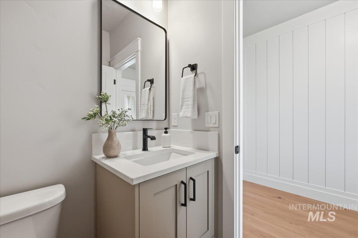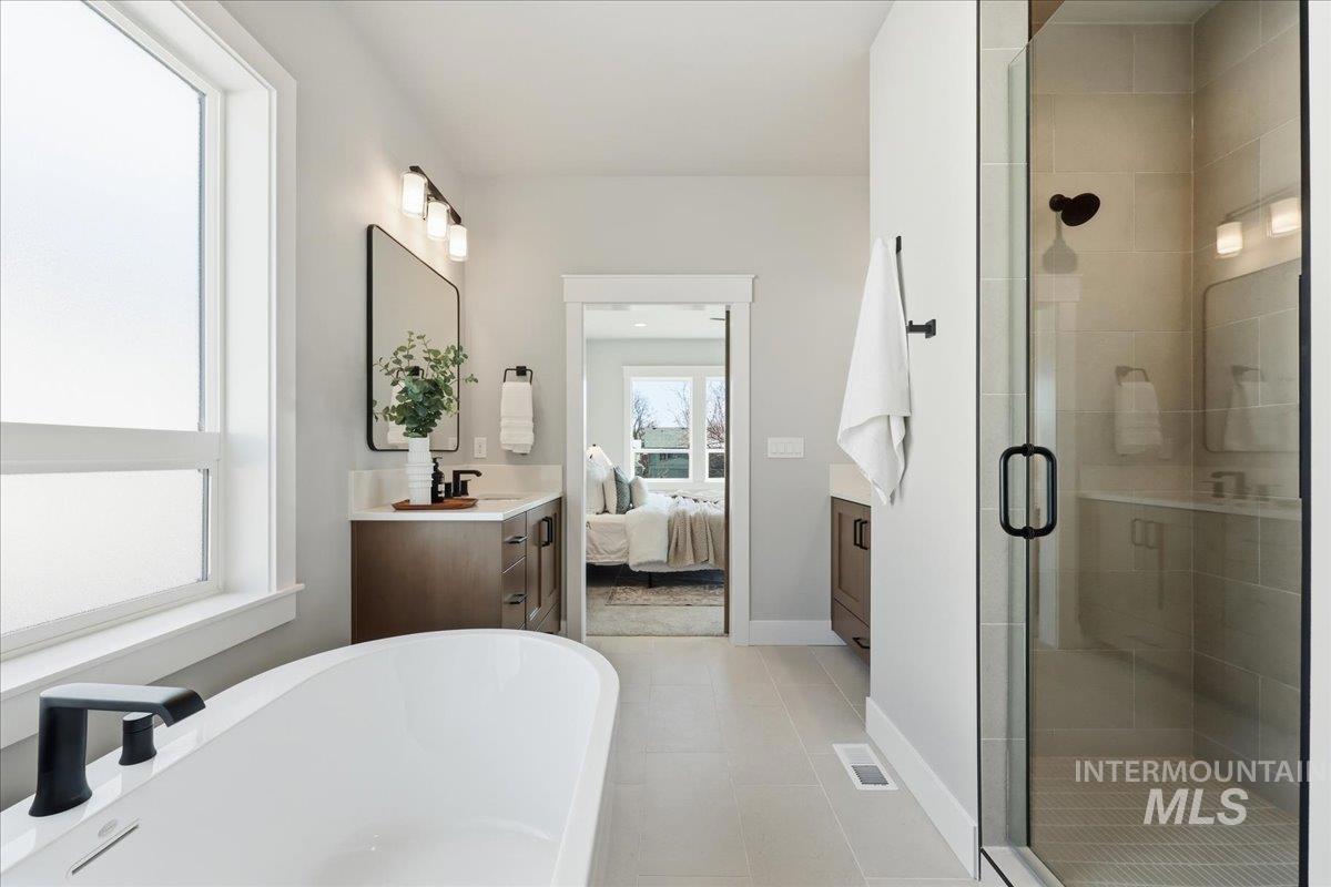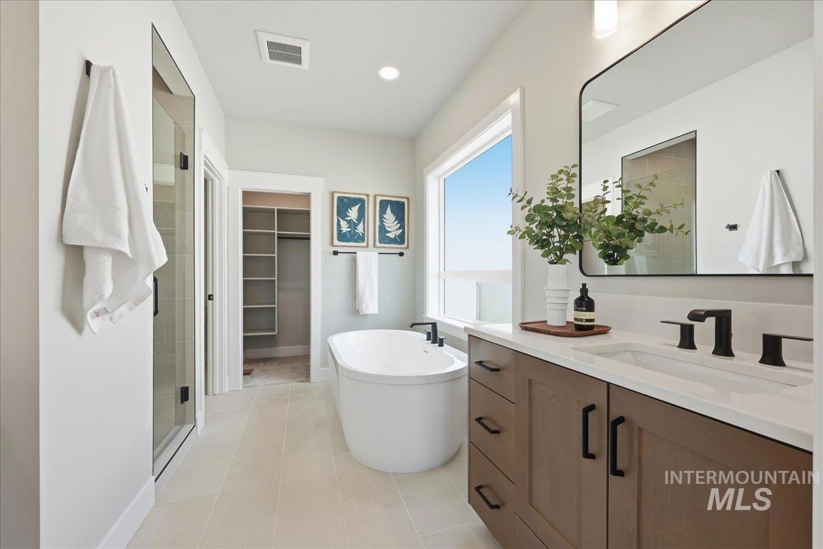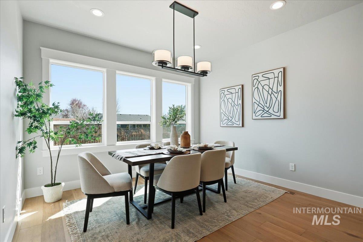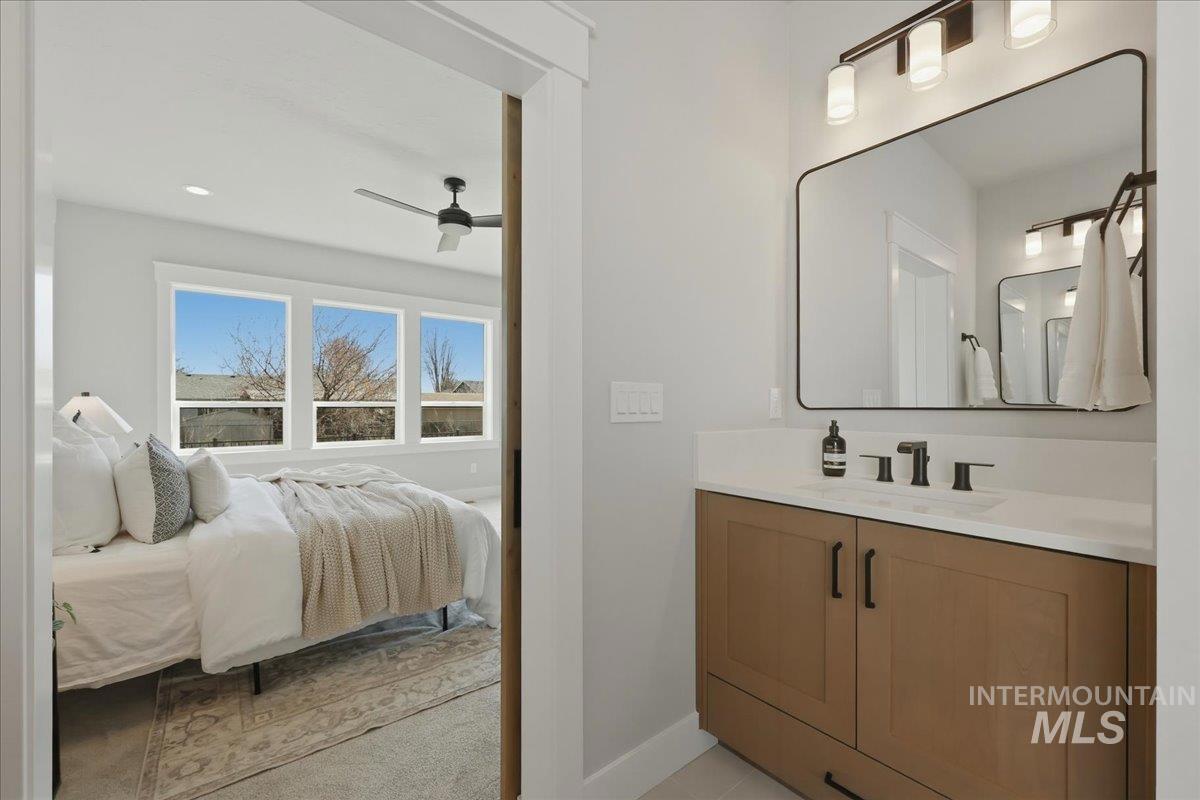 Single-level living meets upscale comfort in the desirable new community of The Mill. This thoughtfully designed 3-bedroom, 2.5-bath home offers the perfect blend of country charm and modern finishes. A welcoming front elevation features a spacious covered patio, setting the tone for the warmth found throughout. Step inside to a wide entry accented with wainscoting and a convenient built-in bench. The open-concept great room is filled with large windows and anchored by a beautiful stone fireplace—ideal for both relaxing and entertaining. The stylish kitchen is a standout, complete with quartz countertops, a double oven/gas cooktop, and KitchenAid appliances. The oversized pantry is a must-see, featuring abundant storage, a dedicated coffee bar, and direct access to the mudroom and garage. The private primary suite offers direct patio access and a spa-like bathroom with dual vanities, a soaker tub, and a walk-in shower. Secondary spaces are equally well-appointed, including a guest bath with a walk-in shower and a generously sized laundry room. The covered back patio provides plenty of room for outdoor gatherings, while the epoxy-coated garage floors add durability and polish. Enjoy life in The Mill at Middleton with access to a greenbelt pathway, nearby parks, the Boise River/Greenbelt, shopping, and nearby freeway access. Experience elevated living in Middleton’s newest community.
