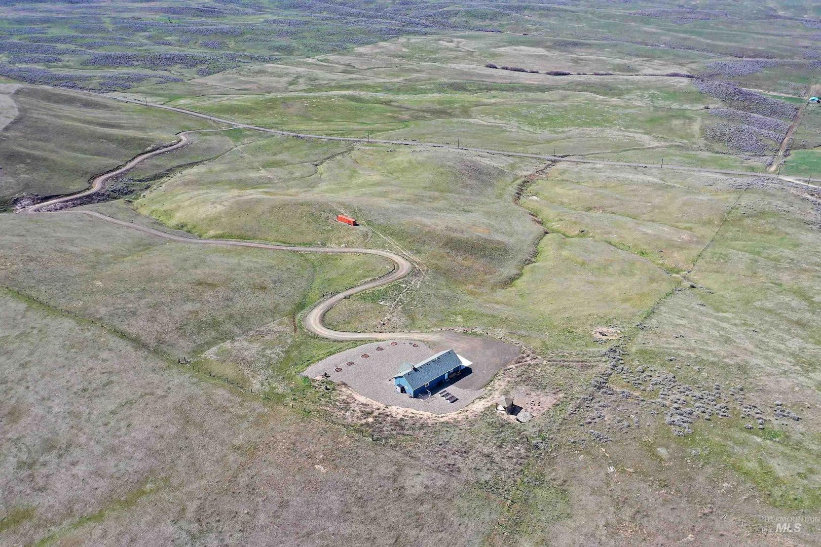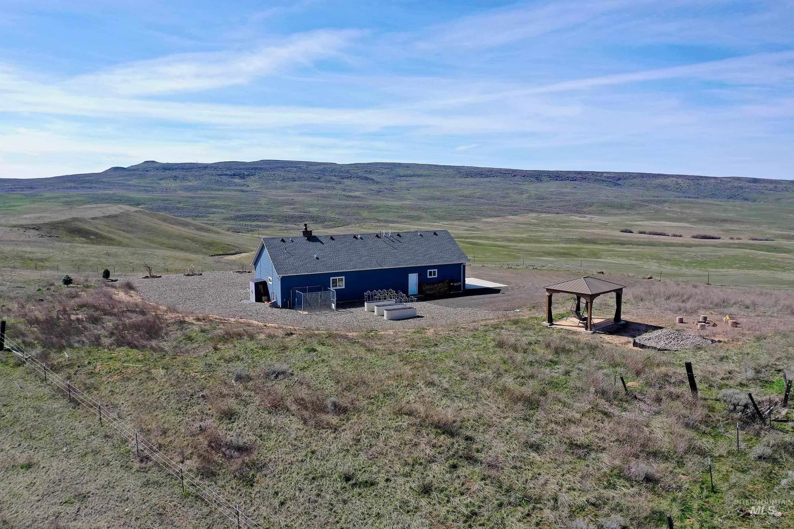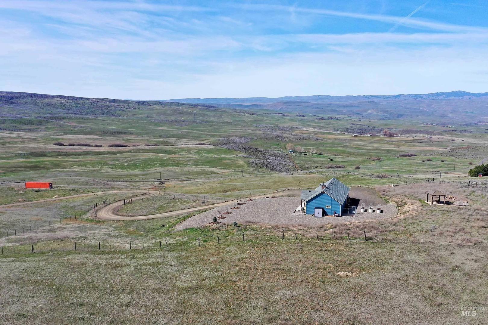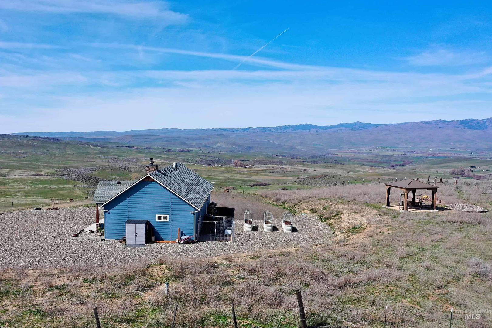 Turn-Key Property with the privacy and tranquility you crave! Built in 2022, this thoughtfully designed home has 2 bedrooms, 2 bathrooms, and 988 square feet of custom features. Located on 100 acres of rolling hills/rangeland grazing ground just 10 minutes from Midvale. Inside find quartz countertops, stainless steel appliances, and gas range with 2 ovens. Custom cabinetry with lazy susan, pull-out drawers, soft close cabinet doors and drawers, spice rack, paper towel dispenser, kick drawers, and adjustable shelving. Plus walk-in pantry. Primary bedroom/bathroom ensuite with walk-in tiled shower with bench seat, dual vanities, and walk-in closet. Soaking tub in second bathroom for spa-like relaxation. And don`t forget the INFRARED SAUNA in the garage! Fully finished garage with custom flooring. Need more space? Just add on to the existing home or build a detached garage/shop. Private well produces 12 gallons per minute, providing ample water to the home, grounds, and stock tank for 50+ head of cattle. Includes RV septic dump with 30-amp RV hookup. Perimeter fencing around entire property, plus separate fencing and gate around the home. Screened in gazebo with power in conduit to corner for future hot tub. NO CCRs, NO HOA, NO easements! Only 30 minutes to Weiser for groceries, hardware store. Less than an hour to Ontario for sales tax free shopping -Walmart, Home Depot, D &B, etc.