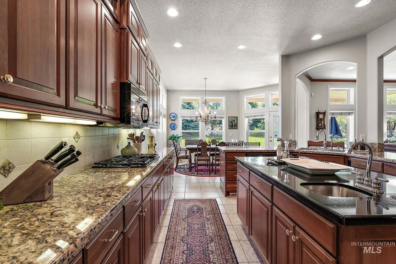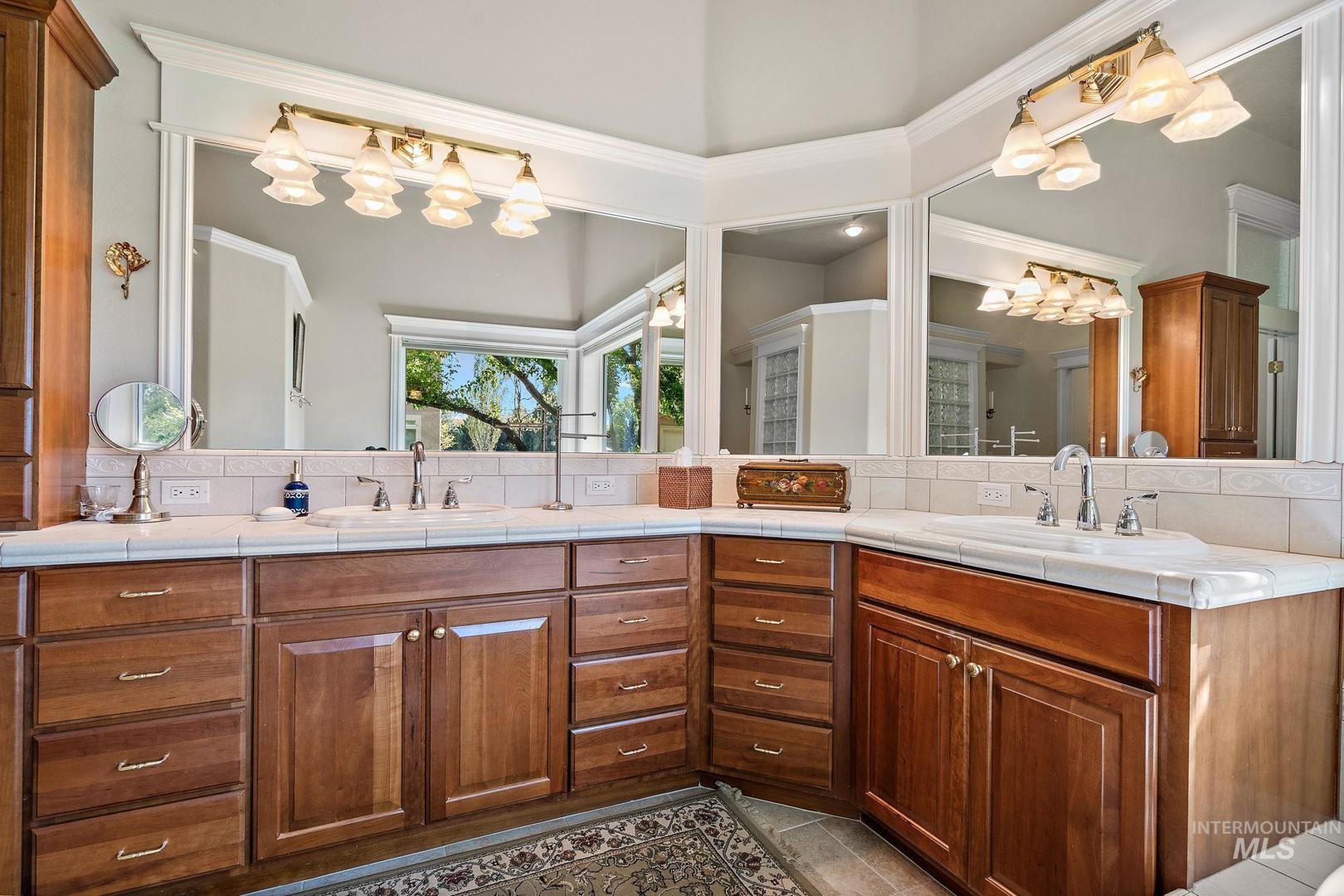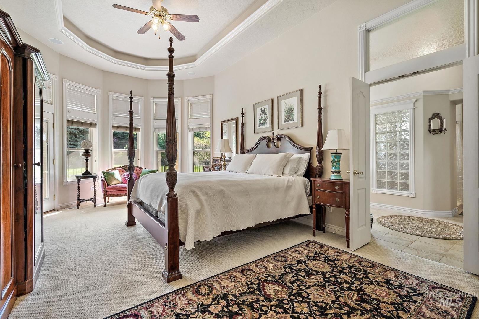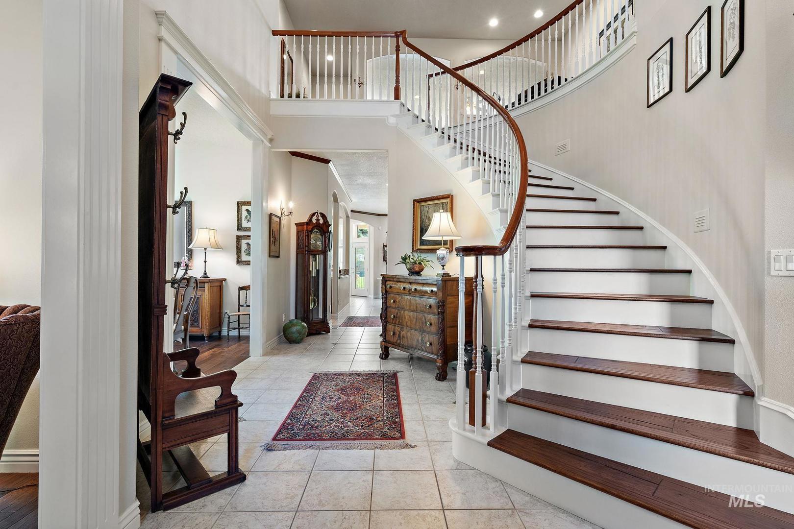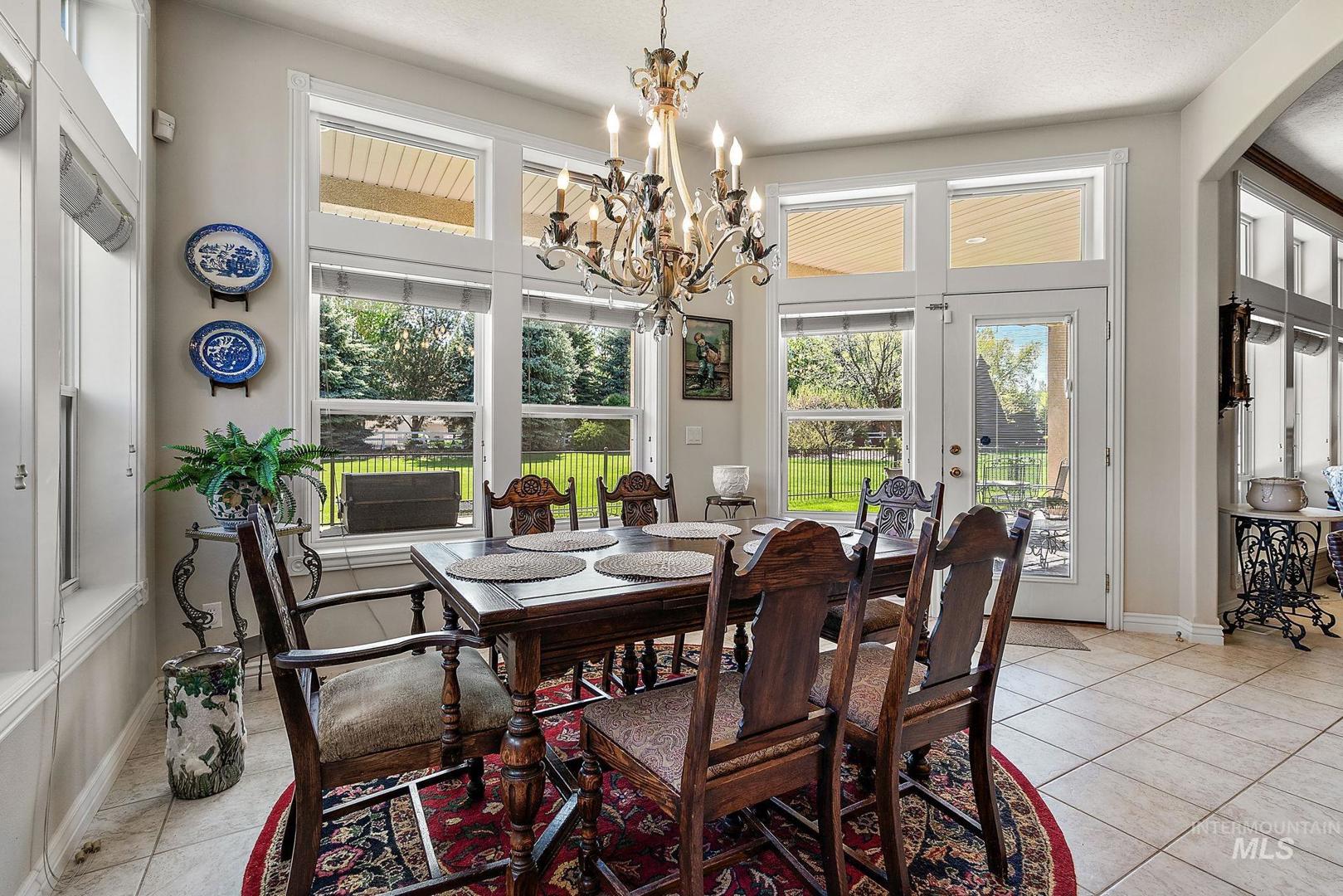 Exceptional one-acre estate in Eagle’s highly desirable Castlebury neighborhood. This stunning home offers 5 bedrooms, 4 baths, and a main-level executive office that could easily serve as a 6th bedroom. The gourmet kitchen boasts a granite island with prep sink and storage, double oven, 5-burner cooktop, and generous pantry, flowing seamlessly into the sun-drenched eating area and formal dining room—perfect for family meals or entertaining. The main-level master suite is a true retreat with a coffered lit ceiling, wine cooler, jetted tub, dual vanity, walk-in shower, wall of windows, and private patio access. Enjoy gatherings in the great room with fireplace and built-in cherry wood wall, host movie nights in the theater room, or relax in the bonus room with wet bar. Outdoor living offers a huge covered patio, mature landscaping, invisible fence, and ample space for a pool or RV bay. Additional highlights include a security system, 1,036 sq. ft. 4-car garage with abundant storage, surround sound throughout, RV parking with 220V hookup, upgraded trim, arched doors, elegant tile, new carpet and hardwood, central vacuum, and abundant natural light. Recently updated with a brand-new 50-year roof in May 2025. Close to the Greenbelt, Costco, and top dining and shopping—this home offers unparalleled luxury, space, and lifestyle in one of Eagle’s most sought after neighborhoods. BTVAI