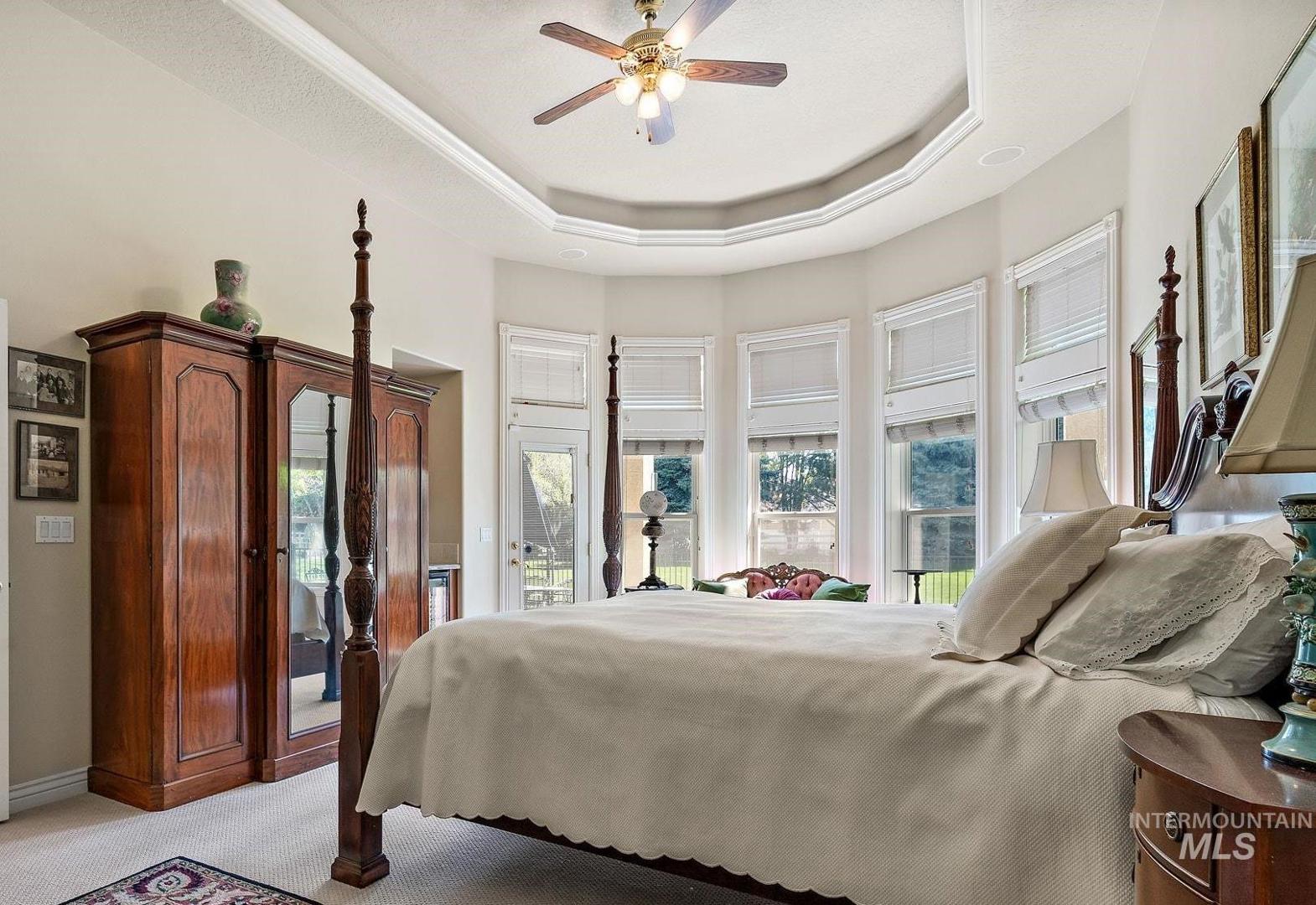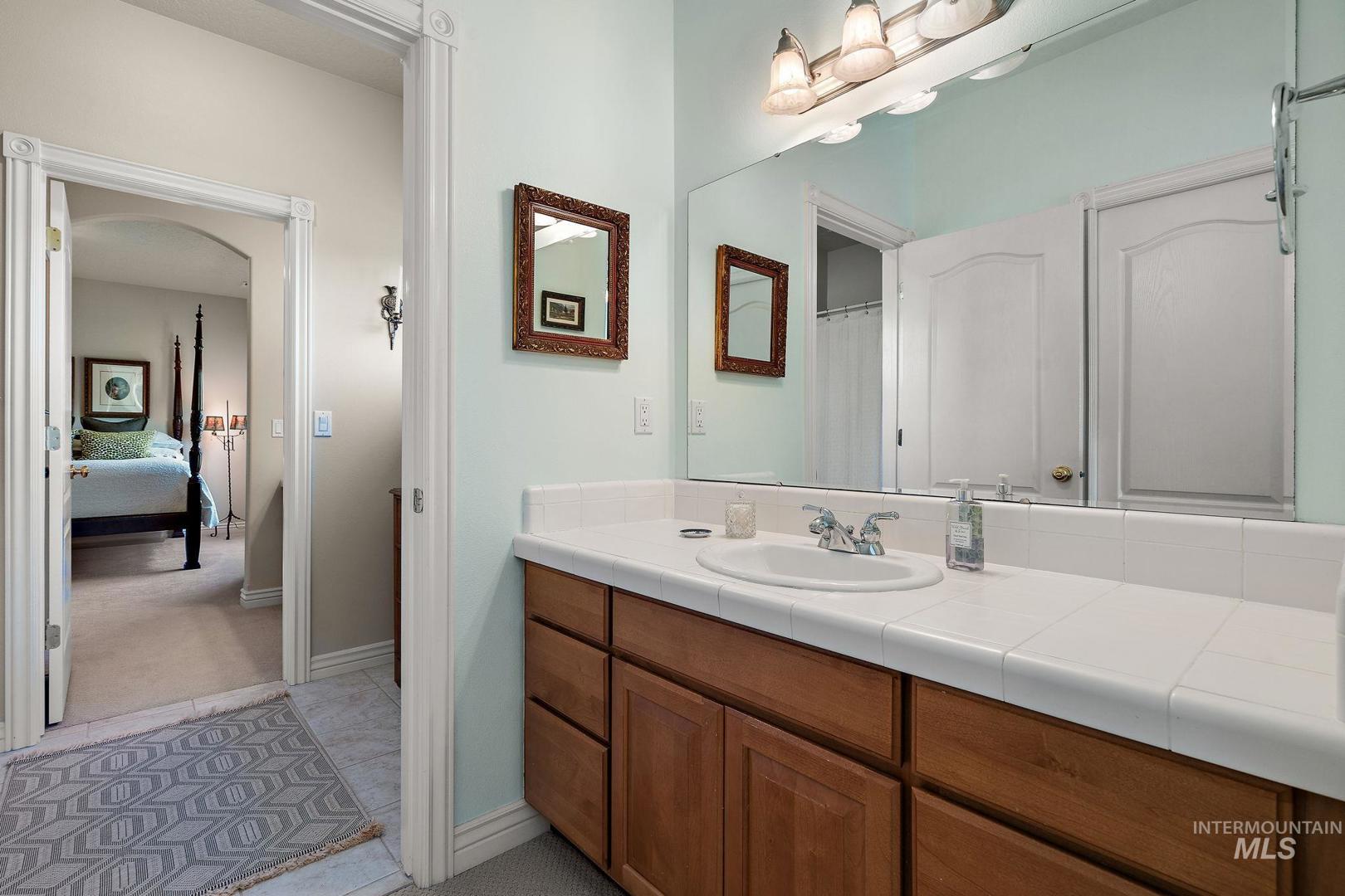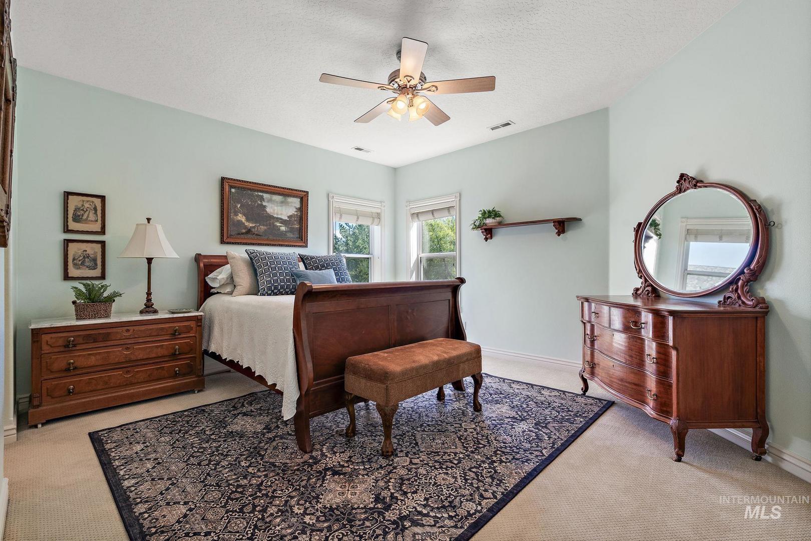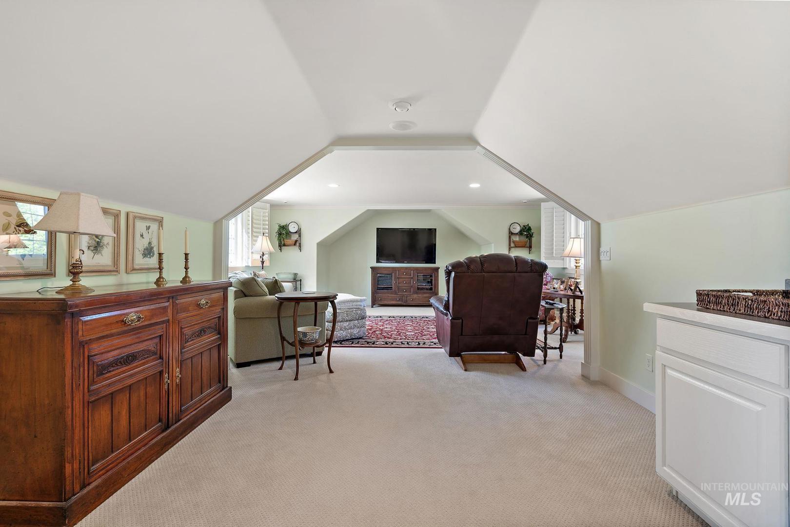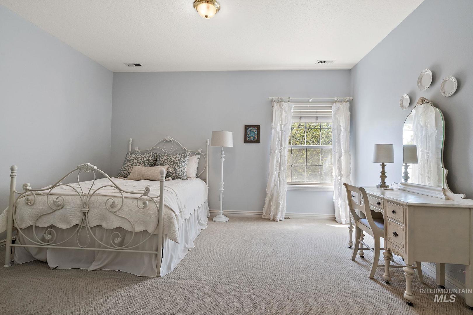 Exceptional one-acre estate in Eagle’s highly desirable Castlebury neighborhood. This stunning home offers 5 bedrooms, 4 baths, and a main-level executive office that could easily serve as a 6th bedroom. The gourmet kitchen boasts a granite island with prep sink and storage, double oven, 5-burner cooktop, and generous pantry, flowing seamlessly into the sun-drenched eating area and formal dining room—perfect for family meals or entertaining. The main-level master suite is a true retreat with a coffered lit ceiling, wine cooler, jetted tub, dual vanity, walk-in shower, wall of windows, and private patio access. Enjoy gatherings in the great room with fireplace and built-in cherry wood wall, host movie nights in the theater room, or relax in the bonus room with wet bar. Outdoor living offers a huge covered patio, mature landscaping, invisible fence, and ample space for a pool or RV bay. Additional highlights include a security system, 1,036 sq. ft. 4-car garage with abundant storage, surround sound throughout, RV parking with 220V hookup, upgraded trim, arched doors, elegant tile, new carpet and hardwood, central vacuum, and abundant natural light. Recently updated with a brand-new 50-year roof in May 2025. Close to the Greenbelt, Costco, and top dining and shopping—this home offers unparalleled luxury, space, and lifestyle in one of Eagle’s most sought after neighborhoods. BTVAI