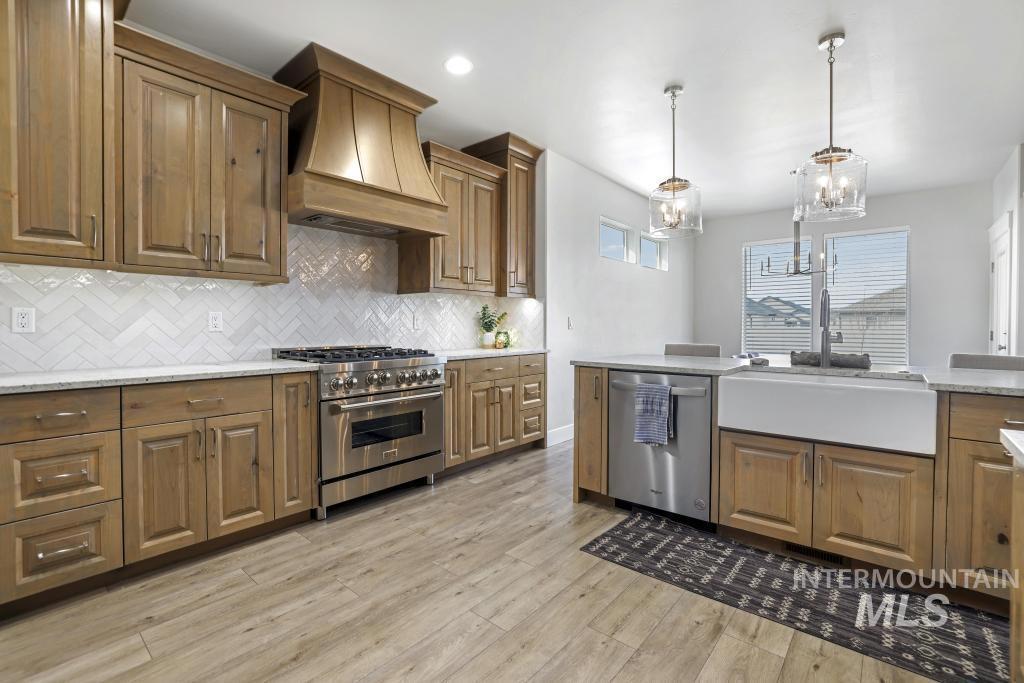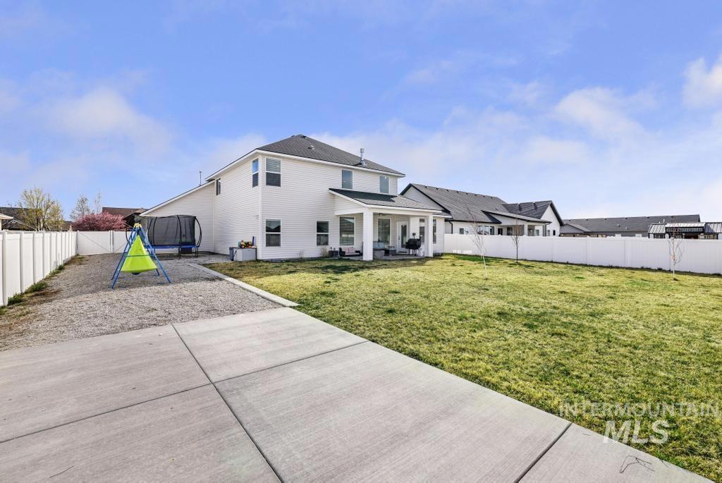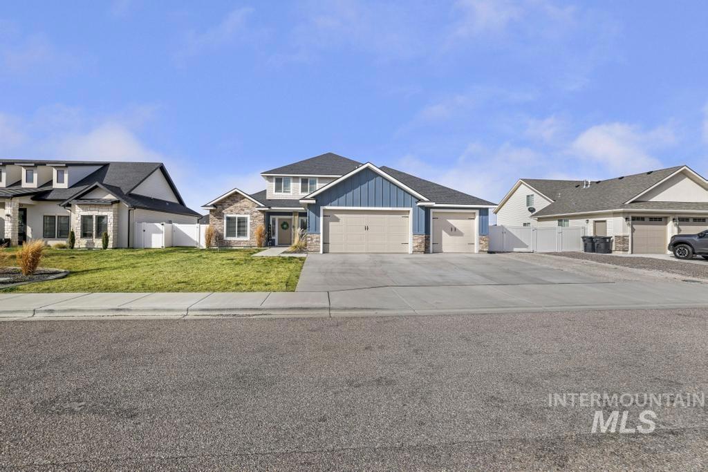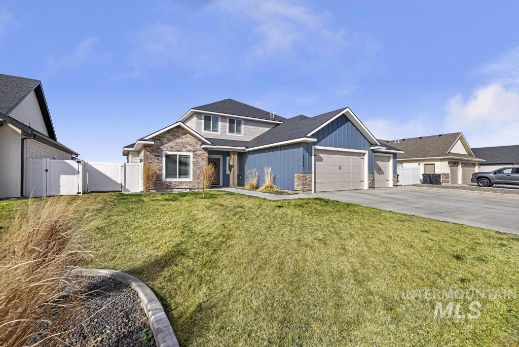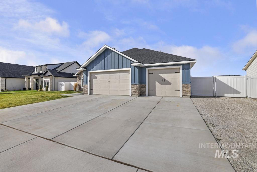 A home where thoughtful design meets elevated comfort. At the center, the kitchen is both striking and functional. Featuring leathered granite countertops, a gas range, a farmhouse sink, expansive prep space, and abundant storage, complemented by a beautifully finished pantry with butcher block detail. The layout is intentionally designed with a split-bedroom floor plan, offering a private and spacious main suite set apart for a true retreat. Skip the half bath in the hallway! This home offers a full third bath on the main level, ideal for guests. The nursery easily converts to a guest room with convenient access to the full hallway bath. In the living area, a stunning fireplace creates a warm, sophisticated focal point which is perfect for both quiet evenings or gathering with guests. The entire home is wired with Cat 6 delivering seamless, high-speed connectivity throughout. Outside, the property continues to impress. The fully automated sprinkler system keeps the grounds effortlessly maintained, while RV parking provides added versatility. The backyard offers an expansive setting with room to create your ideal outdoor living space under the covered patio. There is also a 14x25 concrete pad already in place for a future shed or shop. Designed with intention and finished with quality, this home offers a level of comfort and functionality that’s hard to find.