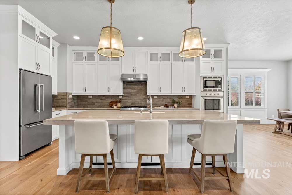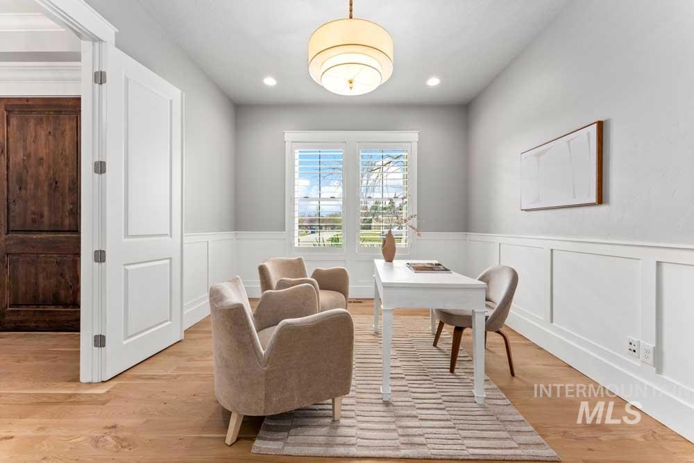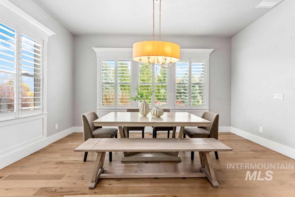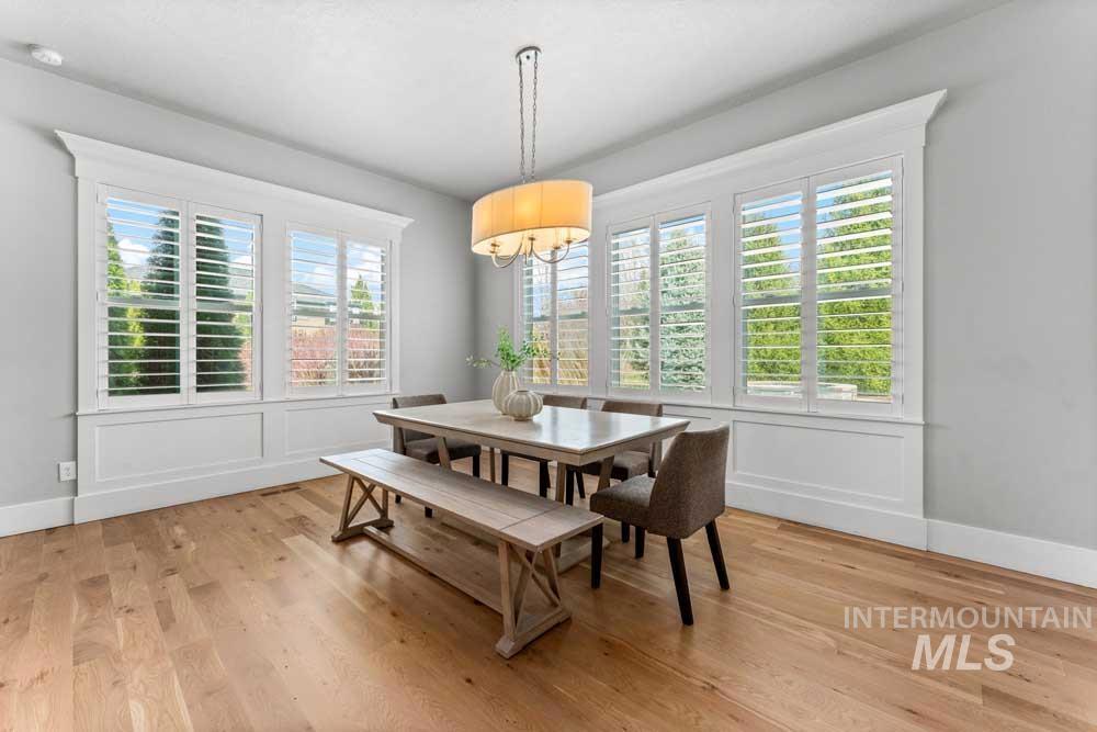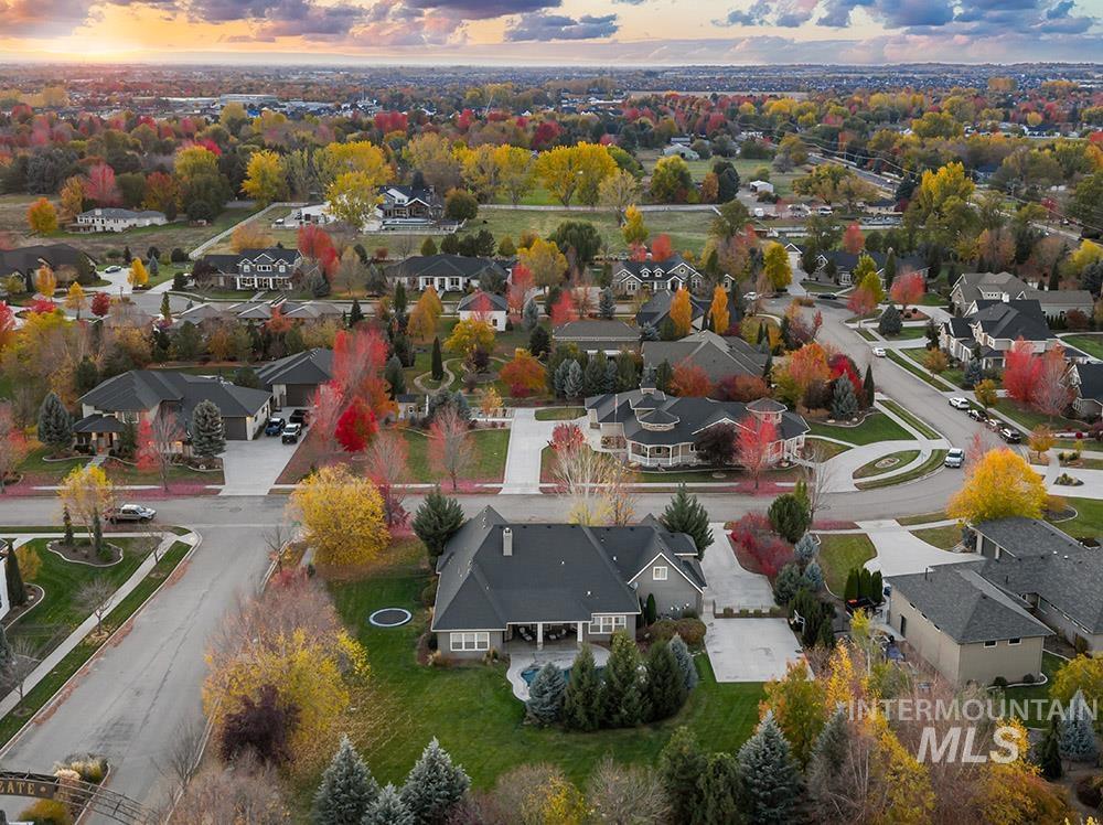 Stunning single-level home on a sprawling 0.87-acre corner lot in the exclusive Lionsgate community—an intimate enclave of just 25 estate-sized homes. Recent updates include new AC, furnace, water heater, pool equipment, and refinished hardwood floors. Designed for luxury living and effortless entertaining, the manicured grounds offer a true backyard oasis with a resort-style pool and hot tub, built-in firepit, in-ground trampoline, and sports court or RV pad. Inside, the open-concept great room features a striking stacked-stone fireplace and expansive sliding doors that seamlessly blend indoor and outdoor living. The gourmet kitchen impresses with quartz countertops, ceiling-height custom cabinetry, premium stainless steel appliances, and a spacious walk-in pantry. The private primary suite occupies its own wing with tray ceilings and a spa-inspired ensuite, complete with dual vanities, a freestanding soaking tub, tiled walk-in shower, and an expansive dressing room. A main-level office adds convenience, while an upper bonus room provides flexible space for guests or recreation. Ideally located just minutes from downtown Eagle, premier golf courses, shopping, and dining!
