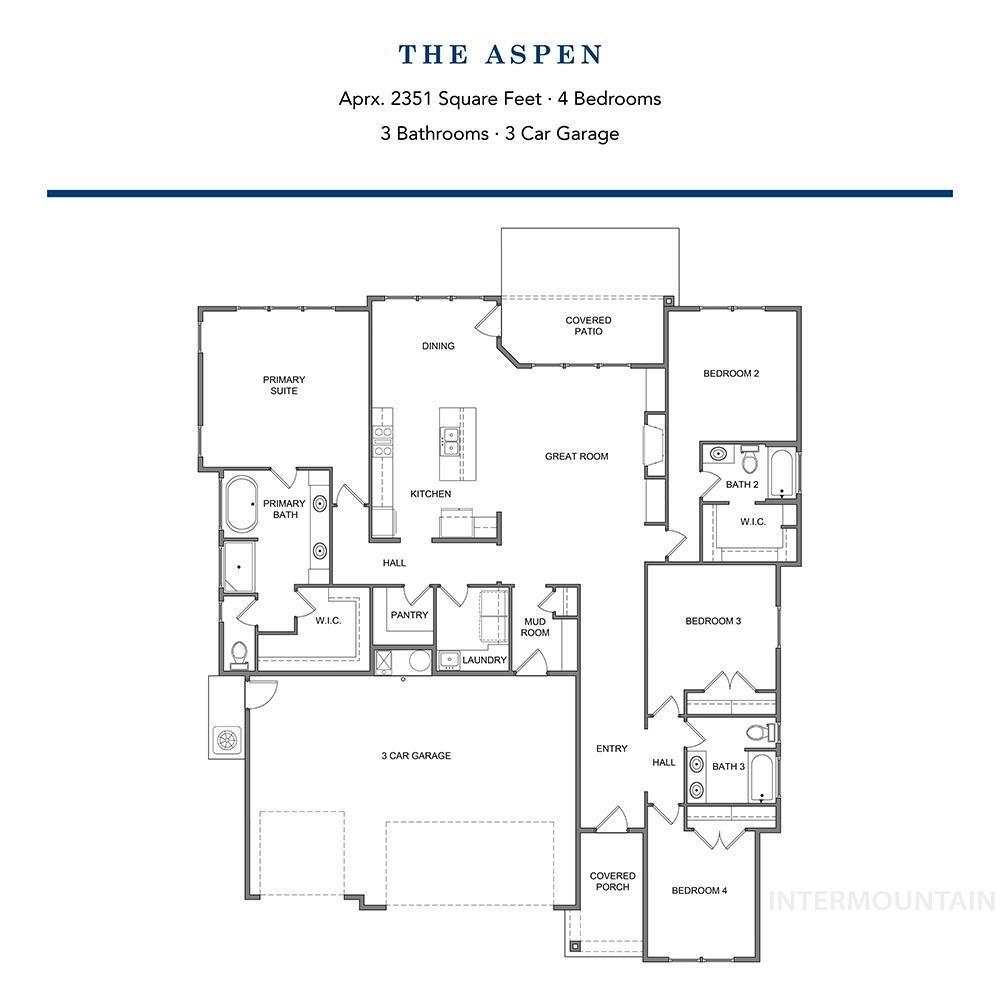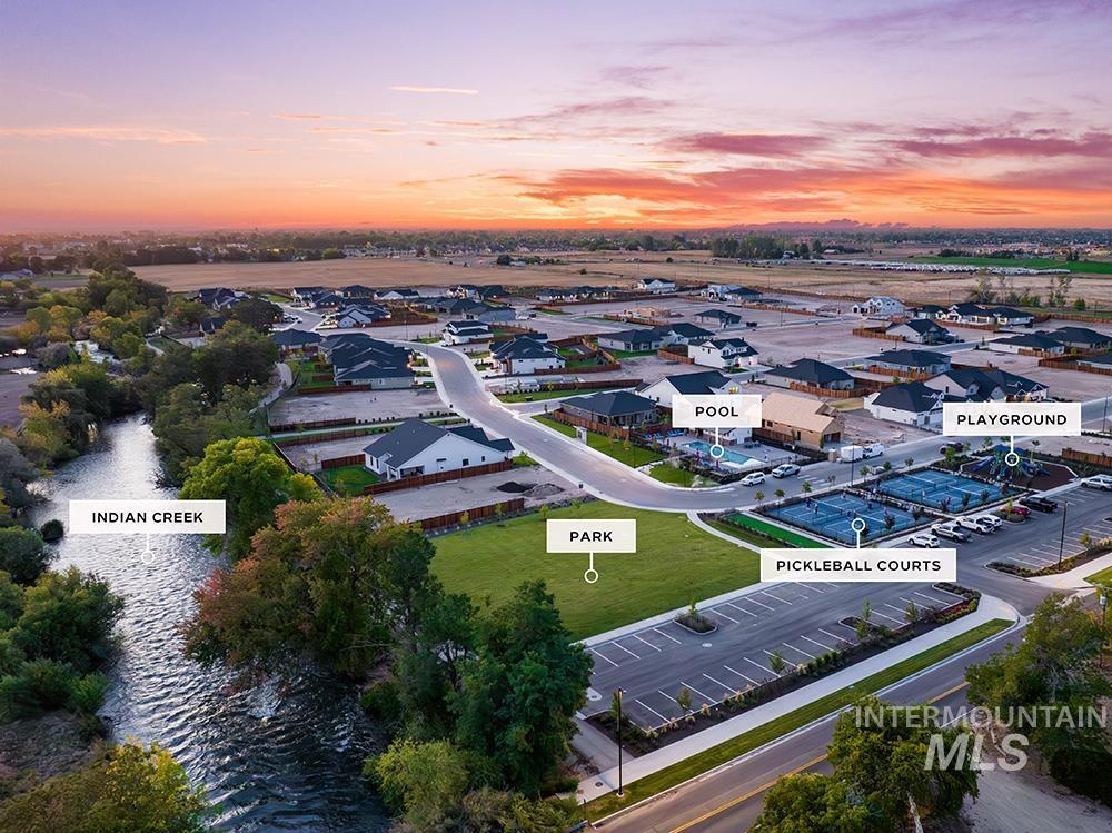 The Aspen by Sterling Homes now UNDER CONSTRUCTION at Indian Creek Ranch showcases thoughtful single-level design and a split bedroom layout that prioritizes both entertaining and privacy, on a gorgeous waterfront setting! Spacious great room, where an open-concept flow connects the living, dining, and gourmet kitchen areas, anchored by a large gas fireplace. The kitchen is equipped with built-in stainless steel appliances, soft-close cabinetry with stylish hardware, and durable, elegant countertops – perfect for everyday living or hosting friends and family. The primary suite is tucked privately on one side of the home, offering a spa-inspired en-suite bath with a luxurious soaking tub and a generous walk-in closet. On the opposite side, three additional bedrooms provide flexibility and comfort: two share a hallway and full bath, while the third offers a private hallway, full bath, and walk-in closet, ideal as a junior suite, guest quarters, or bonus room. Additional living conveniences include a spacious laundry room, mudroom, walk-in pantry, and a large 3-car garage. Smart home upgrades and energy-efficient systems complement the design, while Indian Creek Ranch offers Kuna’s first resort-style waterfront lifestyle, featuring an upcoming waterfront park, playground, tennis courts, and community pool, all set against the backdrop of open skies and the scenic Indian Creek.