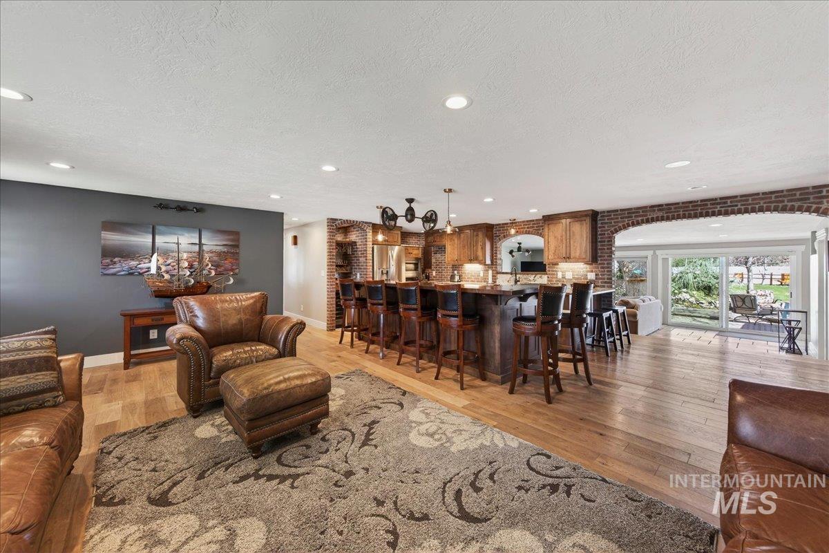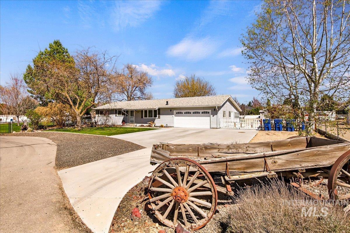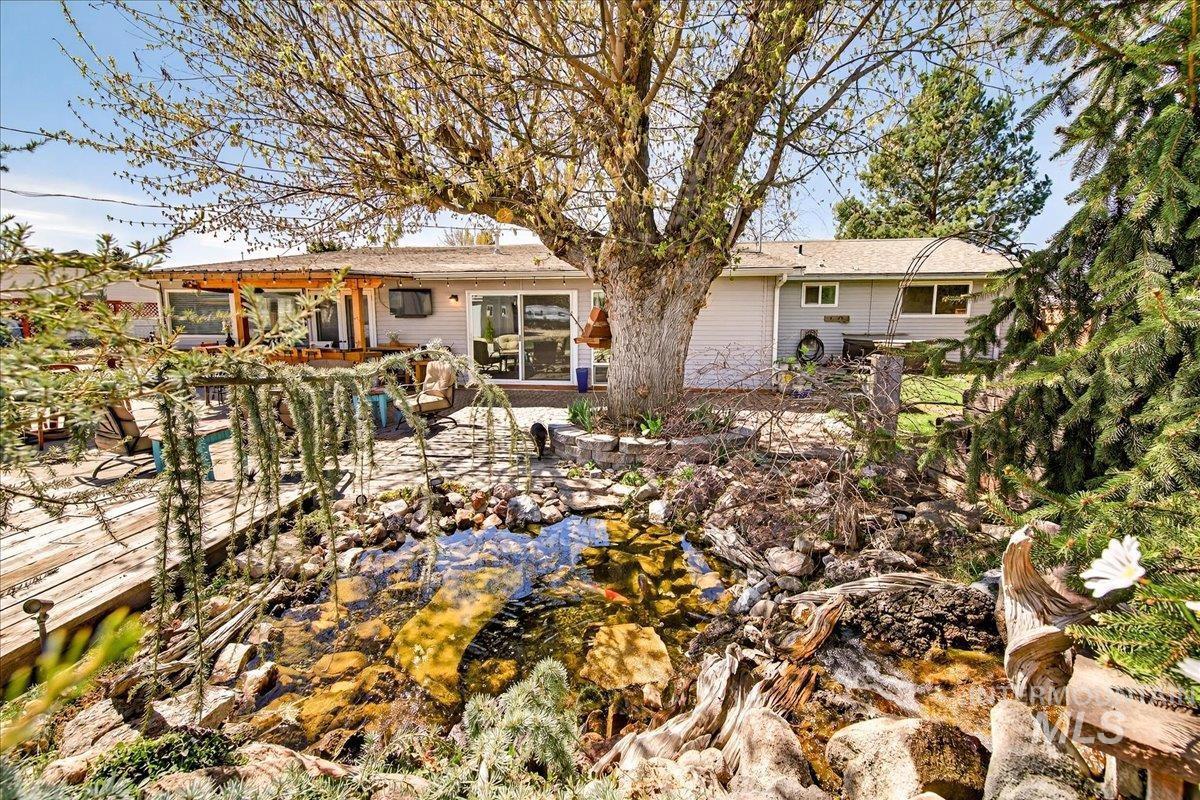 This is the one you didn’t think existed… until now, unbelievable find—close to everything, yet your own private sanctuary! Situated on .956 acres in a well-established Meridian neighborhood of acreage homes, beautifully remodeled property offers space, privacy & exceptional amenities. The gourmet kitchen is a true showpiece with a large center island, granite countertops, custom cabinetry, brick accents, copper farm sink, built-in oven, gas cooktop, coffee bar & separate wine bar—perfectly designed for entertaining. Spacious living & family rooms provide warmth & versatility, featuring both a gas fireplace & wood-burning stove. Private office or optional bedroom adds flexibility. Step outside to a stunning backyard oasis at the end of a cul-de-sac, complete with waterfall/Koi pond, patio, fire pit & outdoor bar. Expansive grounds include designated irrigated garden area w/raised beds, grape & berry trellises & fruit orchard. But there`s more: multiple outbuildings: 556 sq.ft. shop with work shop, loft & power + attached 2-car carport, detached greenhouse has water, power & heated tile seed counters! 10x12 shed & do you need that flex/workout room 272 sq.ft. detached w/heat, power & insulated! Plus there is ample room for animals, toys, equipment or that additional future shop, situated in private cul de sac. NO HOA! Too many features to list—request full amenities list