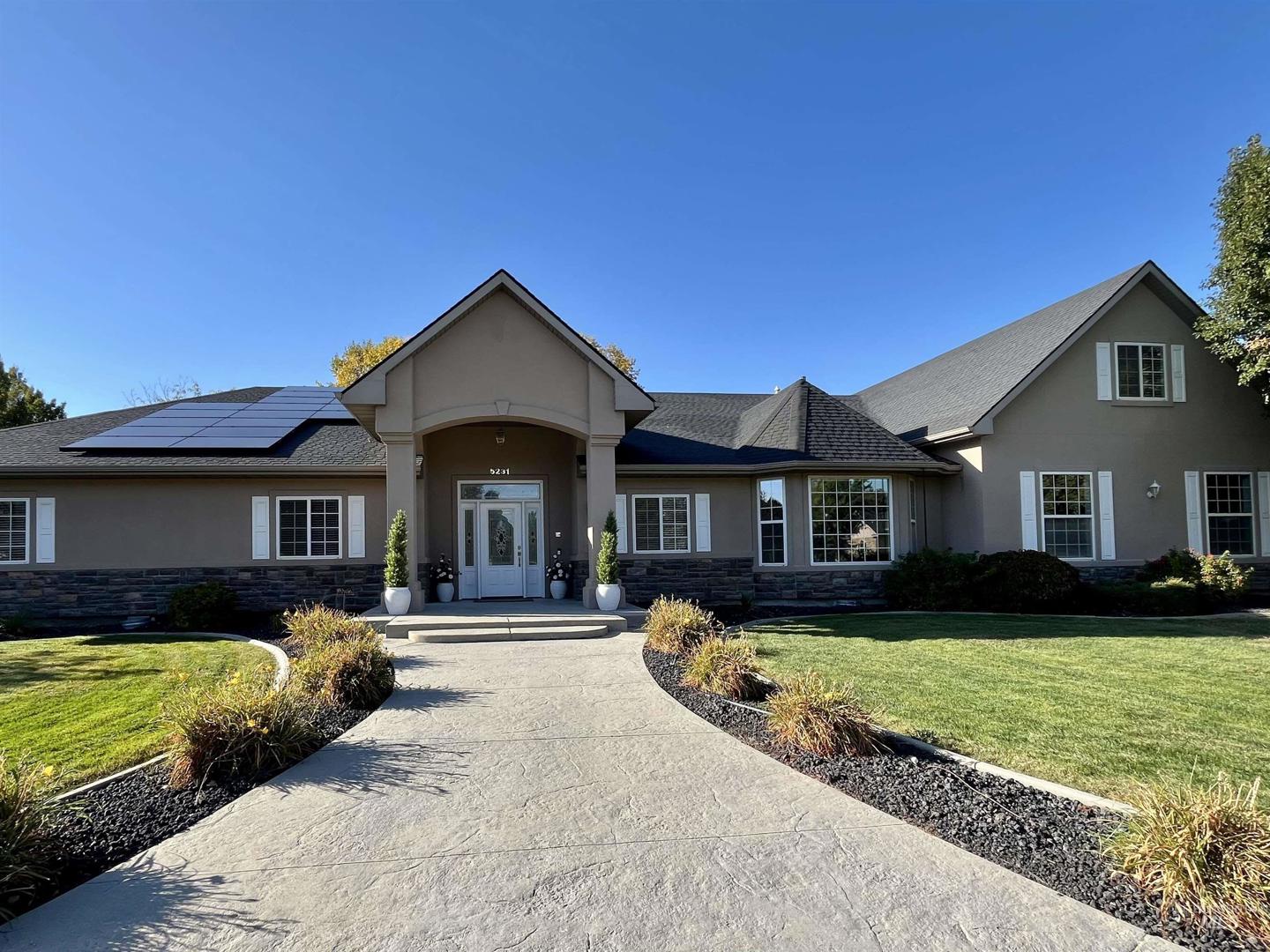 Experience timeless elegance in this custom 4-bed, 3.5-bath retreat in Northwest Boise’s desirable Brookdale Meadows. Situated on a premier corner lot, this home greets you with a grand entryway and ash hardwood floors. The gourmet kitchen is a chef`s dream, featuring double ovens, dual sinks, and a generous island. Retreat to the main-level primary suite, boasting a spa-like bath and an expansive walk-in closet. Upstairs, discover a versatile bonus room complete with a full bedroom and bathroom, providing the perfect private retreat for guests or a home office. For the hobbyist, the 3-car garage includes an extra storage room and a built-in workbench plumbed for an air compressor. Outside, a tranquil backyard oasis awaits with a rock fountain, garden boxes, and a large, covered patio. New dishwasher & oven, and solar panels (35K value) ensures modern energy efficiency.