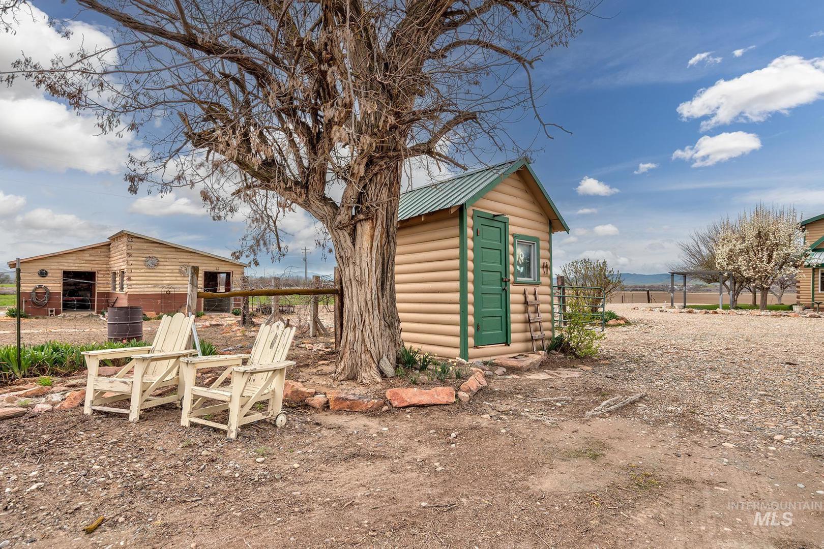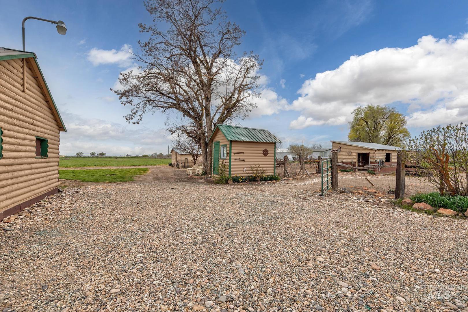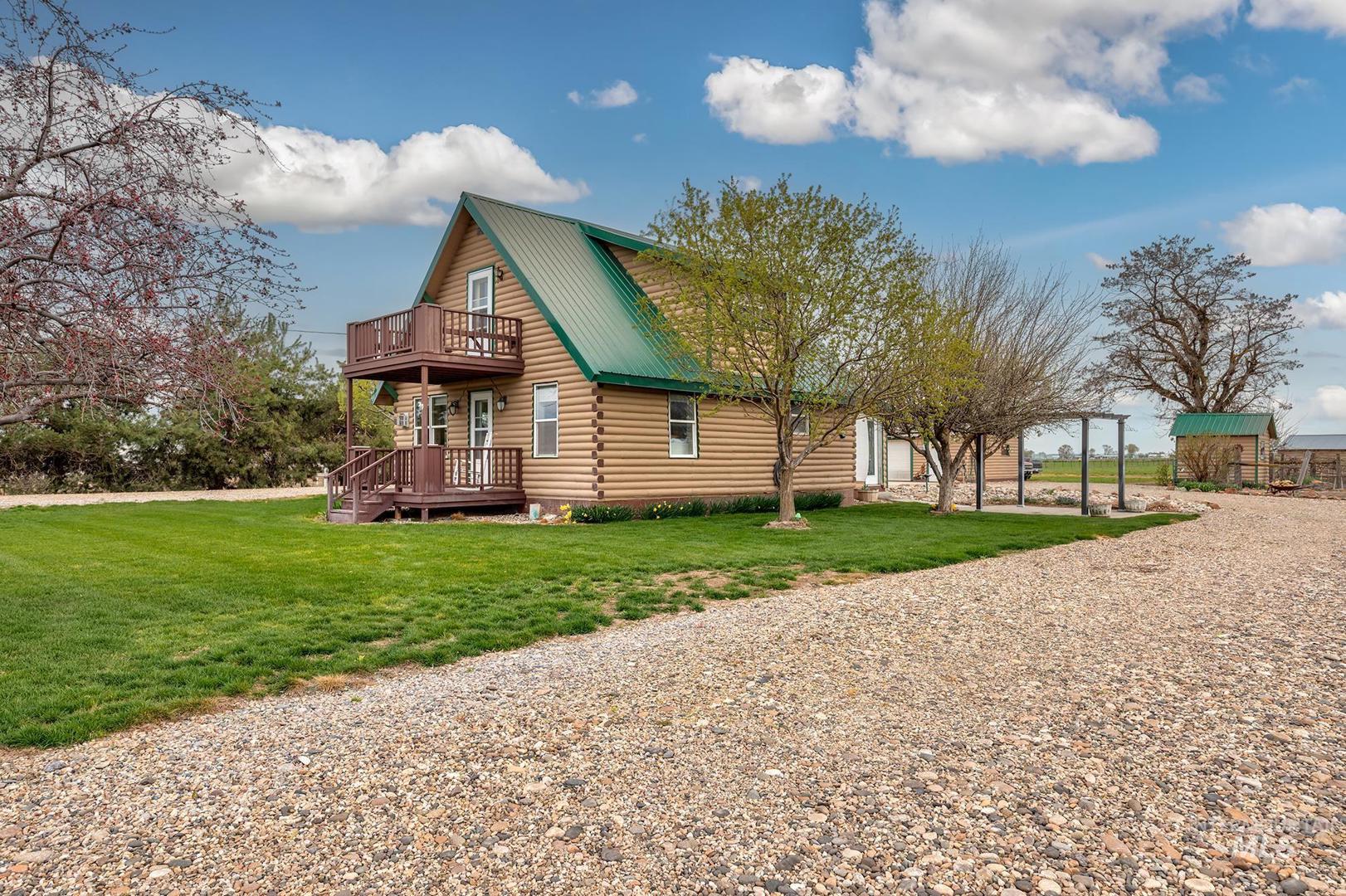 This home has the most comfortable feel! This cozy log cabin has been updated, but still has its original charm. Inviting living room with fireplace and north facing views as far as the eye can see. The kitchen has a charming layout with updated cabinets and island. Adjacent to the kitchen is the oversized tiled back entry and dining room area. The downstairs also features a bedroom, full bath, and laundry area. Step upstairs to the full second story master suite with attached bath, walk in closet, separate seating area, and private balcony. This small acreage set up has everything you need for your own hobby farm! Several outbuildings with power; originally set up for animals. Pasture at the back of the property. Large garden area. So many possibilities! Close to town and minutes from the Snake River. Lines drawn for reference only; not to reflect exact property lines or survey.