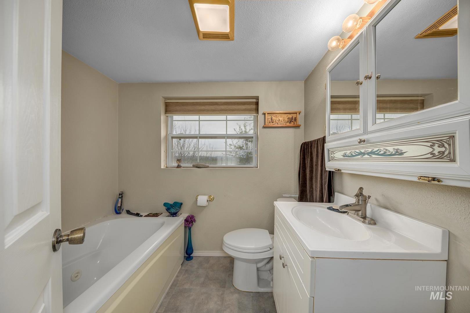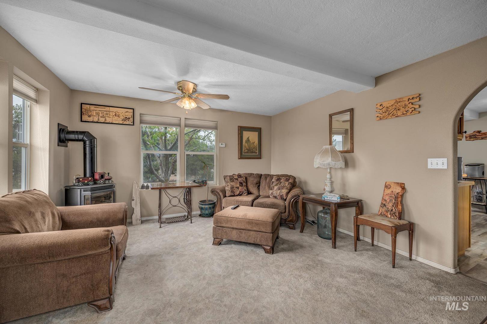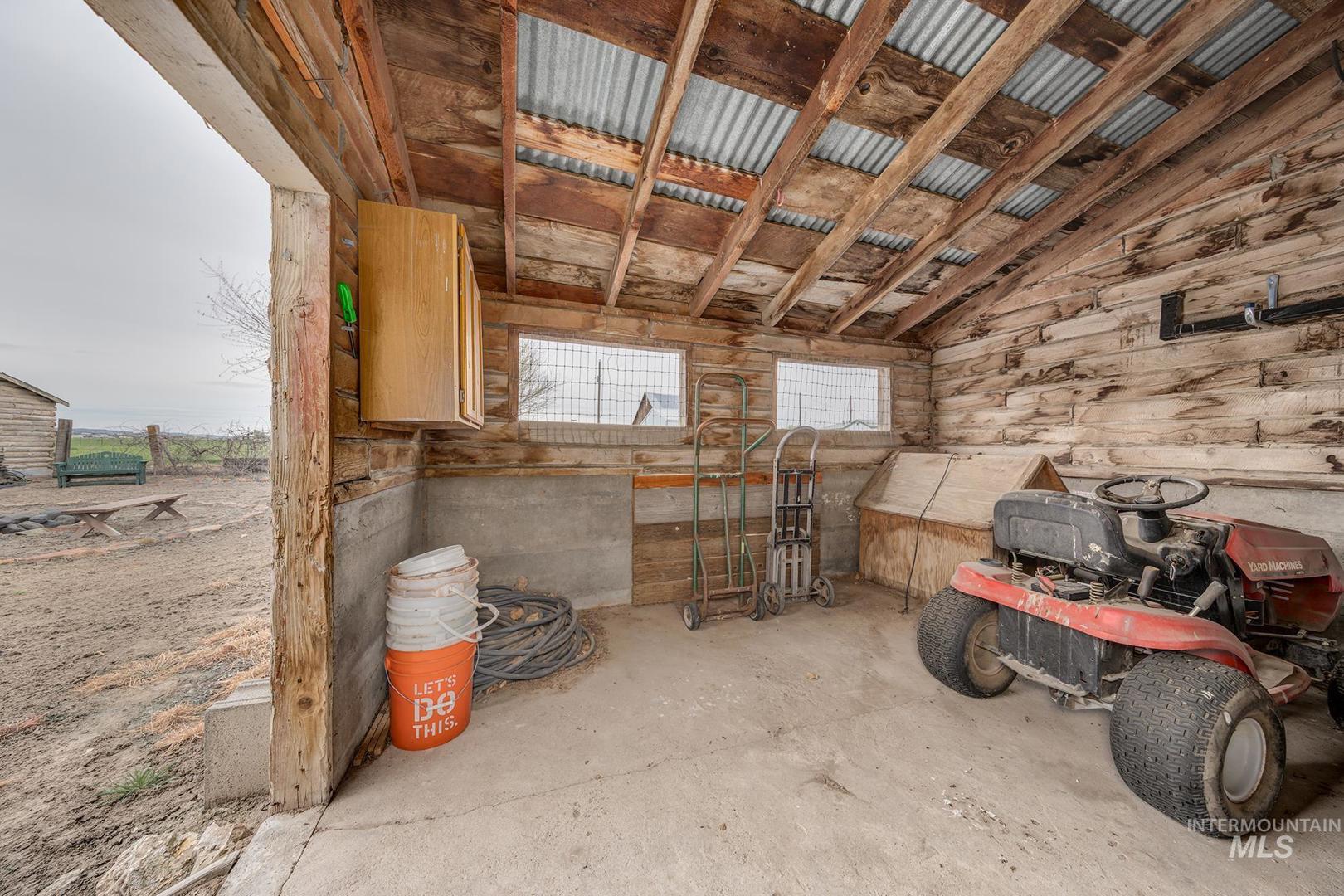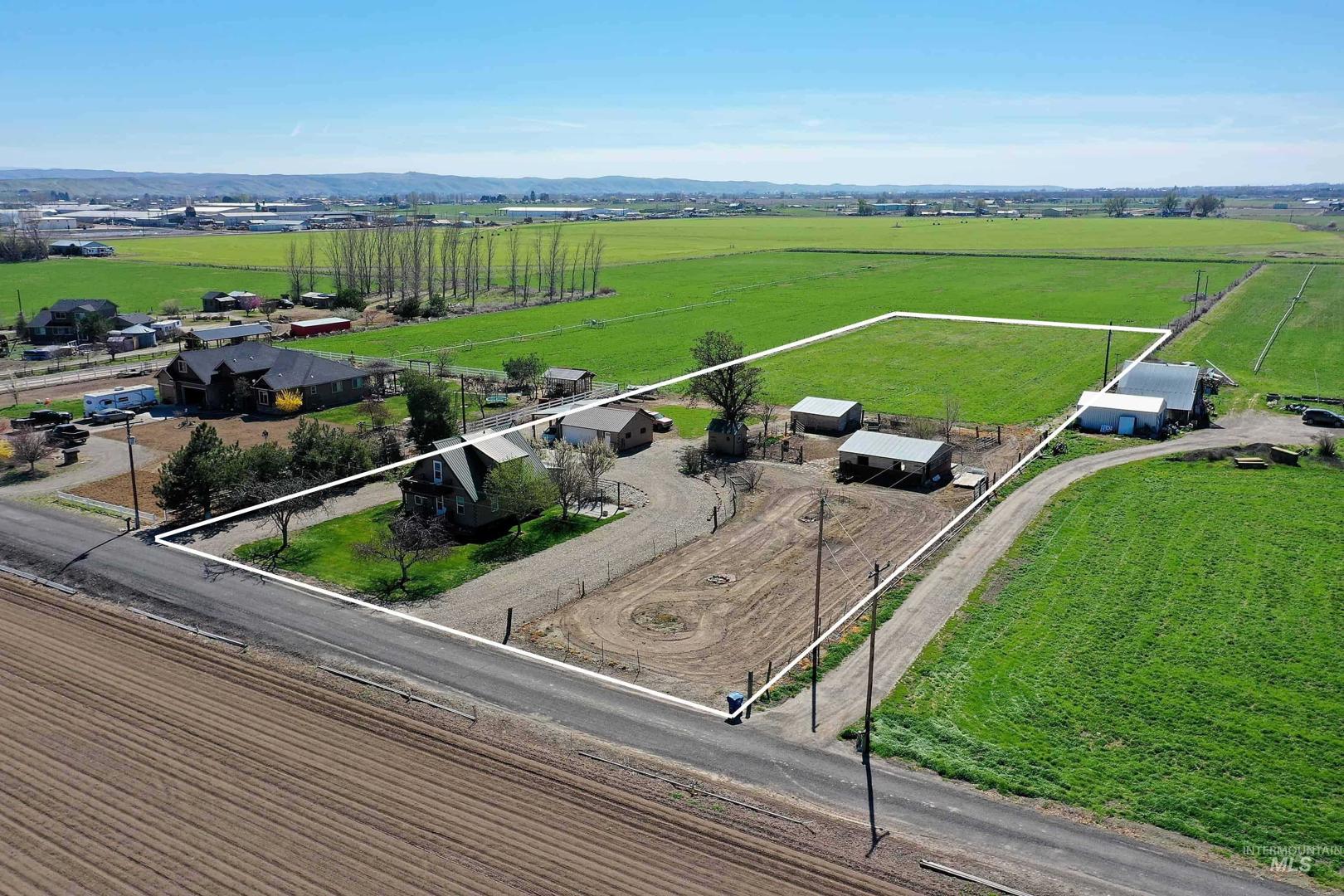 This home has the most comfortable feel! This cozy log cabin has been updated, but still has its original charm. Inviting living room with fireplace and north facing views as far as the eye can see. The kitchen has a charming layout with updated cabinets and island. Adjacent to the kitchen is the oversized tiled back entry and dining room area. The downstairs also features a bedroom, full bath, and laundry area. Step upstairs to the full second story master suite with attached bath, walk in closet, separate seating area, and private balcony. This small acreage set up has everything you need for your own hobby farm! Several outbuildings with power; originally set up for animals. Pasture at the back of the property. Large garden area. So many possibilities! Close to town and minutes from the Snake River. Lines drawn for reference only; not to reflect exact property lines or survey.