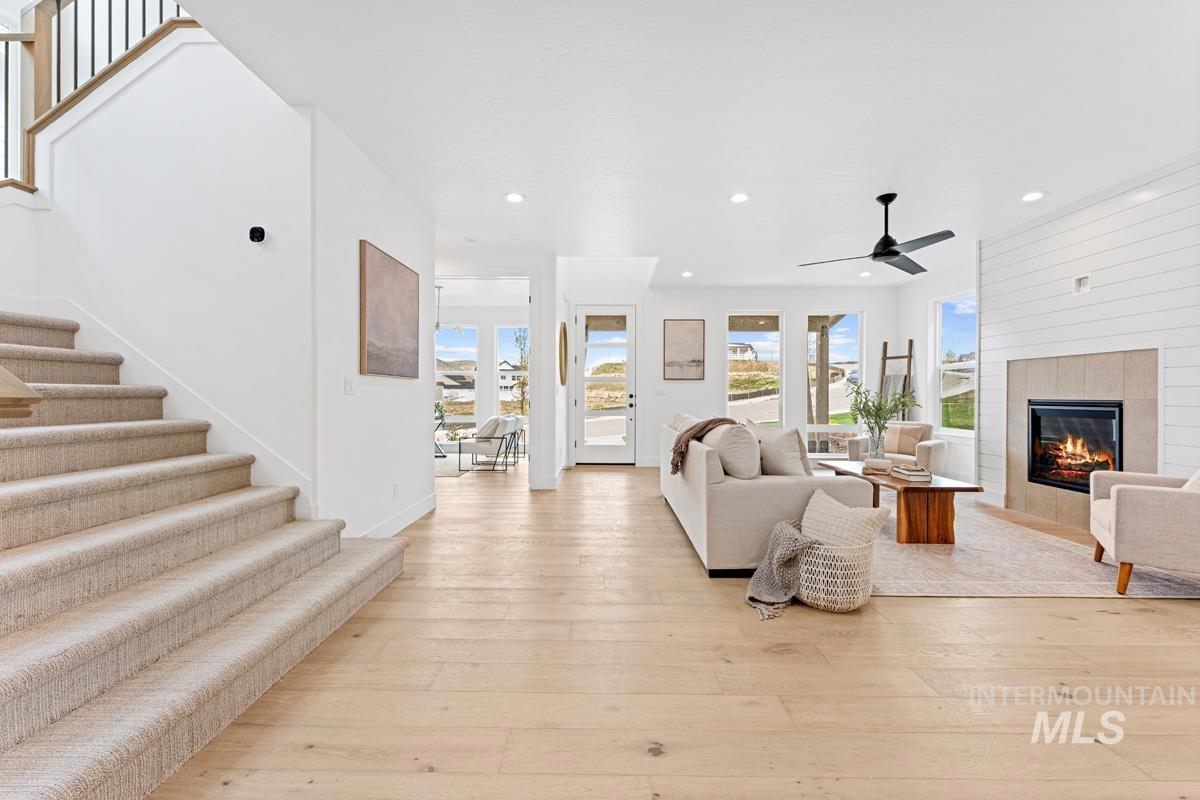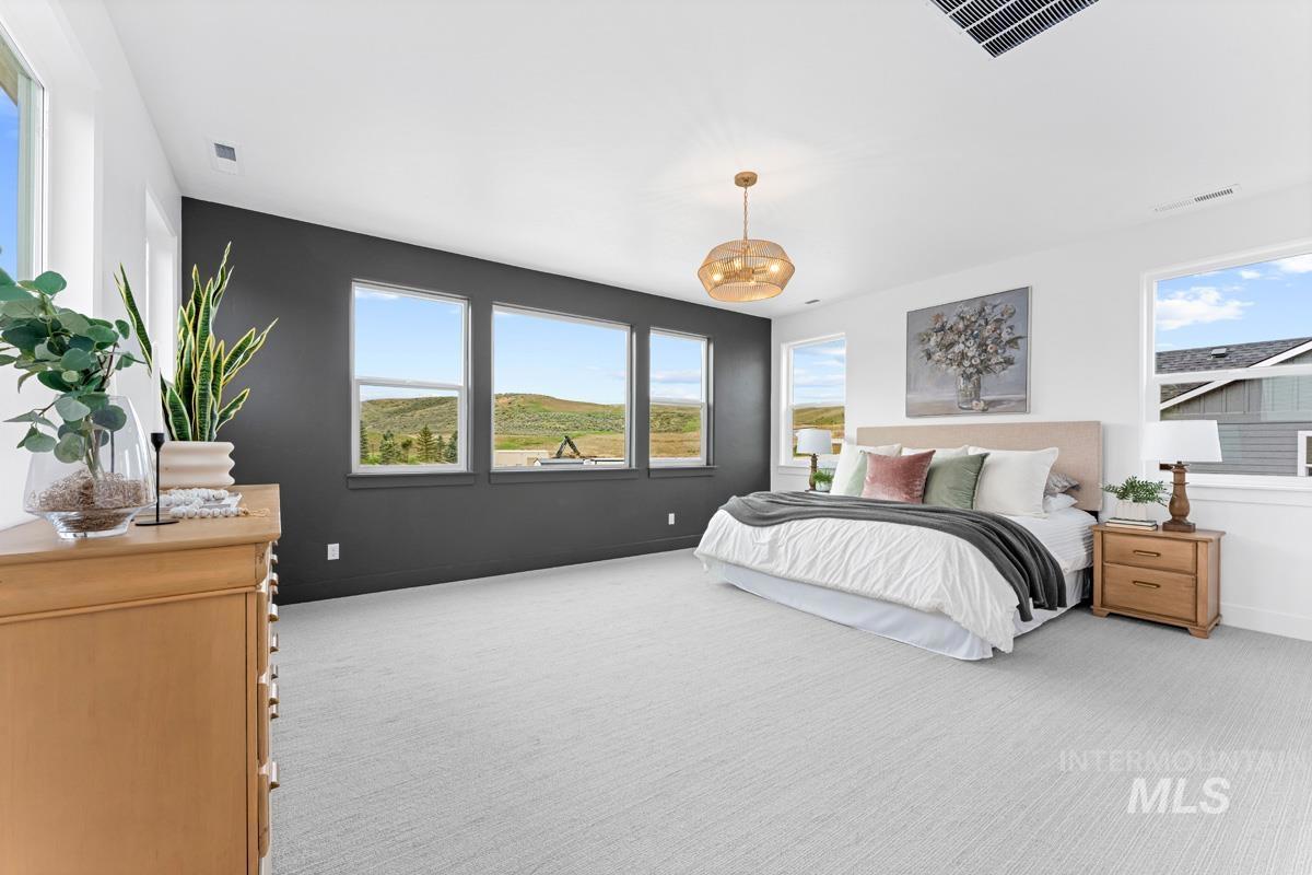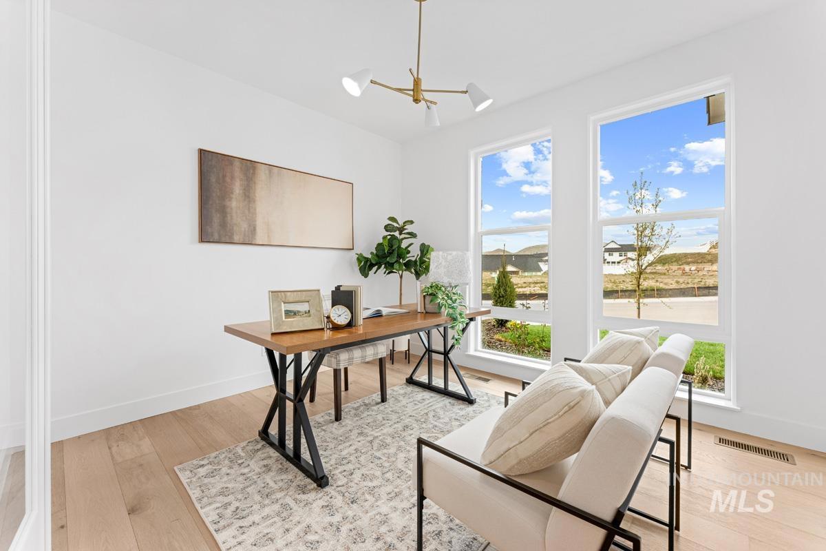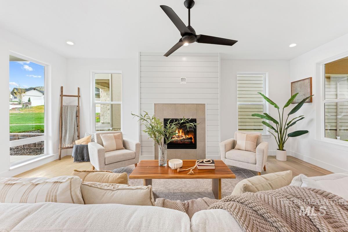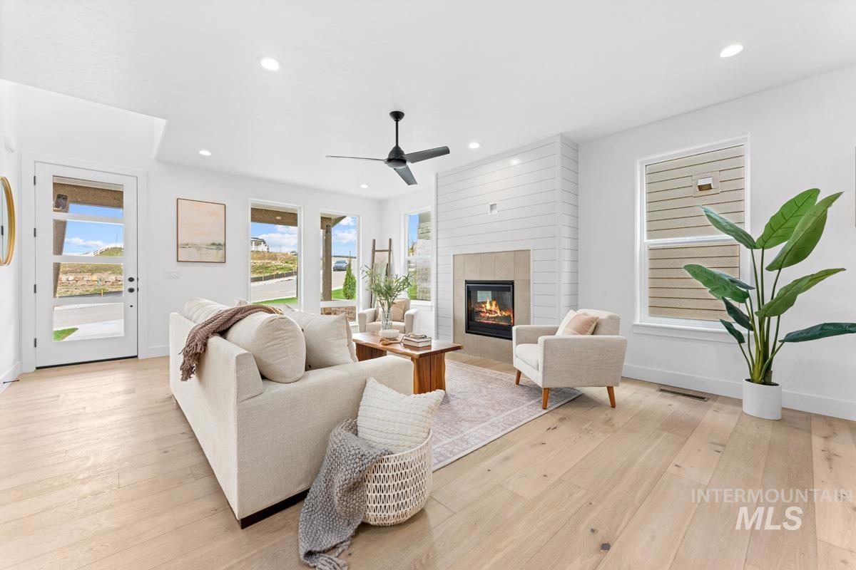 Enjoy exclusive lock and leave living at one of the most affordable price points in Dry Creek Ranch. This low maintenance home INCLUDES LANDSCAPE MAINTENANCE and is conveniently located near the 5-acre community center which has a pool, gym, clubhouse, and sport courts. Embark on adventure with hiking/biking trails minutes from your doorstep or take a swing at one of the nearby golf courses. Downtown Eagle`s shops and restaurants are waiting to be explored just a quick drive away. This two-story Palouse home welcomes you into a dramatic great room with an open-to-below layout, soaring ceilings, a platform fireplace, and a covered patio. Just off the main living space, the chef’s kitchen features a spacious island, handsome cabinetry, and an oversized pantry with appliance shelving. A dedicated main-floor office adds quiet, flexible space for work or study. Upstairs, a generous loft offers additional living space alongside several large bedrooms. The primary suite is tucked away featuring wall-to-wall windows, a luxurious bath, and dual walk-in closets. The 3-car garage offers plenty of space to store your vehicles and toys. Peaceful low maintenance living means you can explore the best of what Idaho has to offer. Proximity to highway 55 allows for short day trips or longer vacations to hot springs, ski resorts, lakes, mountains, and more.