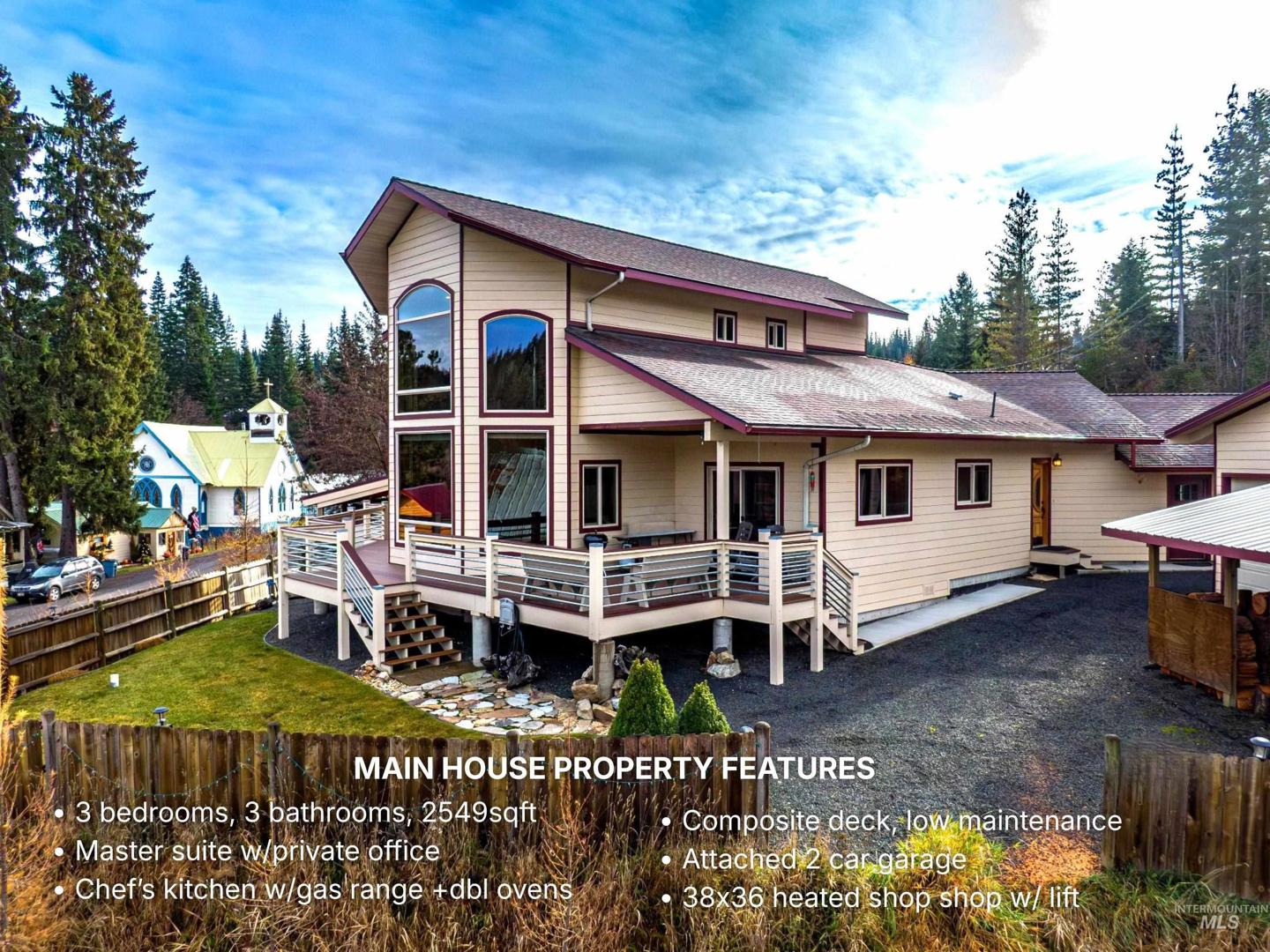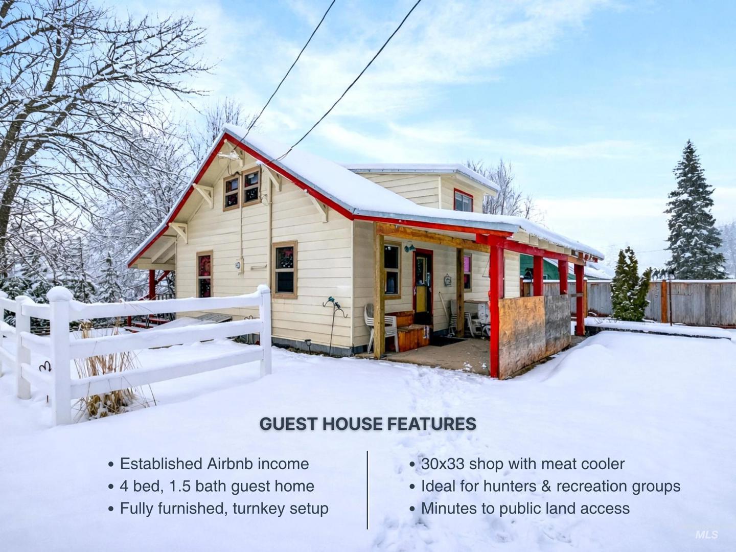 Turnkey Airbnb + mountain retreat with income potential. Own the lifestyle and let the property help pay for it. Rare opportunity in Elk River, Idaho offering a primary residence PLUS an established short-term rental surrounded by thousands of acres of public land. Located in the heart of town where the highway ends, the main home features floor-to-ceiling windows, a spacious kitchen with commercial gas range and double ovens, and a private upstairs master suite with office. Composite decking and low-maintenance landscaping make for easy living. A 2-car garage and heated 38x36 shop with lift, wood stove, bathroom & loft provide ample space for vehicles and toys. The fully furnished 4-bed, 1.5-bath guest home operates as a successful Airbnb and includes a 30x33 shop with built-in meat cooler. Minutes to Elk Creek Reservoir and endless recreation. Own a vacation getaway, generate income and enjoy Idaho at its best!