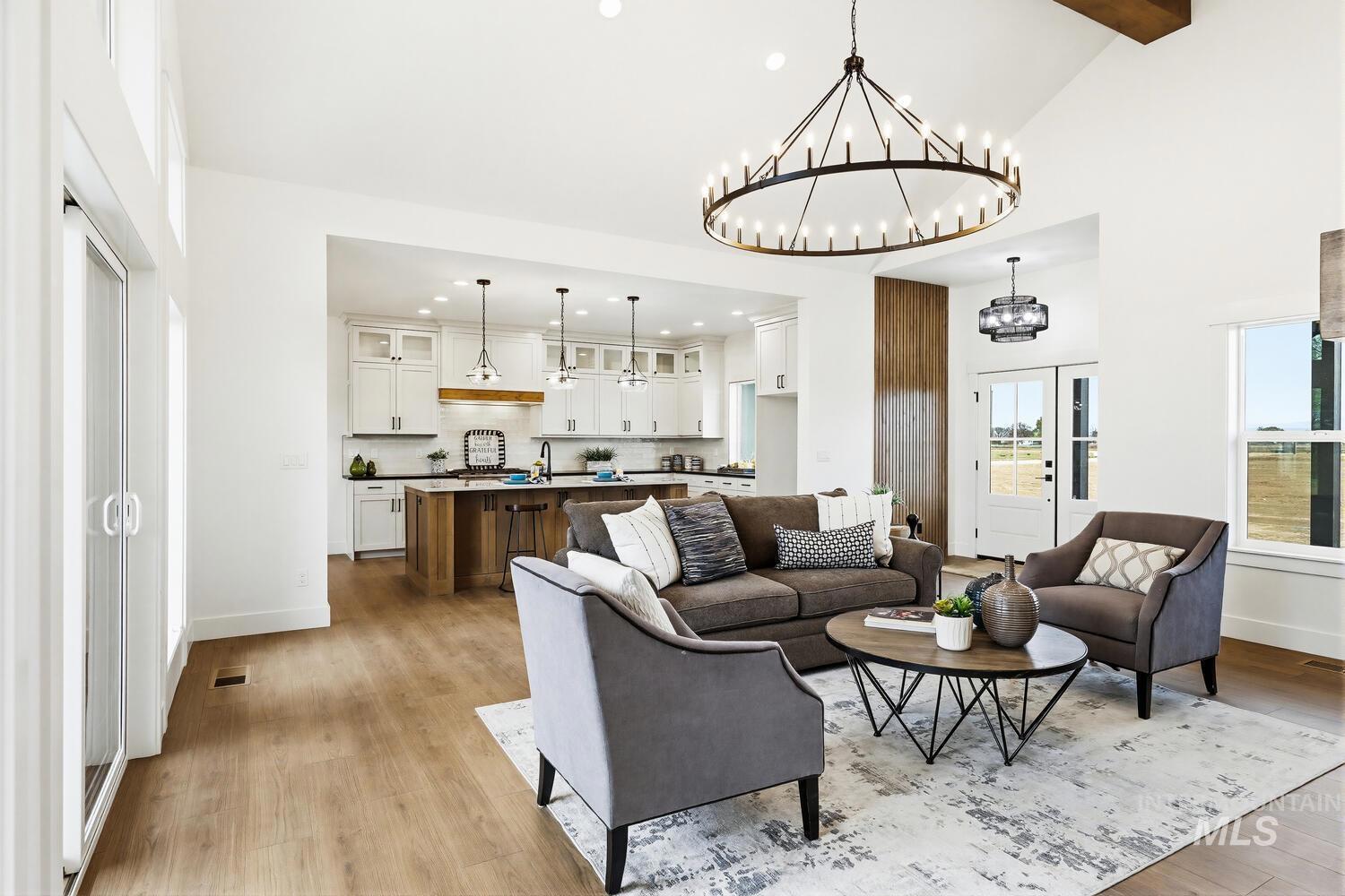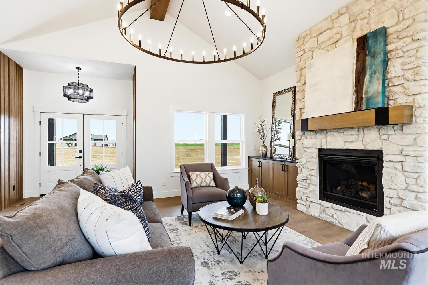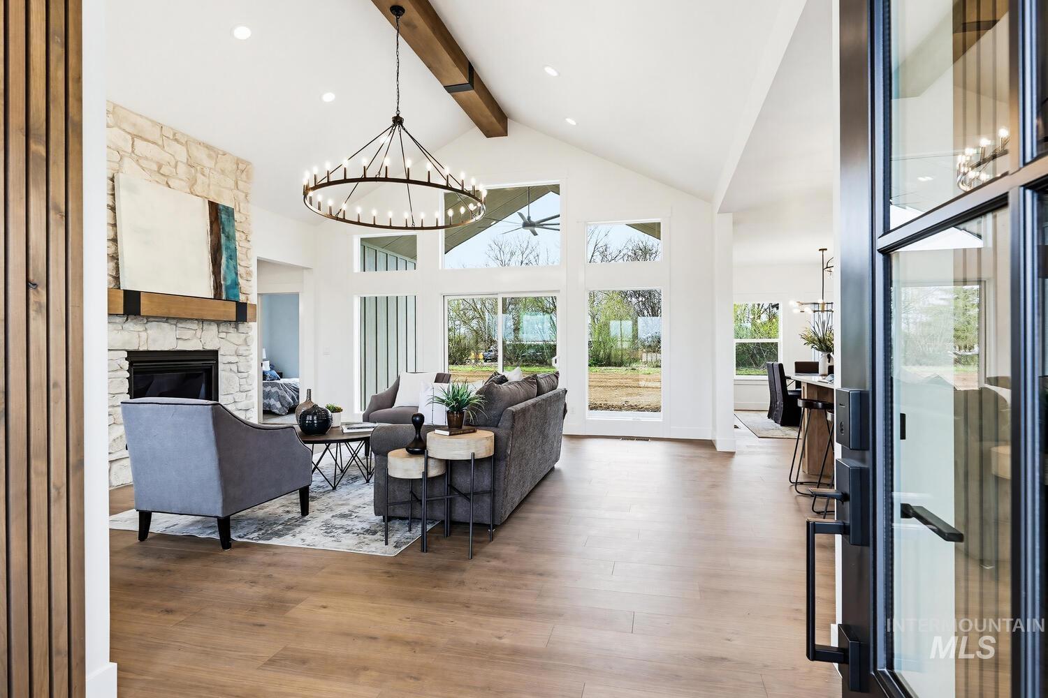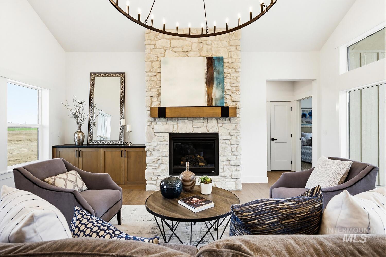 Luxury meets country living on 8.6?acres in this exceptional new custom home—designed for comfort, style, and everyday ease. A graceful open plan with soaring vaulted ceilings and a stained beam showcases fine craftsmanship throughout. The inviting great room centers on a beautiful fireplace with custom built-ins and large windows that fill the space with natural light. The chef’s kitchen features custom cabinetry, beautiful counters, premium finishes, and an impressive island ideal for entertaining. The split floor plan offers privacy, with the vaulted primary suite serving as a restful retreat—spa-inspired ensuite with dual vanities, freestanding tub, tiled shower, and an expansive walk-in closet conveniently connected to the laundry room. Secondary bedrooms are generous and well-appointed. Expansive covered front and back porches extend the living space outdoors, perfect for morning coffee or evening gatherings. A spacious 3-car garage plus 30`x40`?shop provide room for vehicles, equipment, or creative projects. Water rights, quality trim detailing, and abundant natural light complete this beautifully built property. Builder offering landscape allowance—close to town yet perfectly set in peaceful country surroundings. GPS 4650 E Idaho to locate.