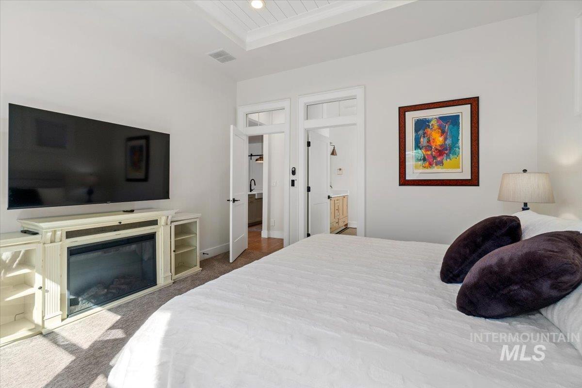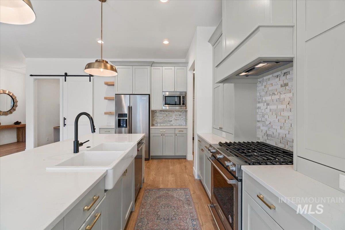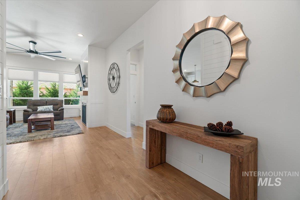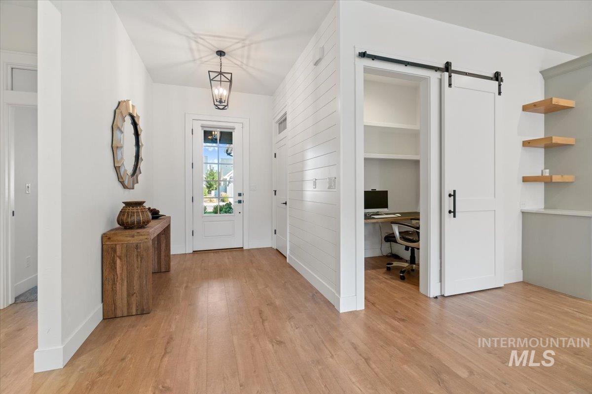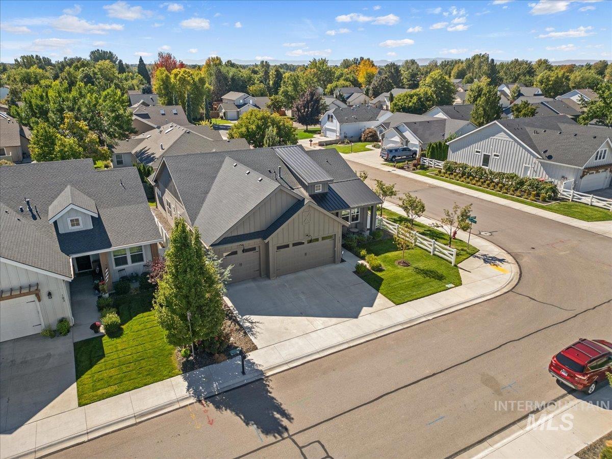 Fantastic NW Meridian location! Ultra clean Open-living/modern farmhouse design. Features include charming shiplap details, barndoor accents, wide modern entry and multiple upgrades (See upgrades list in docs tab). The spacious open kitchen is equipped w/gorgeous custom cabinets and hardware, food/storage pantry and dedicated lighted coffee nook area. Take note of the modern kitchen tile & backsplash, along with a farmhouse sink and top-of-the-line SS appliances including the matching refrigerator. A sliding "barn" style door closes off the office space which includes built-in desk and shelving for great storage and a place to work from home. The master bedroom has a "shiplap tray" ceiling and a luxurious master bath that features dual vanity sinks, a soothing soaker tub and a stunning tiled walk-in shower. Oversized 3 car garage with custom cabinets/workbench and a custom epoxy floor. Situated on a corner lot and fully fenced. The south facing backyard provides a wonderful space for gardening, entertaining and relaxing on the extended covered patio with automatic electric sun shade and cozy free standing gas fireplace. Too many extra features to list here! Ideally located in NW Meridian near Settler`s Park and the Village, offering easy access to shopping, dining and outdoor fun!