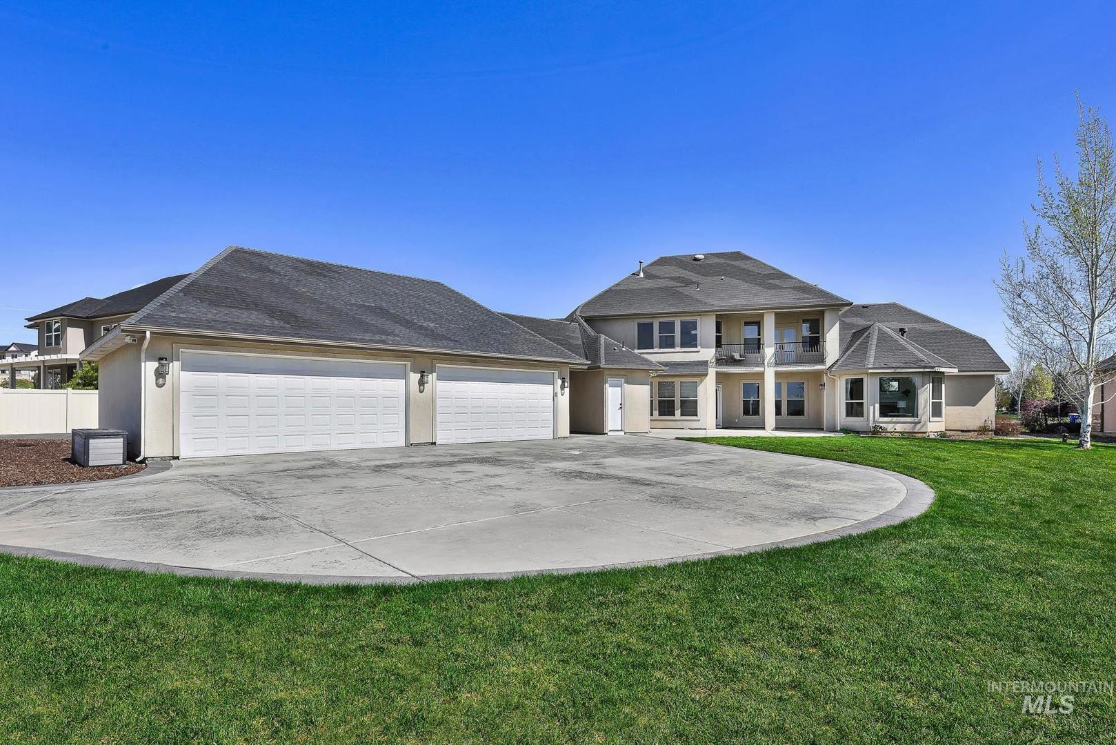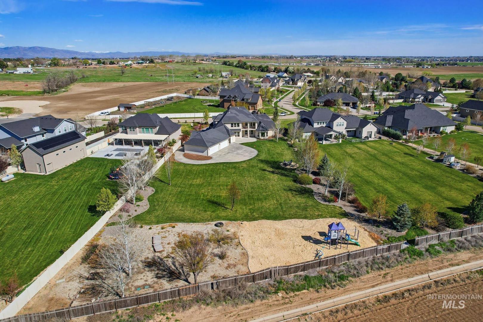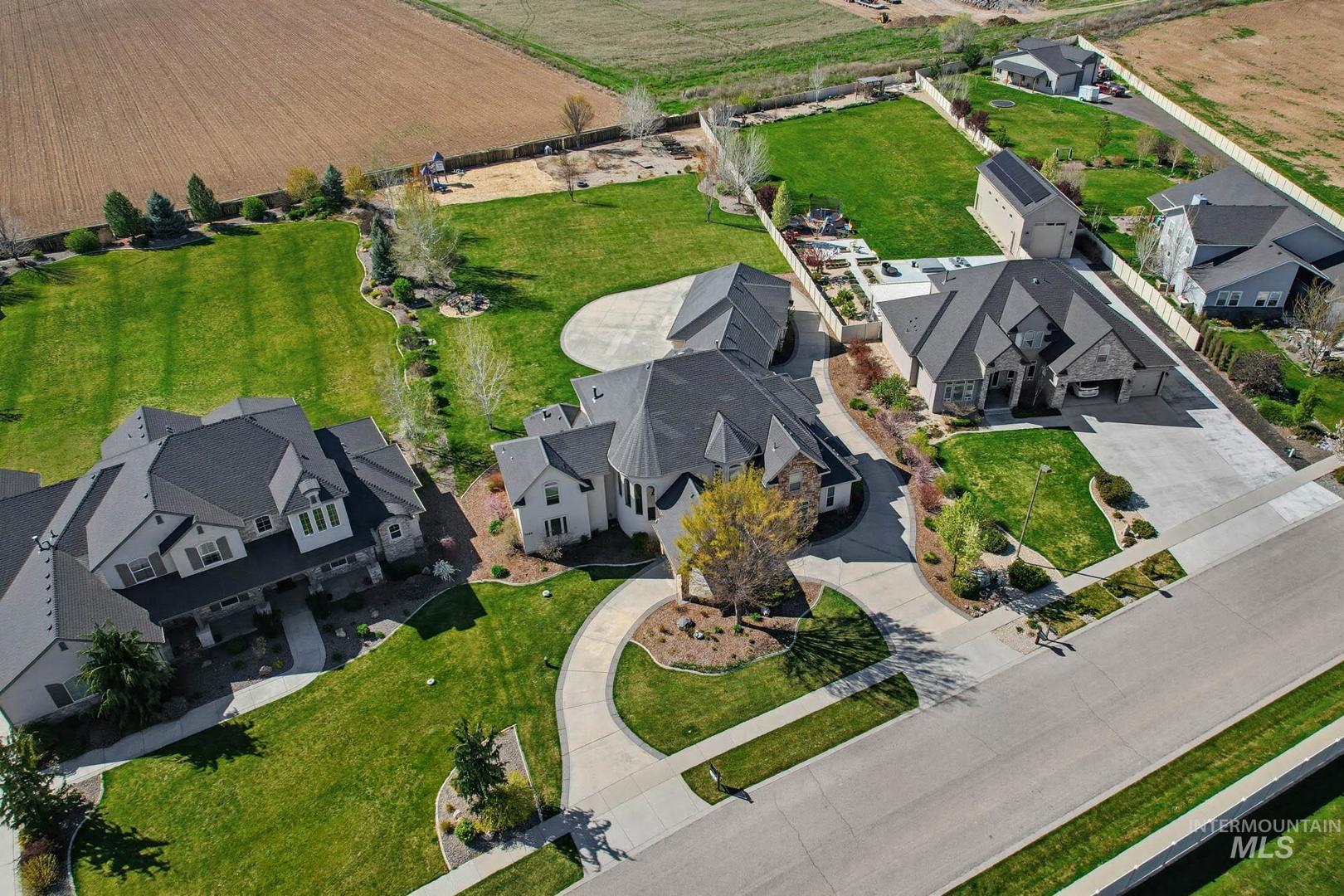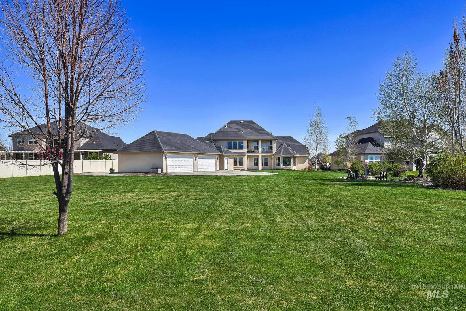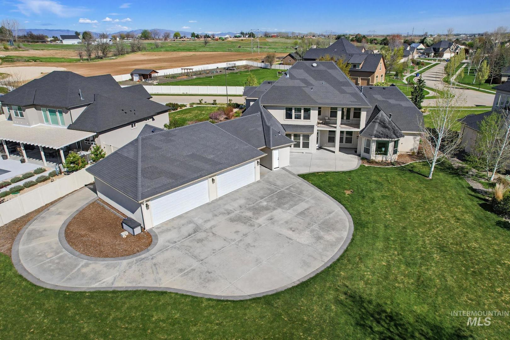 Experience luxury living on a full acre in southwest Meridian with convenient access to the freeway, shopping, and nearby schools like Gem Prep, as well as parks including Discovery Park. This 5,500+ sq ft home is set in a coveted neighborhood and offers five spacious bedrooms, each with walk-in closets, and six bathrooms. The main level features a grand primary suite with a tile walk-in shower, soaker tub, and a double-sided fireplace that opens to a private sitting area, along with a junior ensuite featuring an accessible shower. The kitchen is designed for both function and style, complete with a gas cooktop, double ovens, granite countertops, full tile backsplash, and a large pantry, flowing seamlessly into multiple living and entertaining spaces, including a dedicated media area. Throughout the home, you’ll find abundant natural light, detailed millwork, coffered ceilings, custom wainscoting, and gas fireplaces that elevate the overall design. Step outside to expansive outdoor living with sweeping sunset views, mature landscaping, raspberry bushes, peach trees, and garden boxes. The one-acre lot provides flexibility to build a shop, pool, or additional features with HOA approval. Additional highlights include a geothermal heating and cooling system, private well with excellent water quality, community septic, an oversized four-car garage with attic storage.