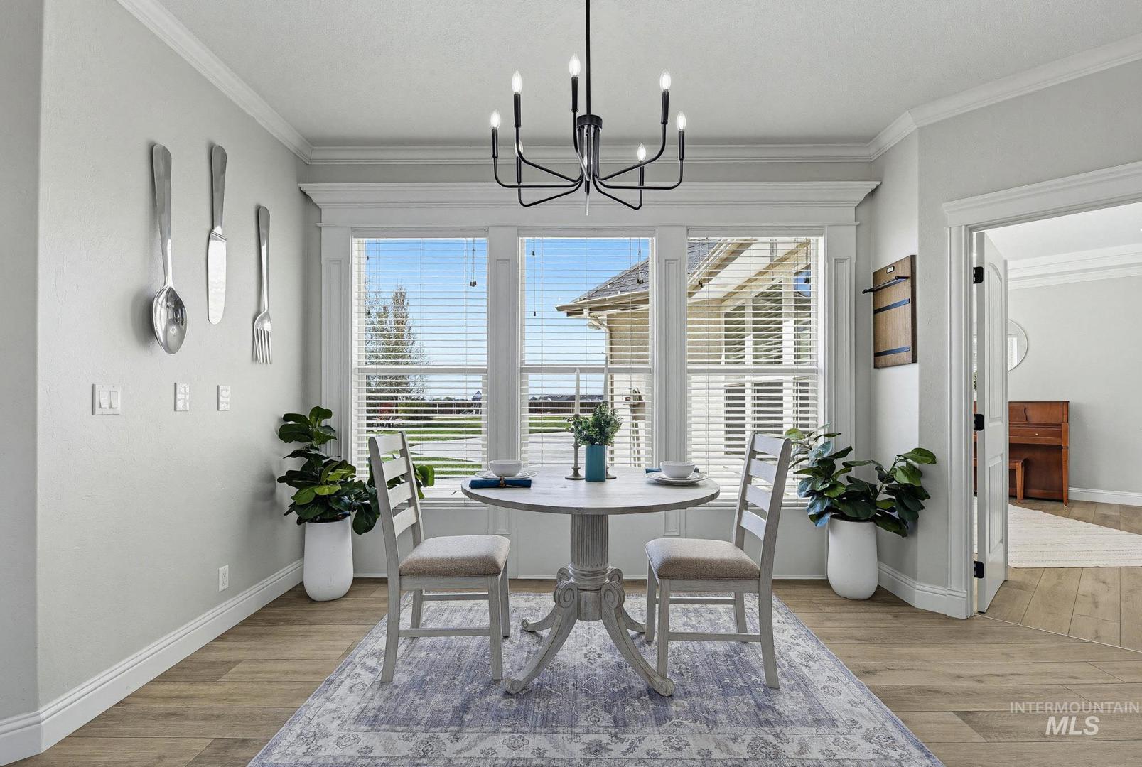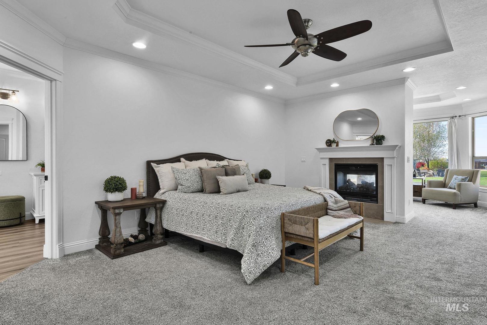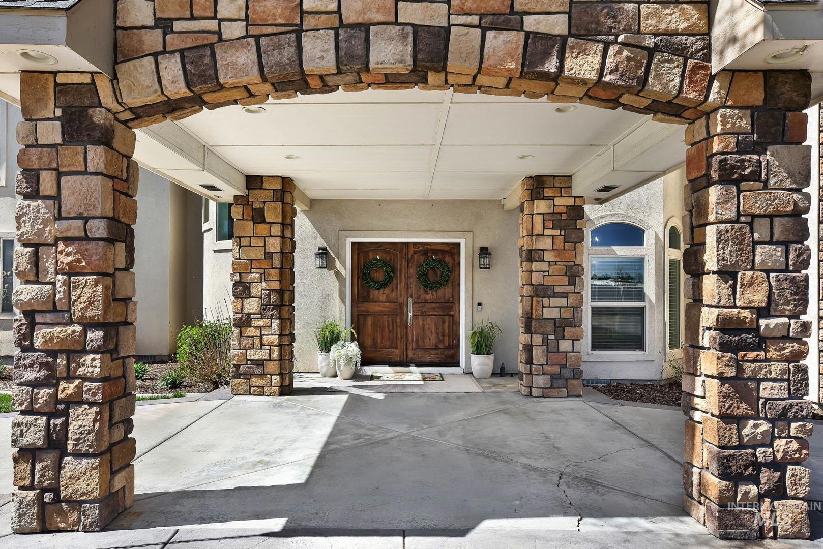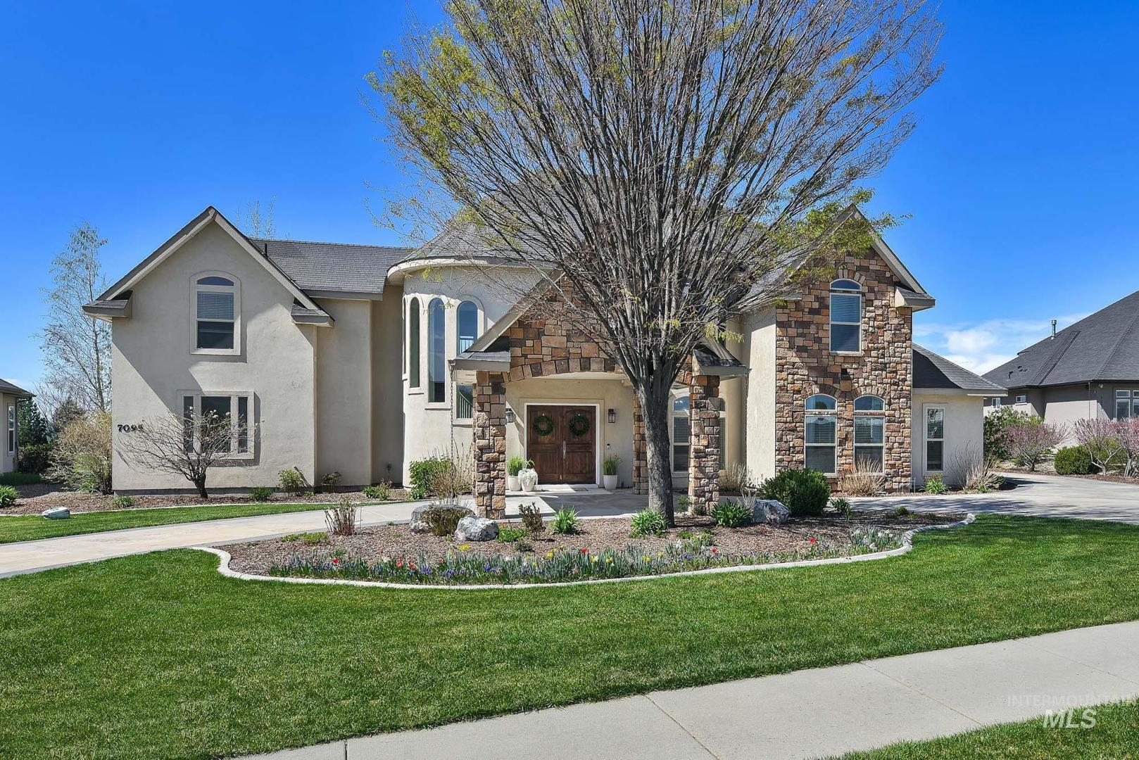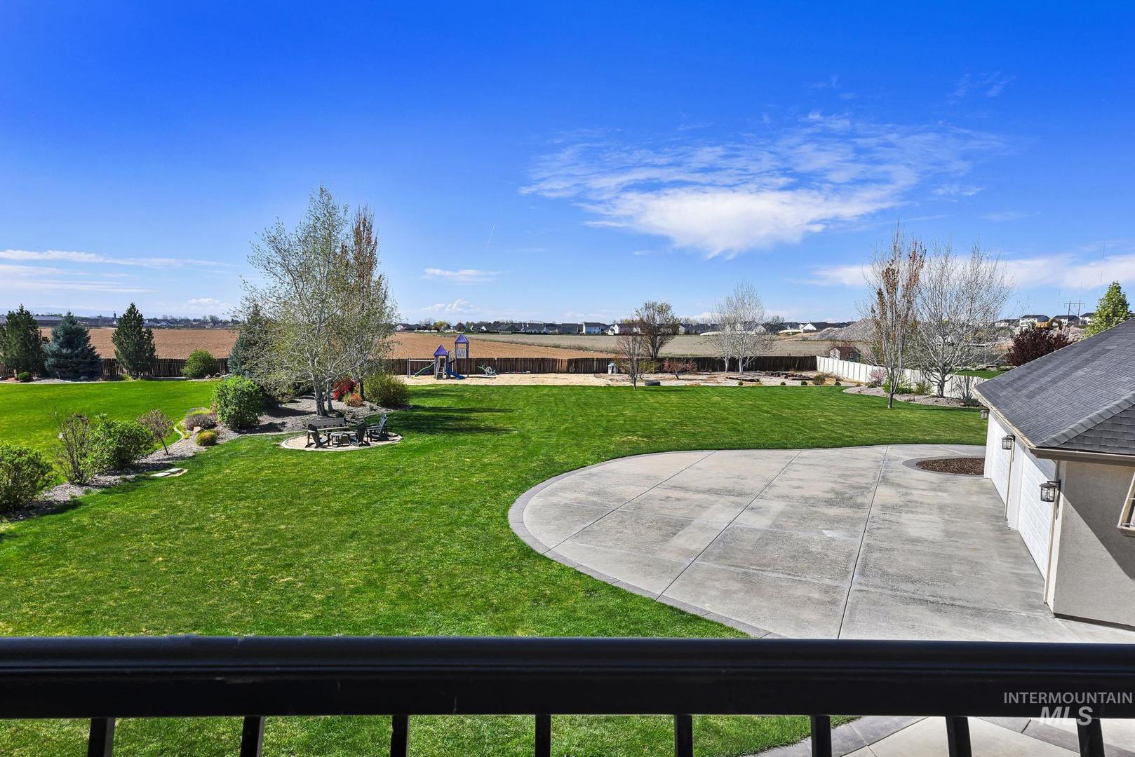 Experience luxury living on a full acre in southwest Meridian with convenient access to the freeway, shopping, and nearby schools like Gem Prep, as well as parks including Discovery Park. This 5,500+ sq ft home is set in a coveted neighborhood and offers five spacious bedrooms, each with walk-in closets, and six bathrooms. The main level features a grand primary suite with a tile walk-in shower, soaker tub, and a double-sided fireplace that opens to a private sitting area, along with a junior ensuite featuring an accessible shower. The kitchen is designed for both function and style, complete with a gas cooktop, double ovens, granite countertops, full tile backsplash, and a large pantry, flowing seamlessly into multiple living and entertaining spaces, including a dedicated media area. Throughout the home, you’ll find abundant natural light, detailed millwork, coffered ceilings, custom wainscoting, and gas fireplaces that elevate the overall design. Step outside to expansive outdoor living with sweeping sunset views, mature landscaping, raspberry bushes, peach trees, and garden boxes. The one-acre lot provides flexibility to build a shop, pool, or additional features with HOA approval. Additional highlights include a geothermal heating and cooling system, private well with excellent water quality, community septic, an oversized four-car garage with attic storage.