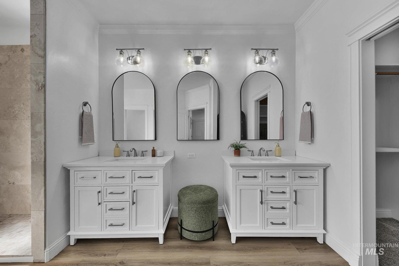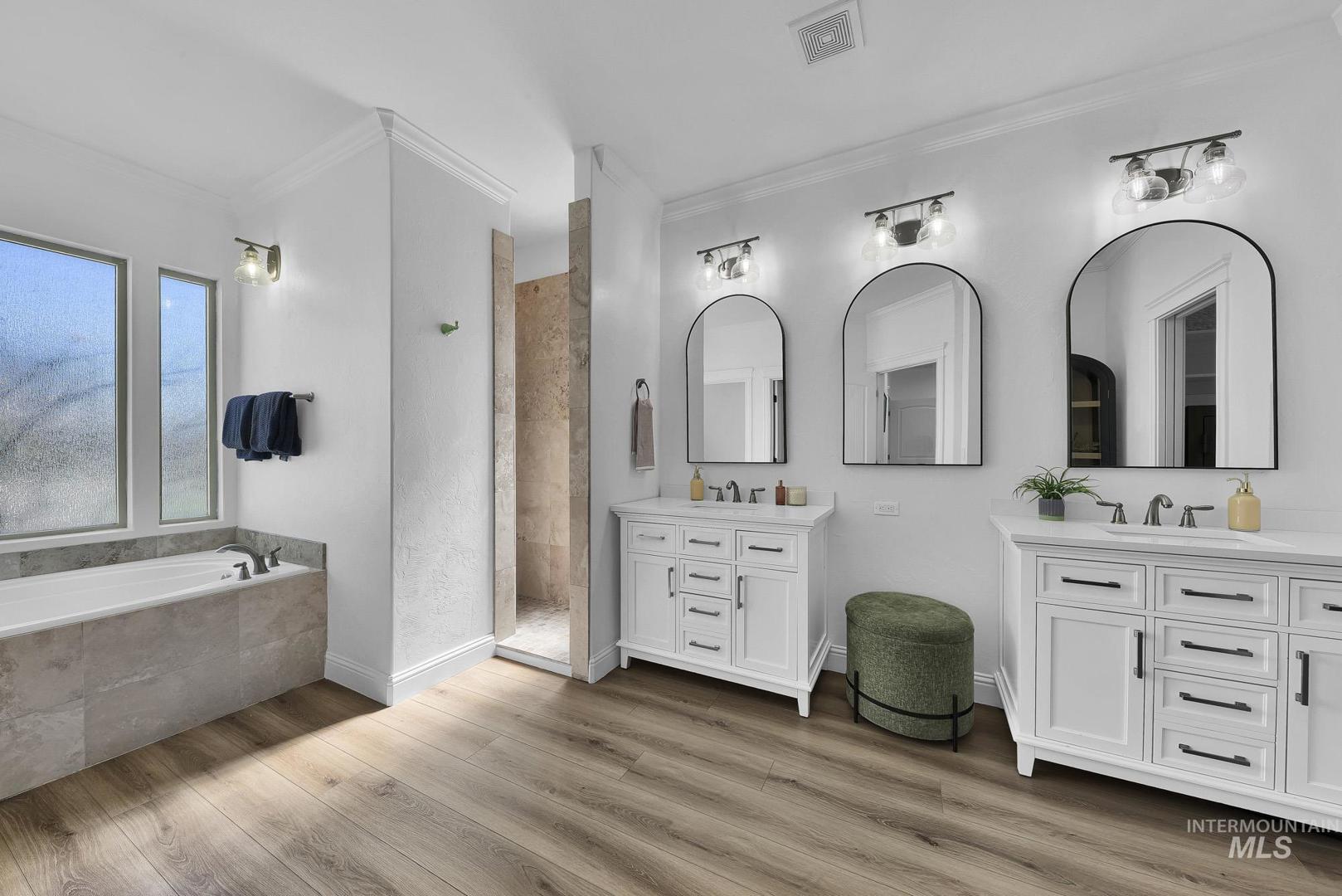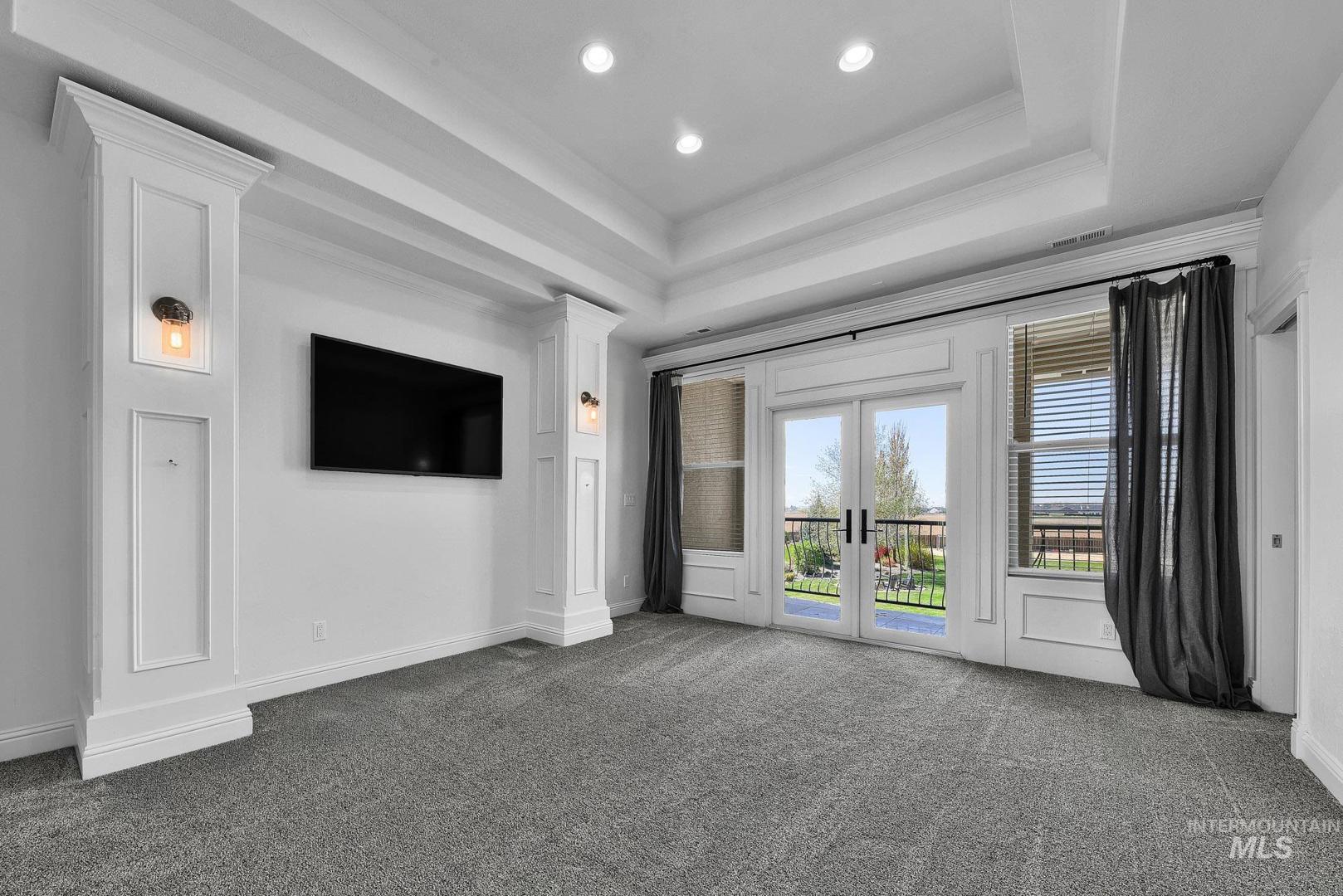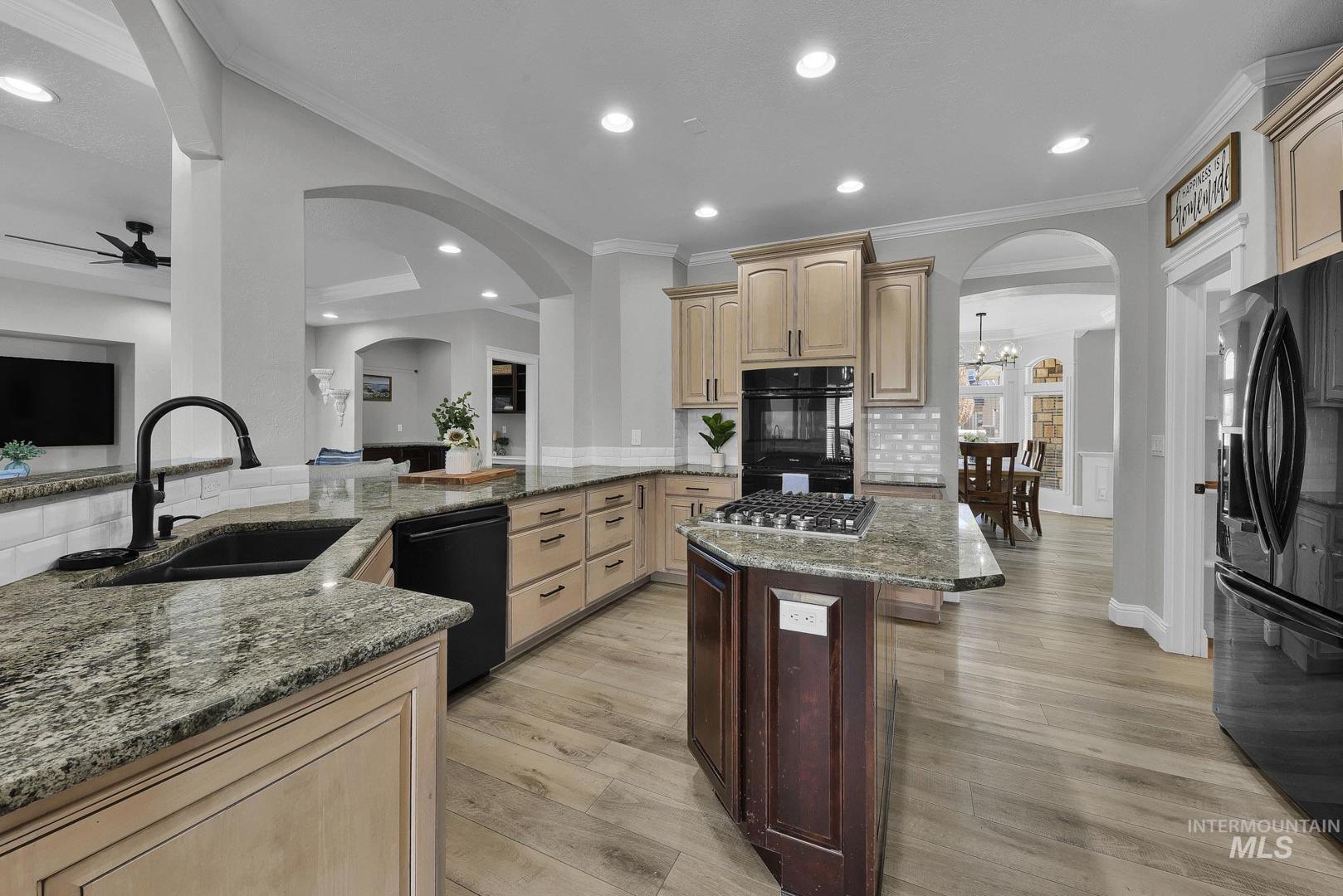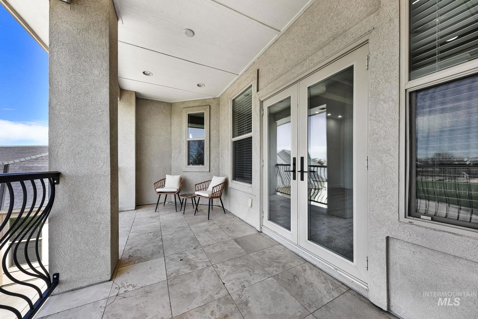 Experience luxury living on a full acre in southwest Meridian with convenient access to the freeway, shopping, and nearby schools like Gem Prep, as well as parks including Discovery Park. This 5,500+ sq ft home is set in a coveted neighborhood and offers five spacious bedrooms, each with walk-in closets, and six bathrooms. The main level features a grand primary suite with a tile walk-in shower, soaker tub, and a double-sided fireplace that opens to a private sitting area, along with a junior ensuite featuring an accessible shower. The kitchen is designed for both function and style, complete with a gas cooktop, double ovens, granite countertops, full tile backsplash, and a large pantry, flowing seamlessly into multiple living and entertaining spaces, including a dedicated media area. Throughout the home, you’ll find abundant natural light, detailed millwork, coffered ceilings, custom wainscoting, and gas fireplaces that elevate the overall design. Step outside to expansive outdoor living with sweeping sunset views, mature landscaping, raspberry bushes, peach trees, and garden boxes. The one-acre lot provides flexibility to build a shop, pool, or additional features with HOA approval. Additional highlights include a geothermal heating and cooling system, private well with excellent water quality, community septic, an oversized four-car garage with attic storage.