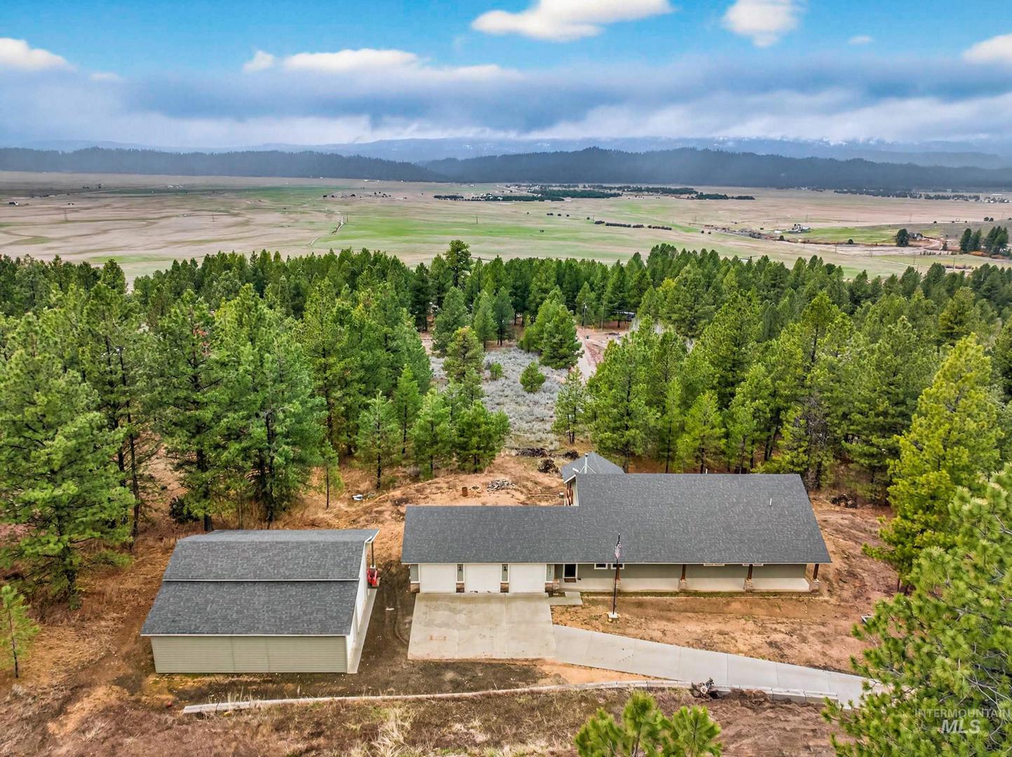 Beautiful custom home built in 2024 on 2.5 acres in gorgeous Round Valley! Offering 2,306 sq ft with an additional 960 sq ft unfinished basement / root cellar, this home features over 1,900 sq ft of main-level living with 3 bedrooms and 2 full baths. Quality finishes throughout include quartz countertops and Thermador appliances, along with a whole house fan and generator hookup for added comfort and peace of mind. Large walk in pantry and plenty of storage throughout. The property is fully equipped for all your needs with a 3-car attached garage, plus an impressive 40’x40’ shop with a 14’ door. Two RV hookups with water, sewer, and 30-amp power provide excellent flexibility for guests or recreational use. Enjoy peaceful country living just 1.5 hours from Boise, with sweeping views, abundant wildlife, and stunning starry night skies. No HOA and exclusive access to BLM and National Forest land just up the street make this a rare opportunity for outdoor enthusiasts.
