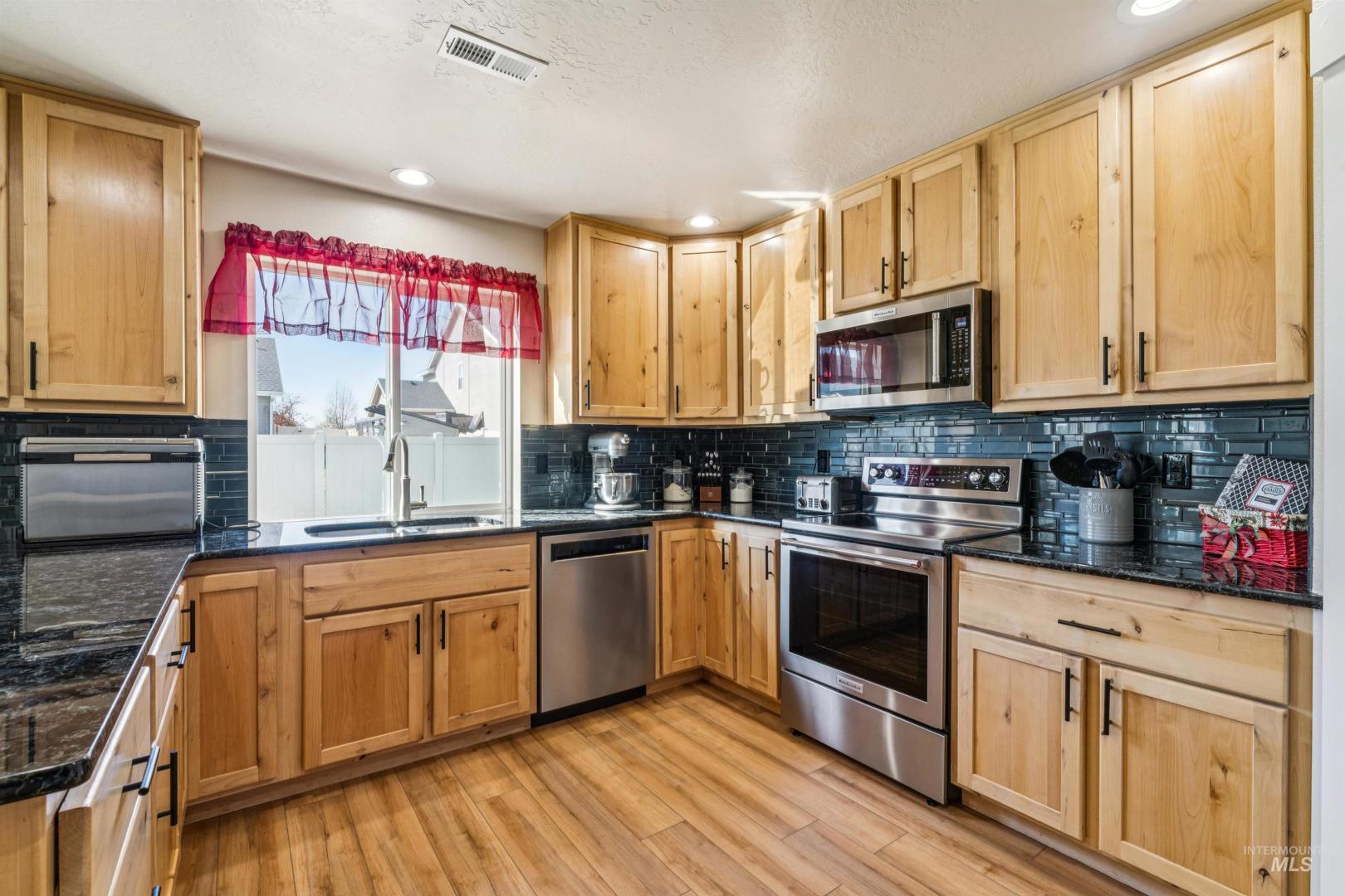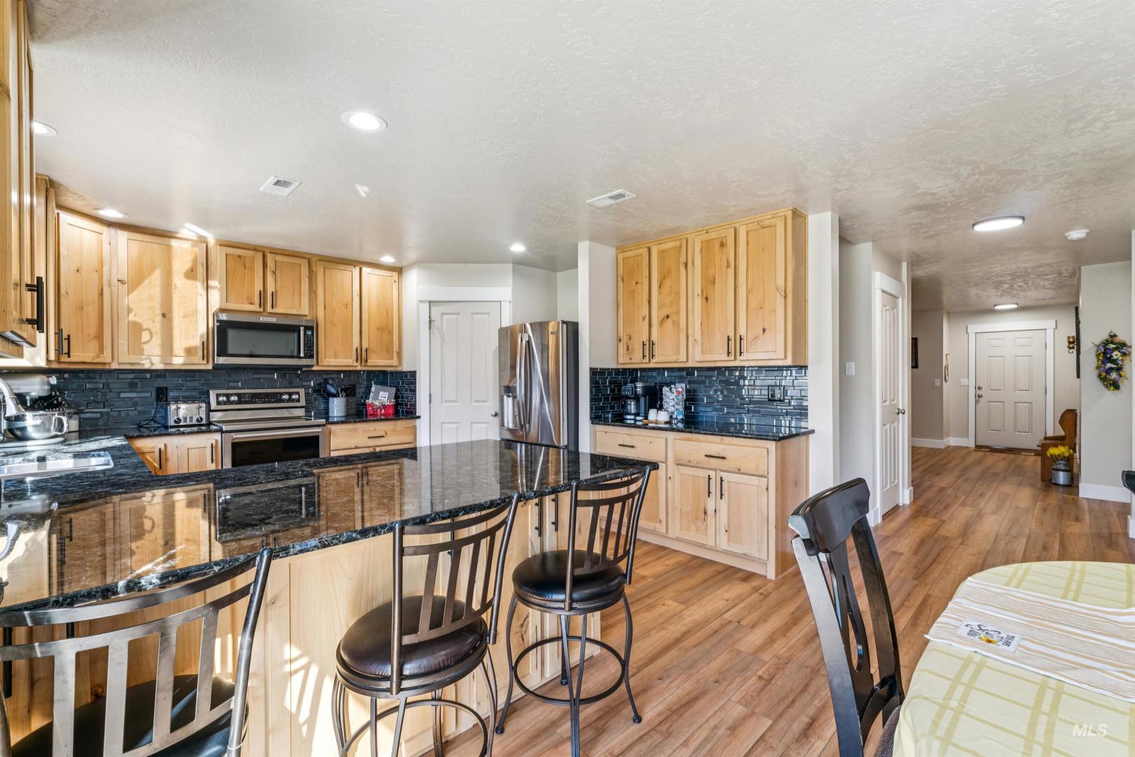 Discover the perfect blend of comfort, style, and location in this beautifully maintained home in the heart of Star. Lightly lived in and exceptionally cared for, this spacious 4-bedroom, 2.5-bathroom residence offers multiple living areas designed for both relaxation and entertaining. Step into a custom kitchen featuring all-wood, custom-built cabinetry, sleek granite countertops, and a full tile backsplash—crafted for both beauty and durability. The home boasts new LVP flooring on the main level and in all bathrooms, new carpet upstairs, along with thoughtful recent updates throughout, giving it a fresh, modern feel. Upstairs, you’ll find generously sized bedrooms and plenty of flexible space for everyone to spread out. The 3-car tandem garage provides exceptional storage, hobby, or parking options. Perfectly positioned on a premium lot, this home sits directly across from a peaceful park—ideal for evening walks, playtime, or morning coffee with a view.