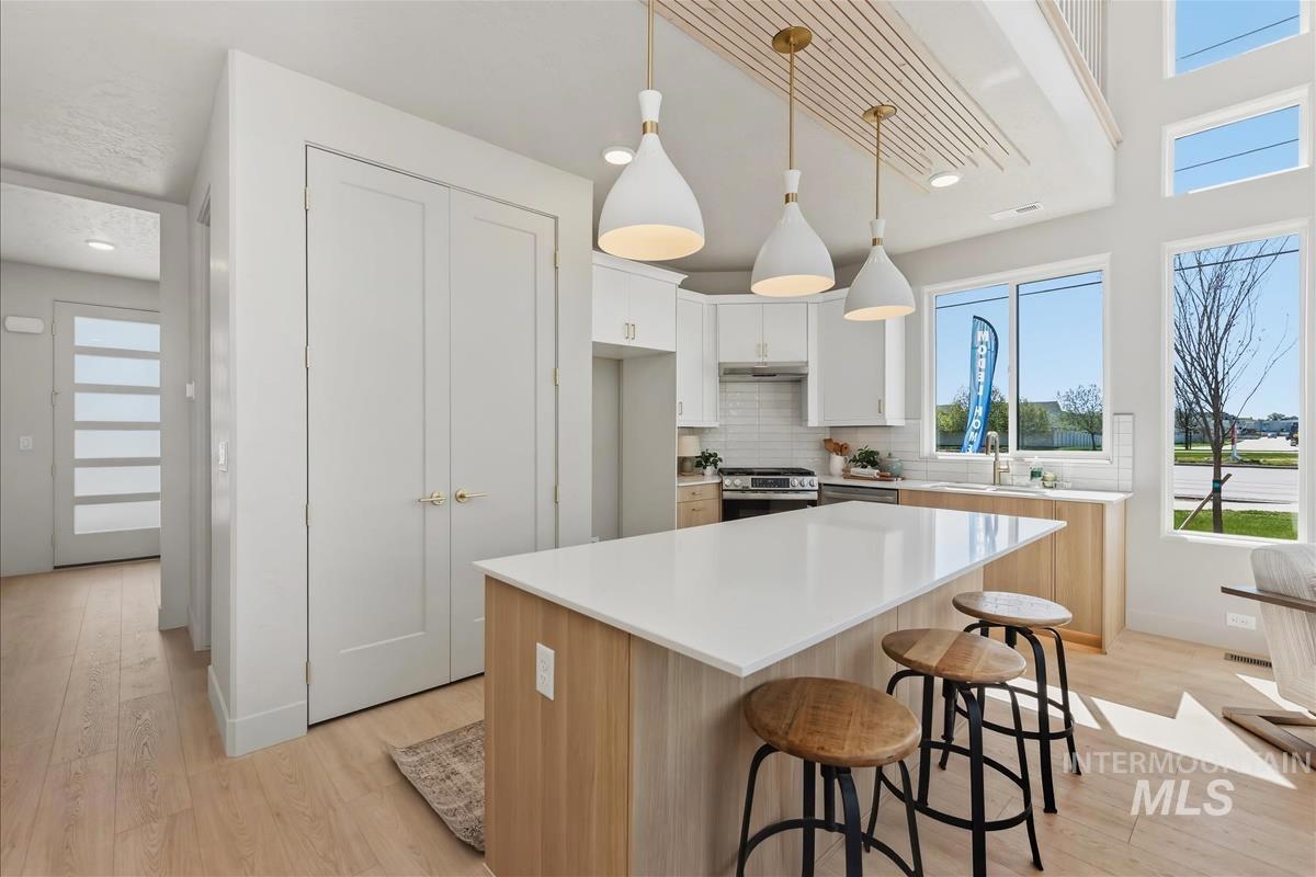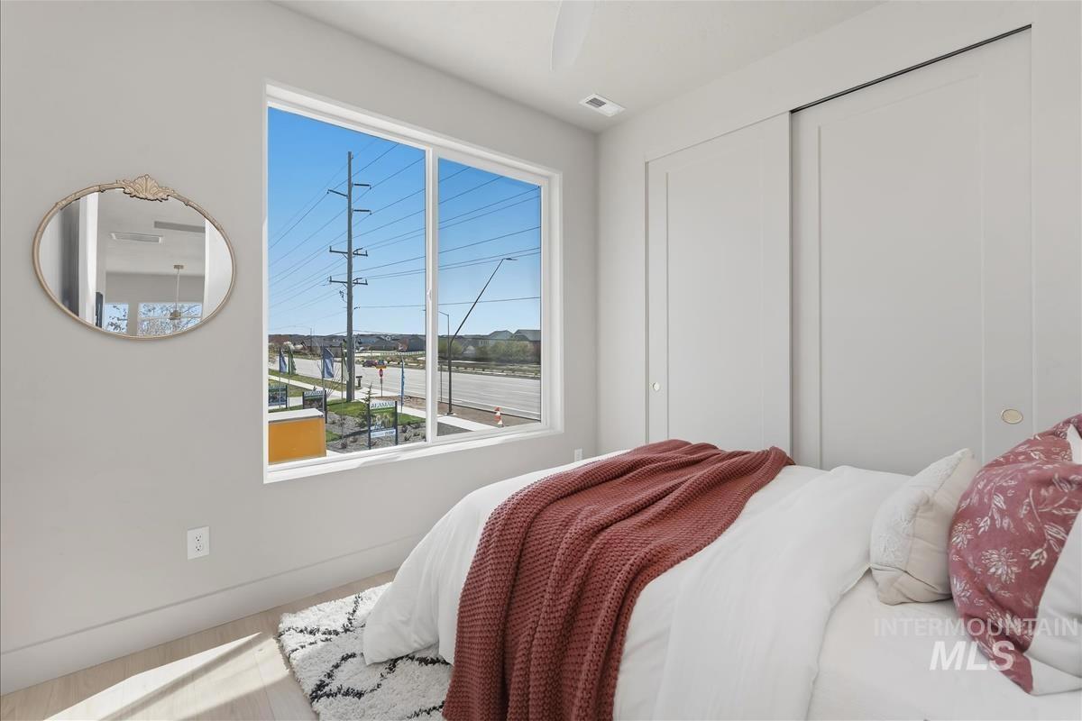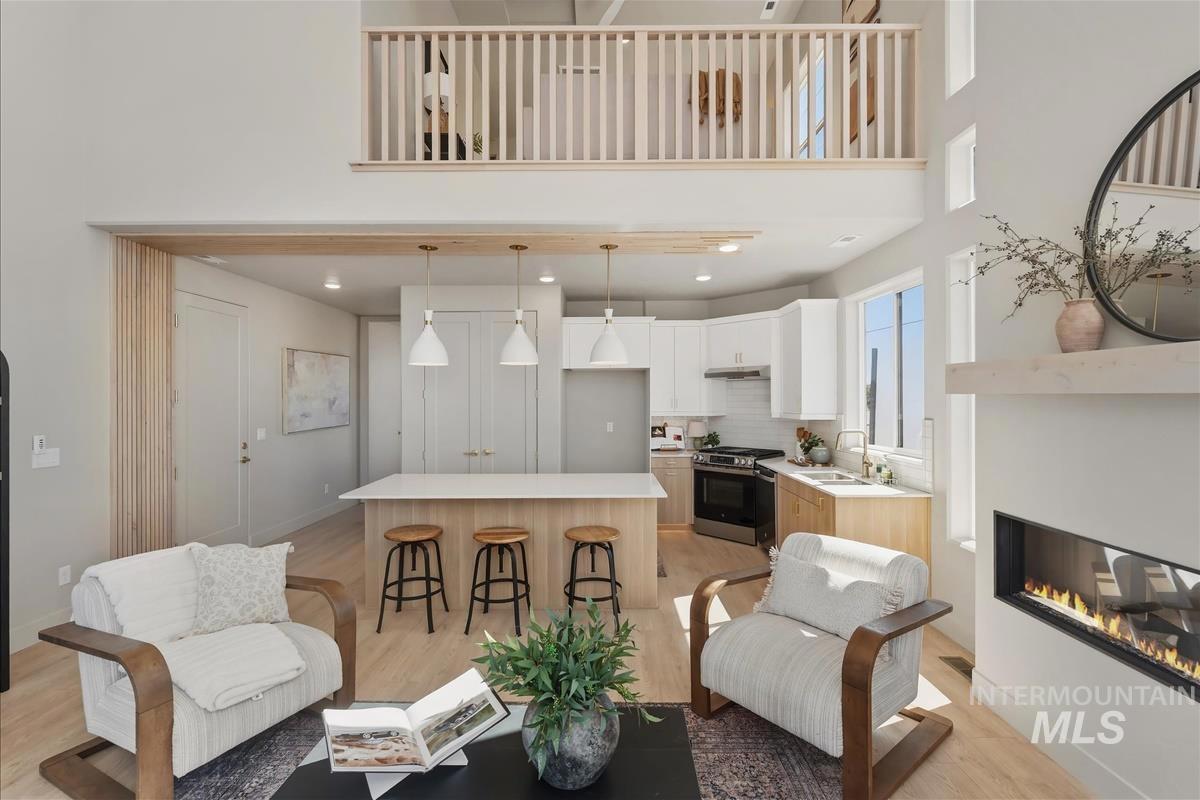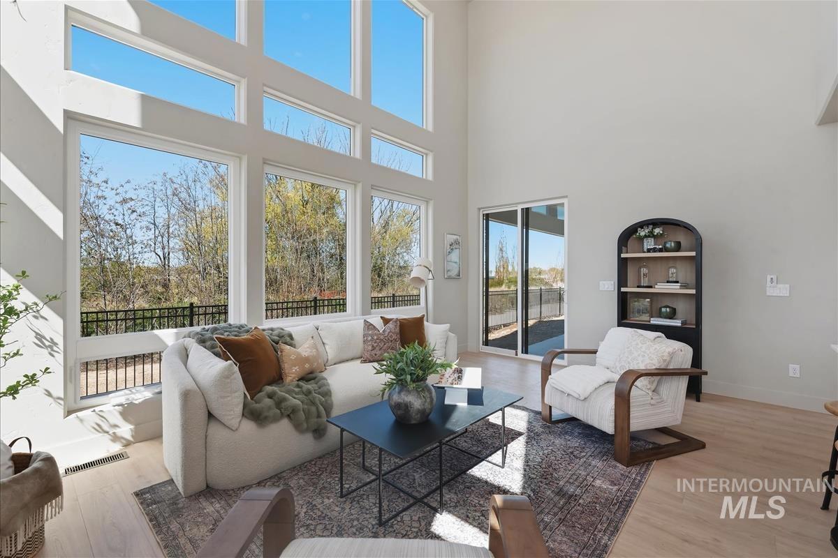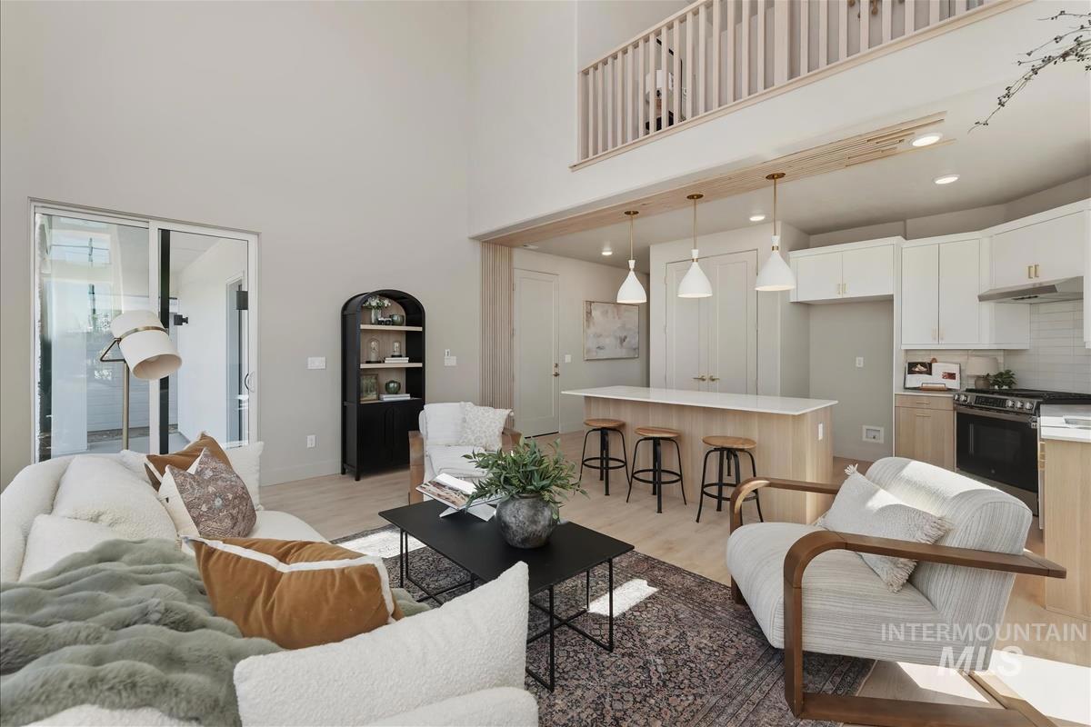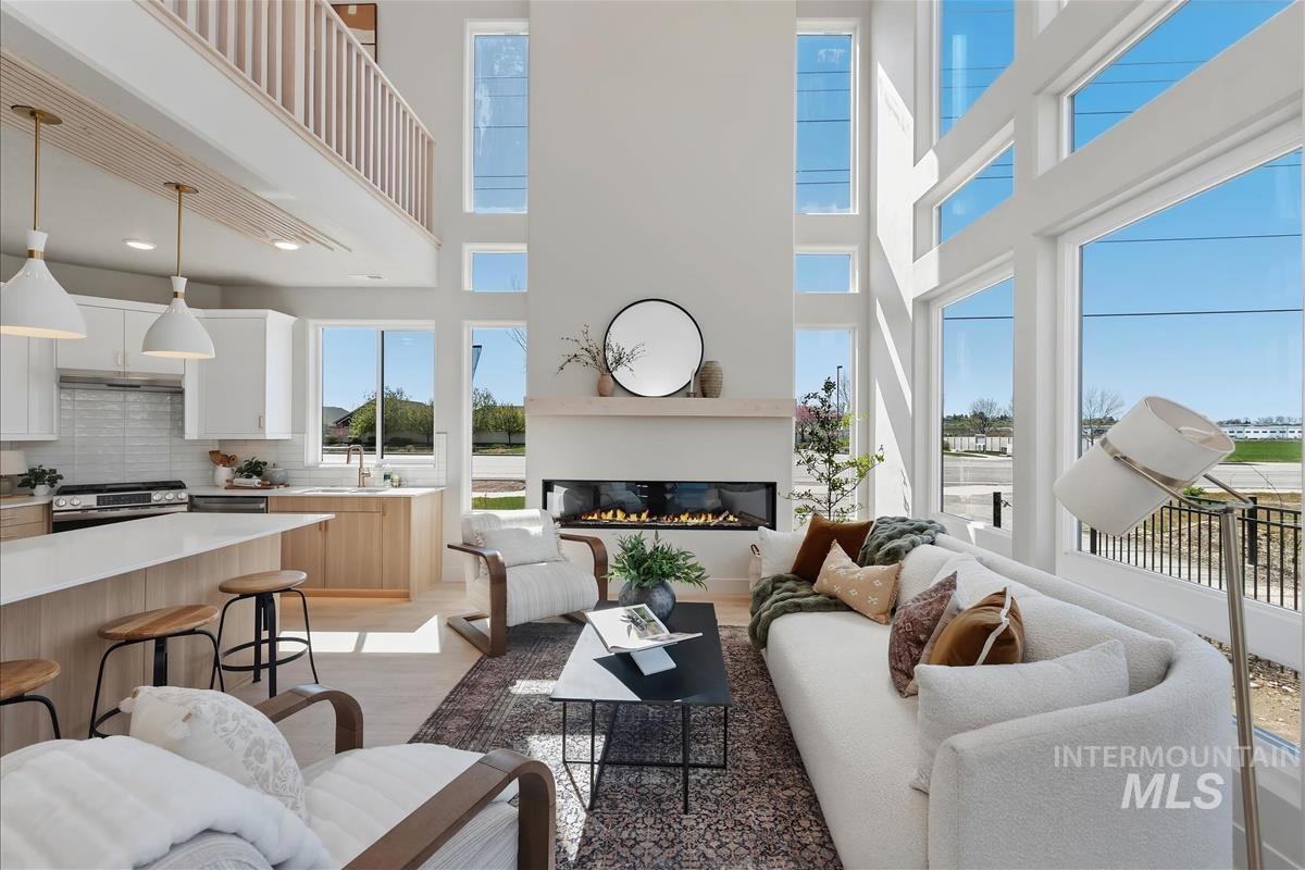 Experience Scandinavian style in this move-in ready home in Meridian’s sought-after Alamar community. Built by Midas Corp, the “Ingrid I” floorplan features clean lines, warm wood accents & soft, airy tones to create a calm, inviting atmosphere. Conveniently located near I-84, Scheels, Compass Charter School & future District at Ten Mile. The main level offers a flex space in front, perfect for a dining space, office or separate seating area. The open great room with soaring 2-story ceilings & expansive windows opens up to the kitchen with tons of natural light pouring in. A slider leads to a covered patio overlooking Purdam Gulch providing indoor/outdoor living in a peaceful, natural setting with birds & occasional ducks. A Dutch door under the stairs adds a charming space for pets, storage or a play area. Upstairs, the primary suite features a private balcony, while a secondary bedroom includes its own balcony. An open loft provides space for an office, lounge or playroom. Community amenities include a dog park. Thoughtful design, quality finishes & prime location complete this home.