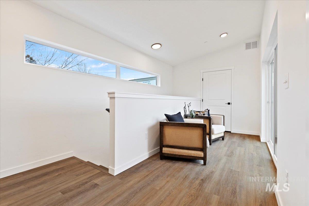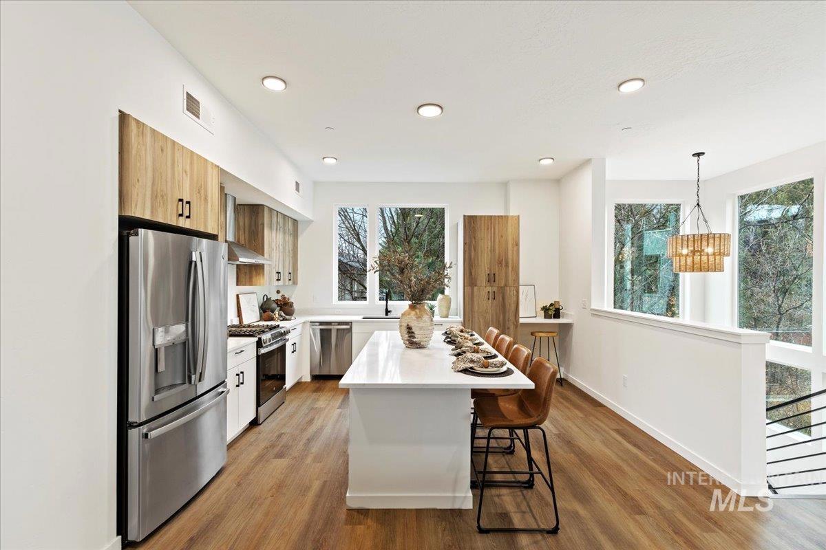 A Prime Residential Income Opportunity! Boise23 delivers high-style, low-maintenance living in modern, vertically designed townhomes; an ideal option for tenants seeking luxury close to downtown. These homes feature efficient floor plans, elevated finishes, and seamless indoor/outdoor integration with a private yard, covered balcony, and expansive rooftop patio. Natural light pours through large windows across all levels. The main floor includes a welcoming foyer, versatile bonus room with yard access, and a spacious 2-car garage. The second level offers an open-concept kitchen, dining, and living area—perfect for everyday living or entertaining. Upstairs, both bedrooms include ensuite bathrooms, highlighted by a luxe primary suite with a soaking tub and walk-in closet. The fourth-floor rooftop parlor adds exceptional rentability with a wet bar, third bedroom, full bath, and panoramic views—ideal for hosting, relaxing, or maximizing tenant appeal. Add sophistication to your portfolio!
