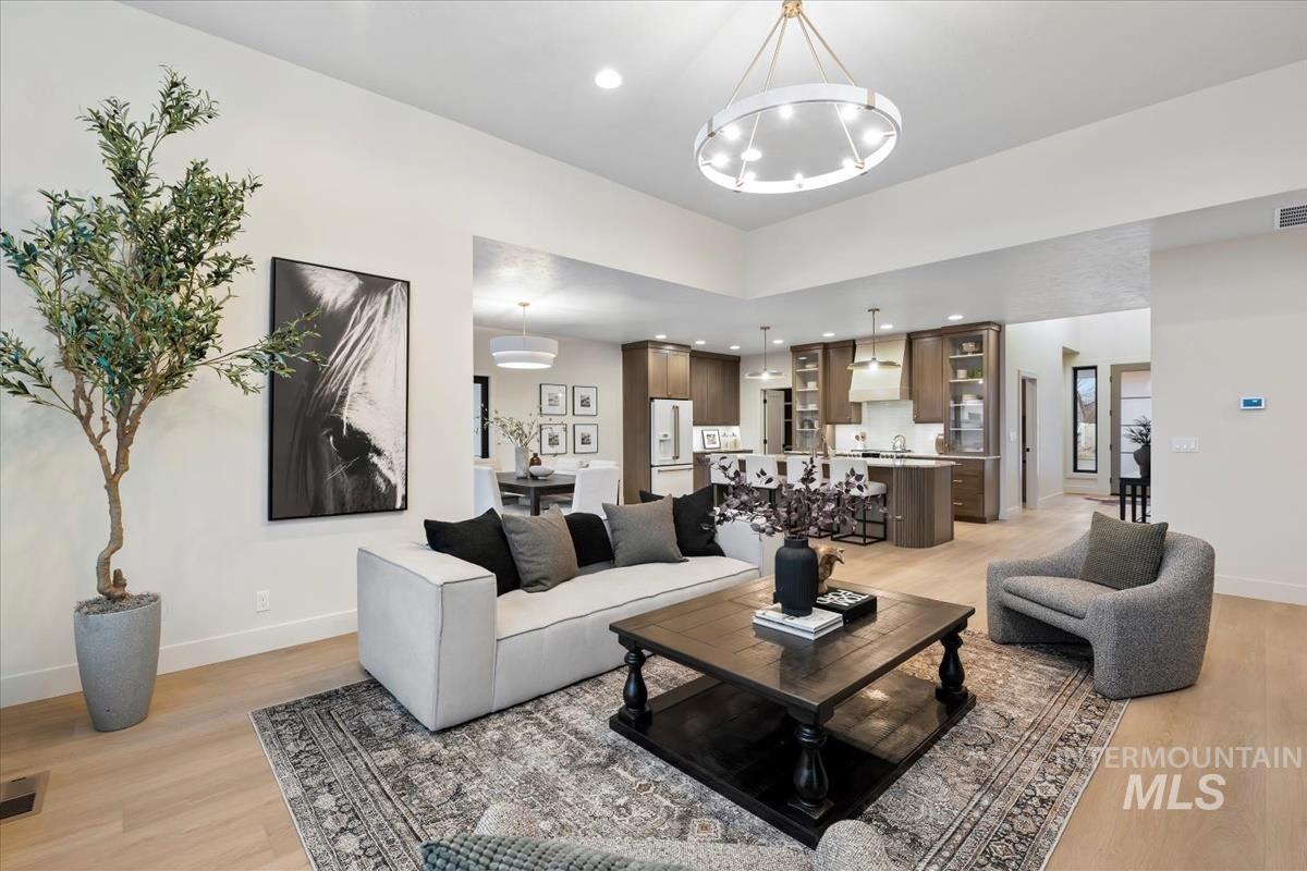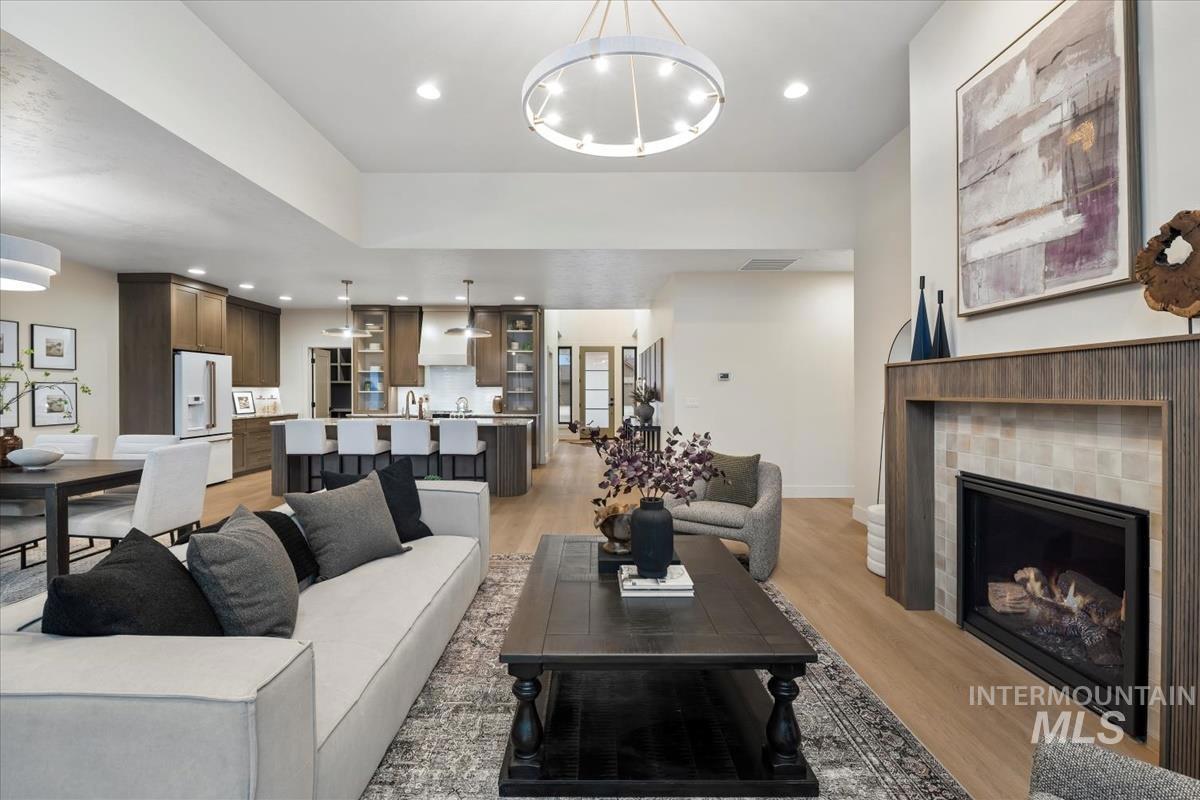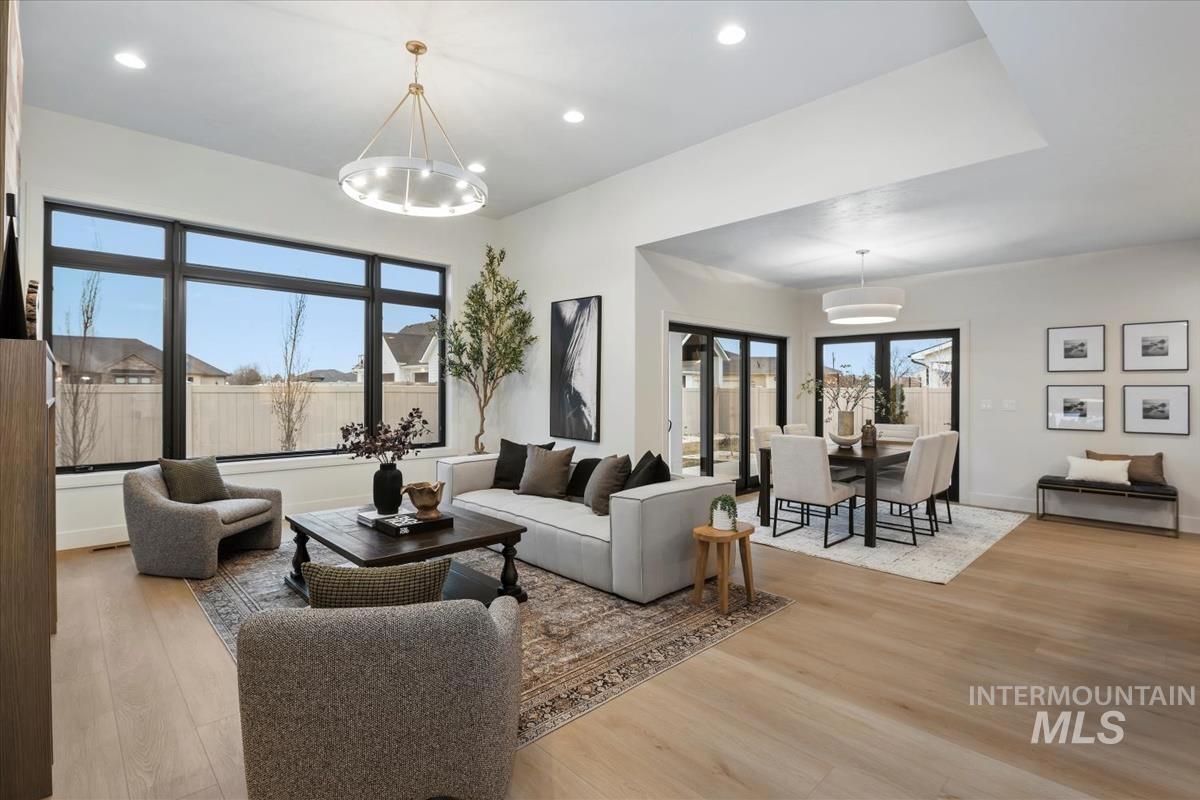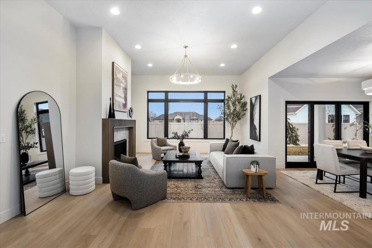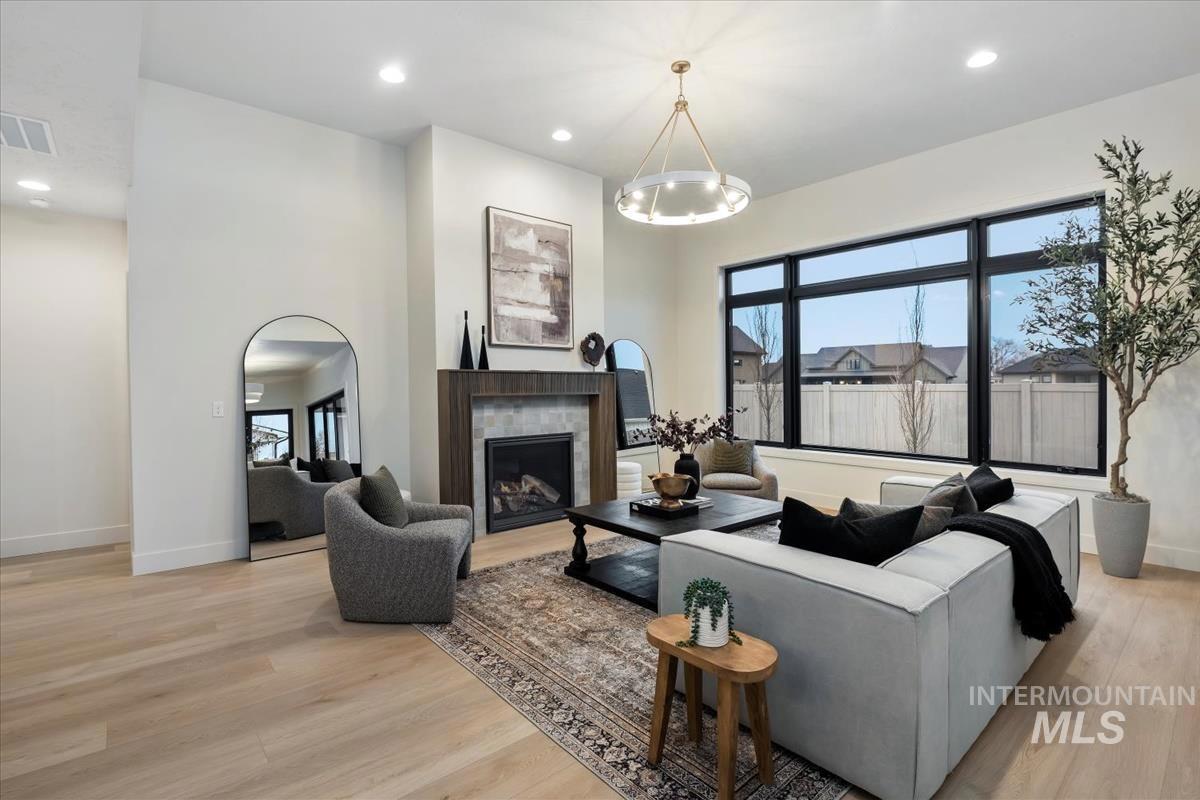 Newly constructed modern masterpiece by O’Dell Construction pairs elevated designer finishes with a thoughtful layout, nestled on a fully landscaped lot. Designed for both style and comfort, the open-concept layout is centered around a striking chef’s kitchen equipped with Café Series appliances, including a gas range and refrigerator. A spacious walk-in pantry with appliance shelving complements red oak soft-close cabinetry, pull-out spice storage, and thoughtfully integrated utensil drawers—where refined aesthetics meet daily practicality. The custom-trimmed island anchors the space and flows effortlessly into the great room, where a cozy gas fireplace sets the tone for gatherings. Throughout the home, black-trim Andersen windows offer bold contrast against light-toned LVP flooring, while a custom lighting package enhances the home’s cohesive, designer appeal. The master retreat serves as a private sanctuary, featuring a spa-inspired bathroom with a freestanding soaking tub, dual vanities, and a beautifully tiled walk-in shower with dual showerheads. Enjoy seasonal gatherings beneath a covered patio with ceiling fan overlooking a lush lawn supported by an automatic sprinkler system and pressurized irrigation water. Completing the property is an oversized three-car garage ideal for storage or projects, along with a generous side yard providing convenient RV parking.