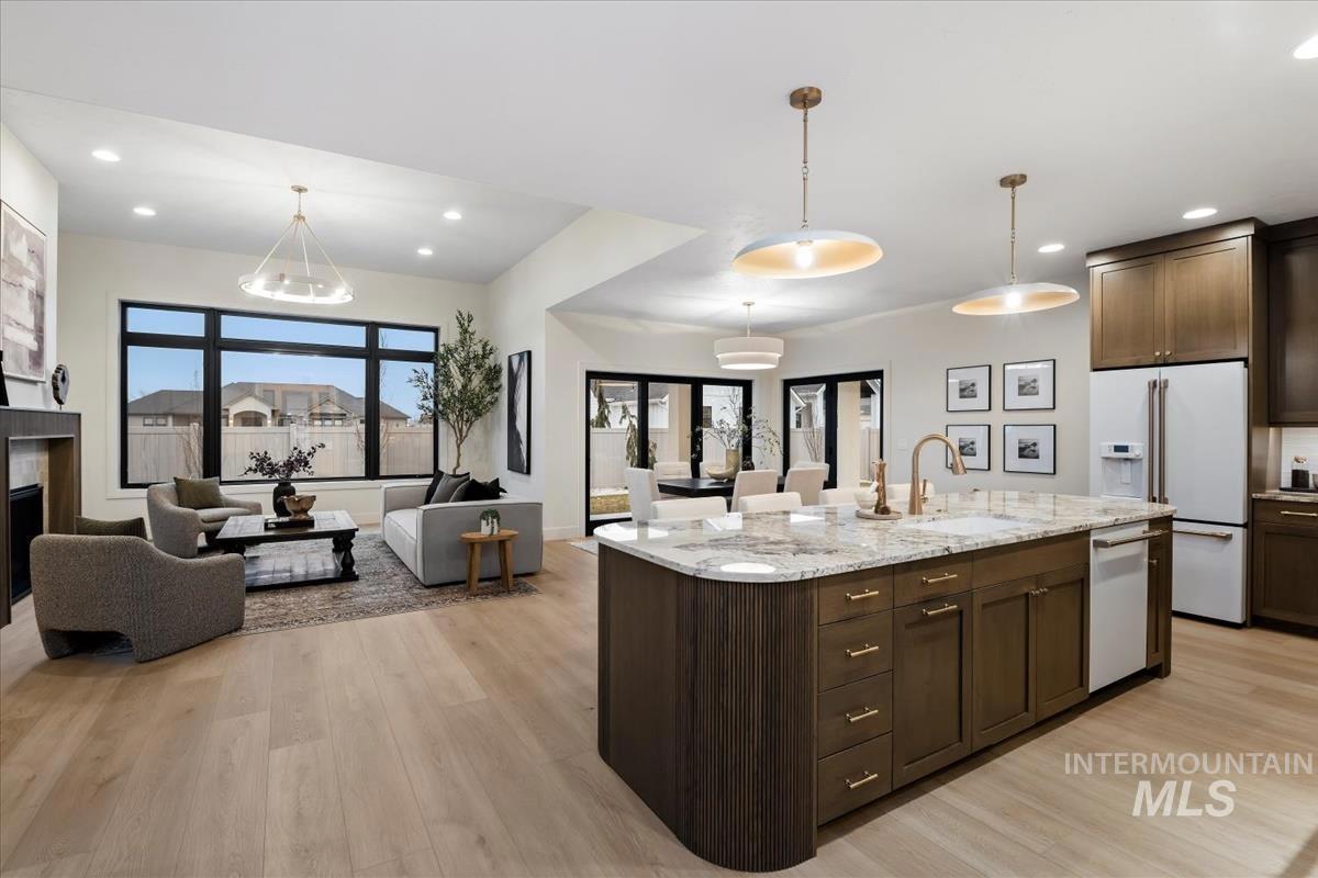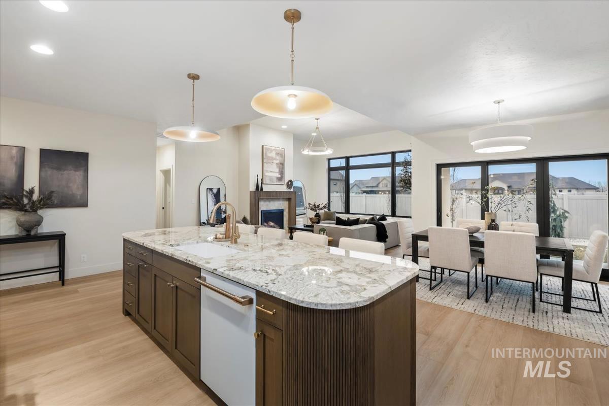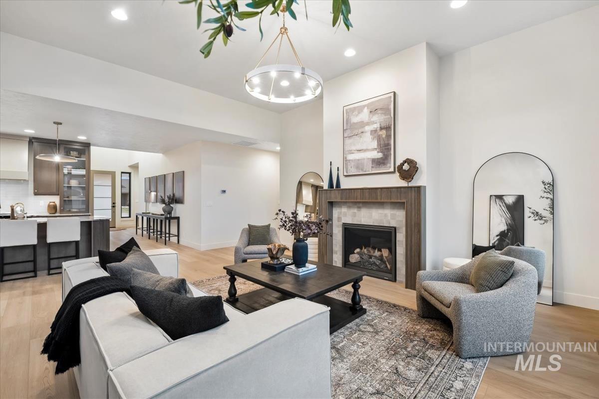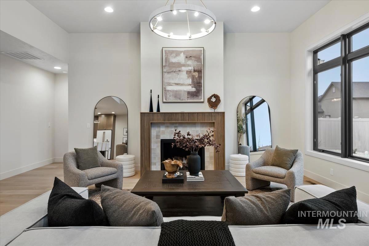 Newly constructed modern masterpiece by O’Dell Construction pairs elevated designer finishes with a thoughtful layout, nestled on a fully landscaped lot. Designed for both style and comfort, the open-concept layout is centered around a striking chef’s kitchen equipped with Café Series appliances, including a gas range and refrigerator. A spacious walk-in pantry with appliance shelving complements red oak soft-close cabinetry, pull-out spice storage, and thoughtfully integrated utensil drawers—where refined aesthetics meet daily practicality. The custom-trimmed island anchors the space and flows effortlessly into the great room, where a cozy gas fireplace sets the tone for gatherings. Throughout the home, black-trim Andersen windows offer bold contrast against light-toned LVP flooring, while a custom lighting package enhances the home’s cohesive, designer appeal. The master retreat serves as a private sanctuary, featuring a spa-inspired bathroom with a freestanding soaking tub, dual vanities, and a beautifully tiled walk-in shower with dual showerheads. Enjoy seasonal gatherings beneath a covered patio with ceiling fan overlooking a lush lawn supported by an automatic sprinkler system and pressurized irrigation water. Completing the property is an oversized three-car garage ideal for storage or projects, along with a generous side yard providing convenient RV parking.