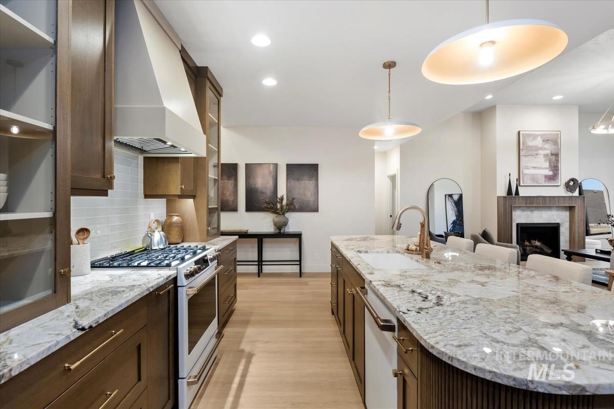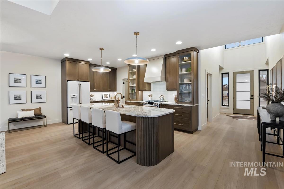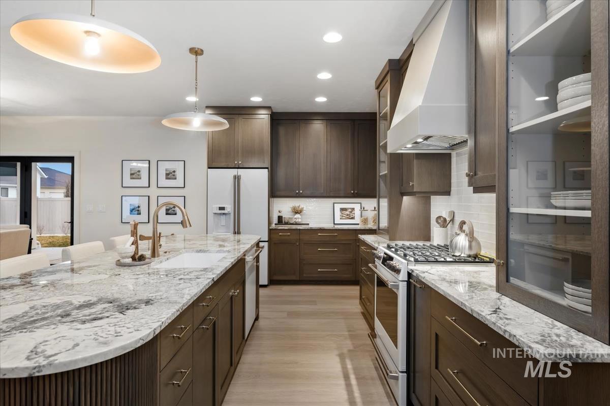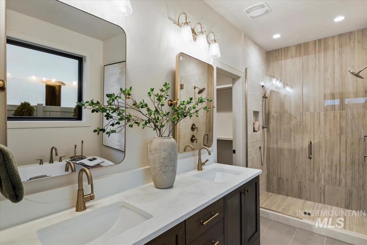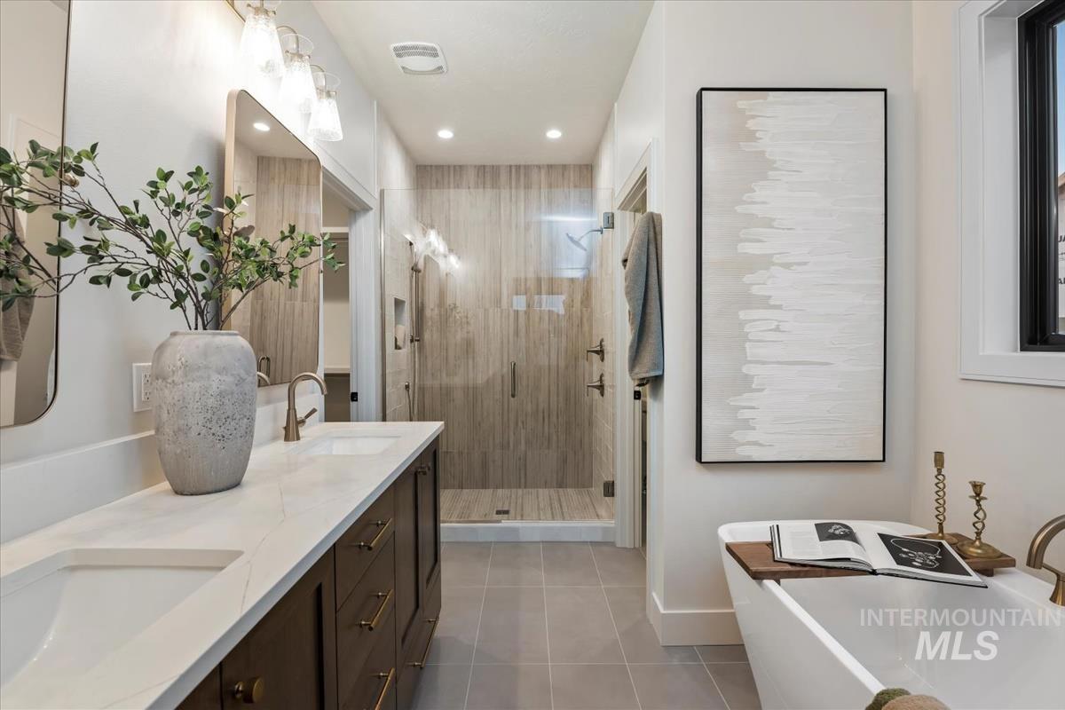 Newly constructed modern masterpiece by O’Dell Construction pairs elevated designer finishes with a thoughtful layout, nestled on a fully landscaped lot. Designed for both style and comfort, the open-concept layout is centered around a striking chef’s kitchen equipped with Café Series appliances, including a gas range and refrigerator. A spacious walk-in pantry with appliance shelving complements red oak soft-close cabinetry, pull-out spice storage, and thoughtfully integrated utensil drawers—where refined aesthetics meet daily practicality. The custom-trimmed island anchors the space and flows effortlessly into the great room, where a cozy gas fireplace sets the tone for gatherings. Throughout the home, black-trim Andersen windows offer bold contrast against light-toned LVP flooring, while a custom lighting package enhances the home’s cohesive, designer appeal. The master retreat serves as a private sanctuary, featuring a spa-inspired bathroom with a freestanding soaking tub, dual vanities, and a beautifully tiled walk-in shower with dual showerheads. Enjoy seasonal gatherings beneath a covered patio with ceiling fan overlooking a lush lawn supported by an automatic sprinkler system and pressurized irrigation water. Completing the property is an oversized three-car garage ideal for storage or projects, along with a generous side yard providing convenient RV parking.