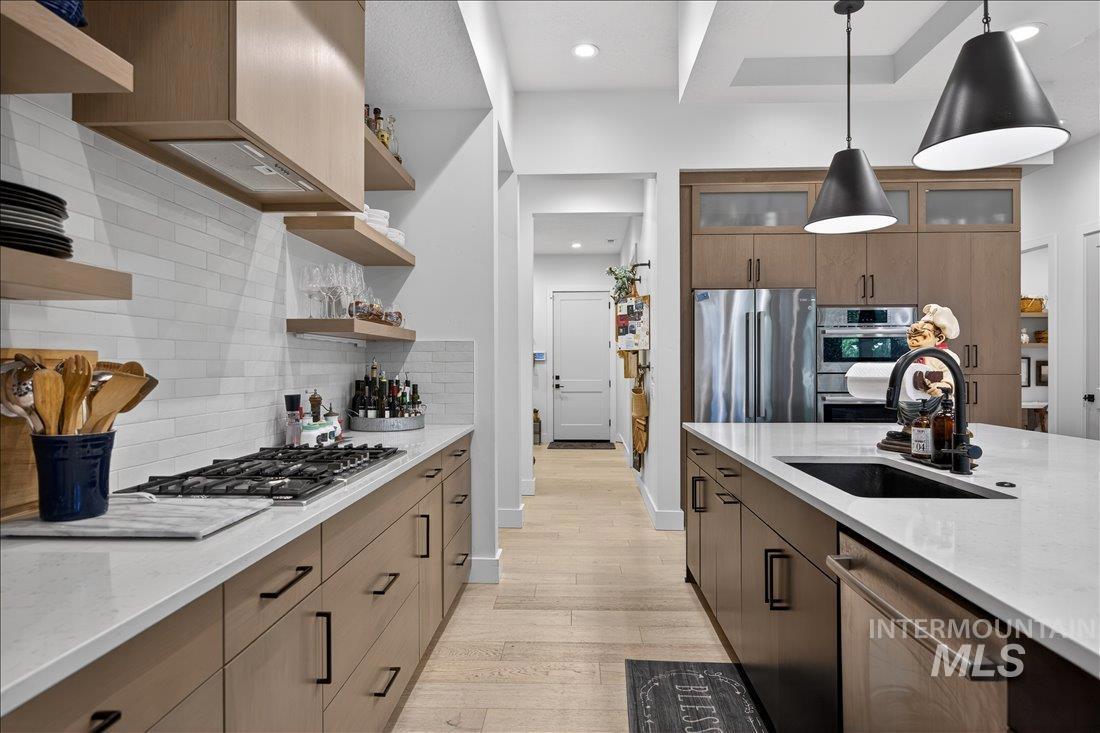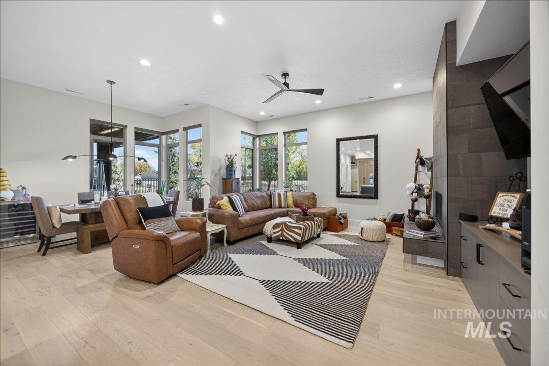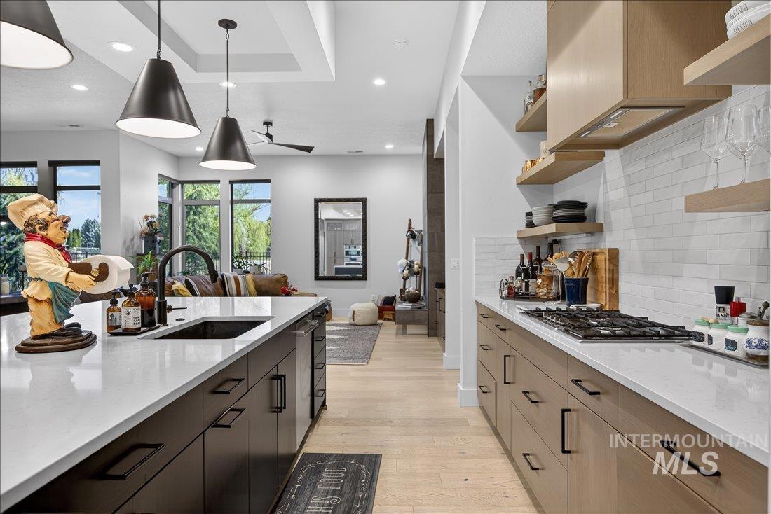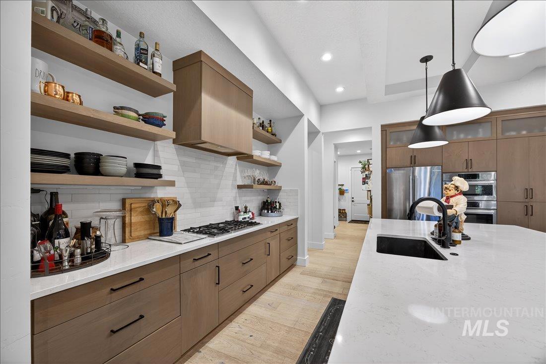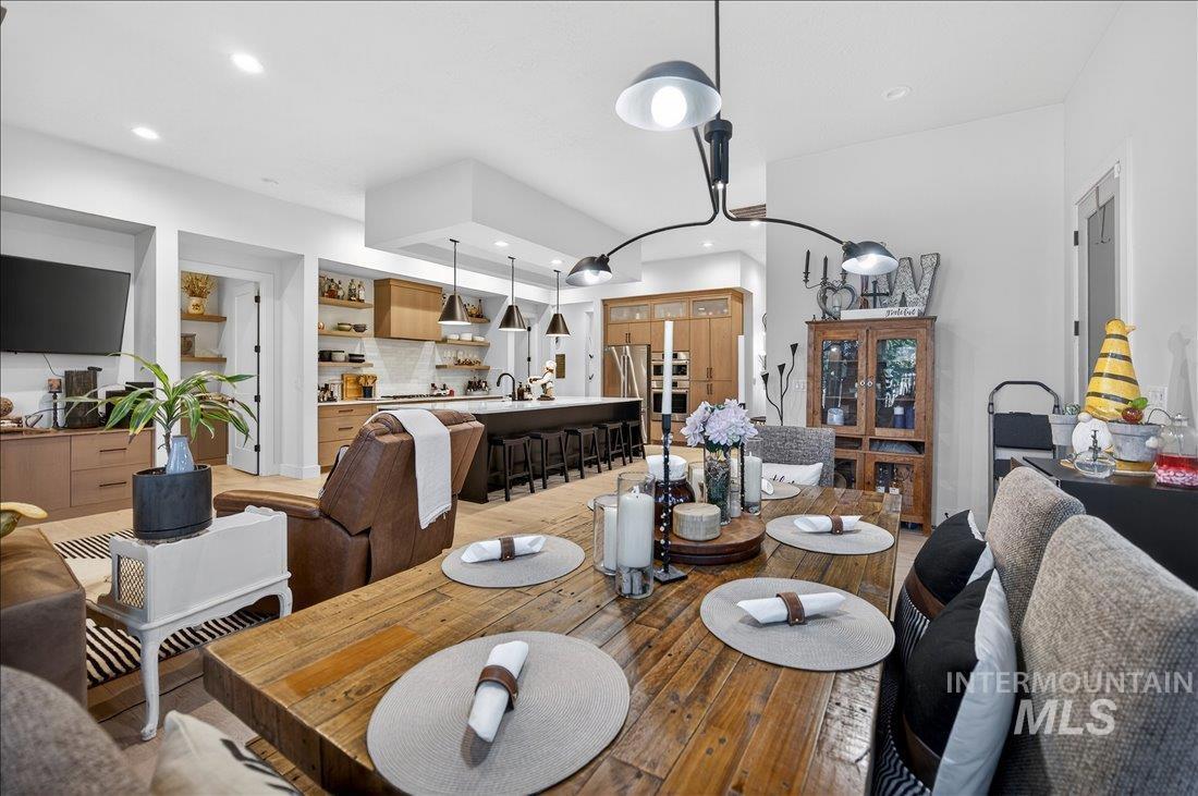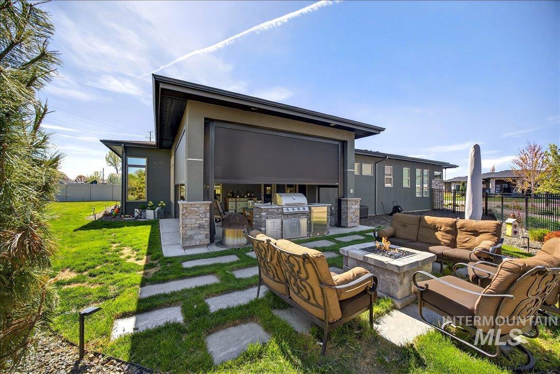 Step through the modern craftsman entry of this meticulously designed Zach Evans Construction home and discover an open floor plan that effortlessly connects living, dining, and an impressive chef`s kitchen. The kitchen commands attention with a quartz island, stainless Bosch appliances, custom cabinetry, and a walk-in pantry that delivers on both form and function. A full-height tiled fireplace anchors the great room, flanked by built-in shelving for character and storage. Four bedrooms offer flexibility for every household, including a Murphy bed guest room and a home office nook with built-in desk and cabinetry. The primary suite features a spa-inspired bath with dual vanities, pendant lighting, soaking tub, and a frameless glass shower with mosaic tile floor. The true showpiece is the outdoor living experience. A covered patio with a roll-up screenwall creates a seamless indoor-outdoor room with ceiling fan, mounted TV, and infrared heaters. Beyond, a stone outdoor kitchen with built-in grill, stepping stone patio with gas fire pit, and a private hot tub enclosure transform the backyard into a year-round retreat. Located in Meridian`s established Movado community, this 2021-built home offers modern finishes, energy-efficient construction, and easy access to shopping, dining, and I-84. Residents enjoy Movado`s pool and amenities. A home designed for living, inside and out.