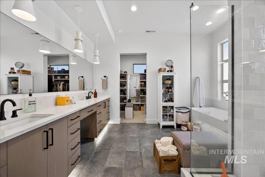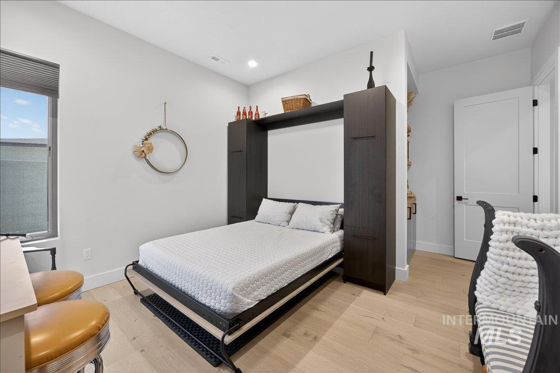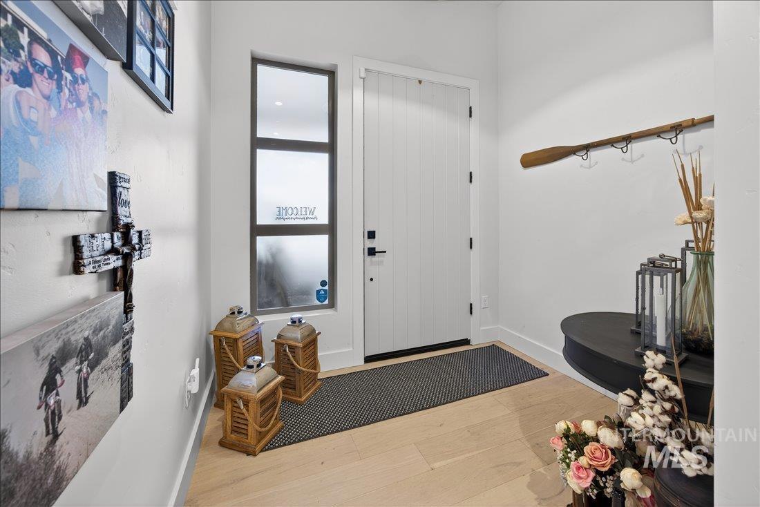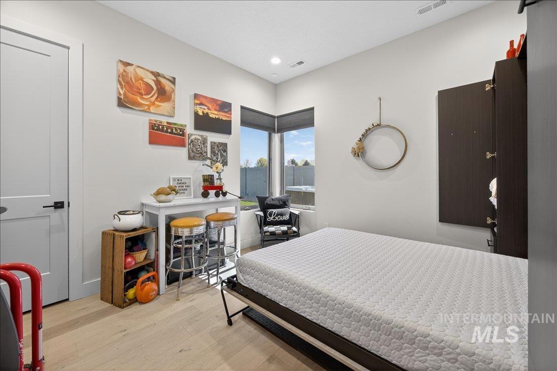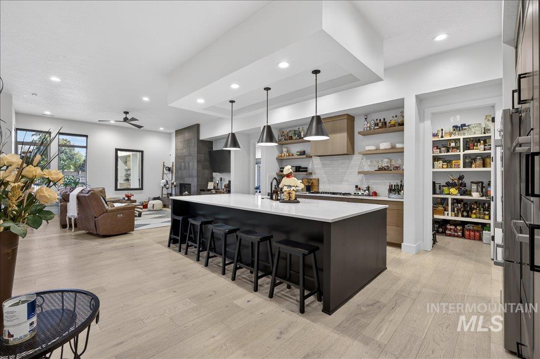 Step through the modern craftsman entry of this meticulously designed Zach Evans Construction home and discover an open floor plan that effortlessly connects living, dining, and an impressive chef`s kitchen. The kitchen commands attention with a quartz island, stainless Bosch appliances, custom cabinetry, and a walk-in pantry that delivers on both form and function. A full-height tiled fireplace anchors the great room, flanked by built-in shelving for character and storage. Four bedrooms offer flexibility for every household, including a Murphy bed guest room and a home office nook with built-in desk and cabinetry. The primary suite features a spa-inspired bath with dual vanities, pendant lighting, soaking tub, and a frameless glass shower with mosaic tile floor. The true showpiece is the outdoor living experience. A covered patio with a roll-up screenwall creates a seamless indoor-outdoor room with ceiling fan, mounted TV, and infrared heaters. Beyond, a stone outdoor kitchen with built-in grill, stepping stone patio with gas fire pit, and a private hot tub enclosure transform the backyard into a year-round retreat. Located in Meridian`s established Movado community, this 2021-built home offers modern finishes, energy-efficient construction, and easy access to shopping, dining, and I-84. Residents enjoy Movado`s pool and amenities. A home designed for living, inside and out.