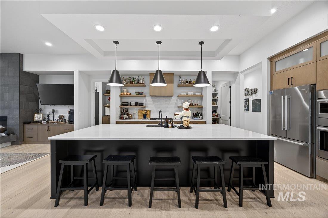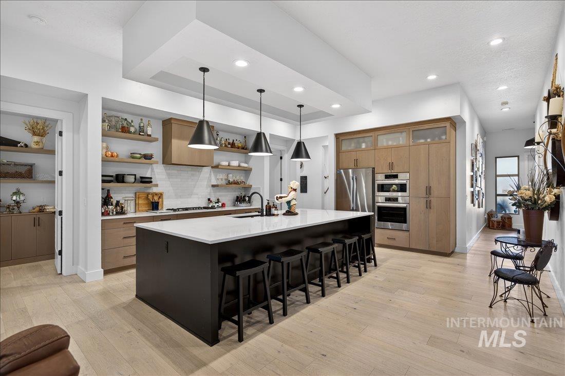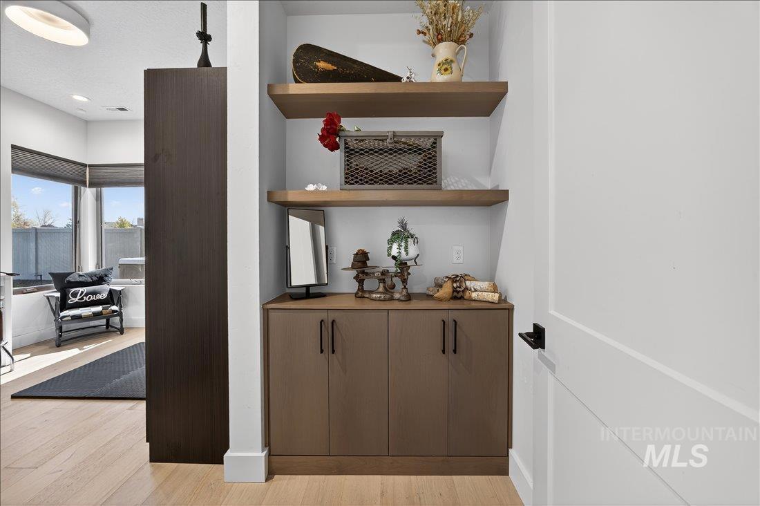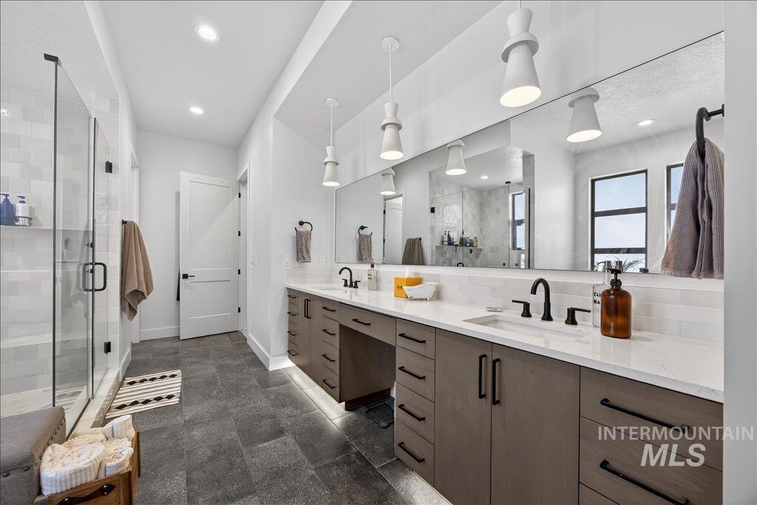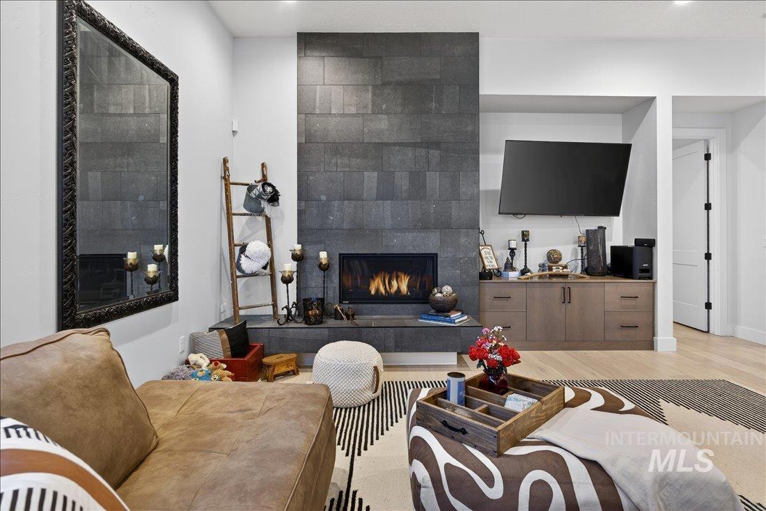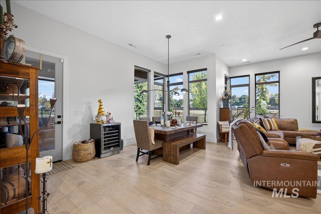 Step through the modern craftsman entry of this meticulously designed Zach Evans Construction home and discover an open floor plan that effortlessly connects living, dining, and an impressive chef`s kitchen. The kitchen commands attention with a quartz island, stainless Bosch appliances, custom cabinetry, and a walk-in pantry that delivers on both form and function. A full-height tiled fireplace anchors the great room, flanked by built-in shelving for character and storage. Four bedrooms offer flexibility for every household, including a Murphy bed guest room and a home office nook with built-in desk and cabinetry. The primary suite features a spa-inspired bath with dual vanities, pendant lighting, soaking tub, and a frameless glass shower with mosaic tile floor. The true showpiece is the outdoor living experience. A covered patio with a roll-up screenwall creates a seamless indoor-outdoor room with ceiling fan, mounted TV, and infrared heaters. Beyond, a stone outdoor kitchen with built-in grill, stepping stone patio with gas fire pit, and a private hot tub enclosure transform the backyard into a year-round retreat. Located in Meridian`s established Movado community, this 2021-built home offers modern finishes, energy-efficient construction, and easy access to shopping, dining, and I-84. Residents enjoy Movado`s pool and amenities. A home designed for living, inside and out.