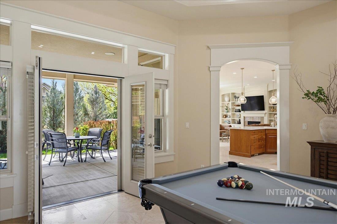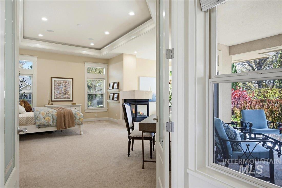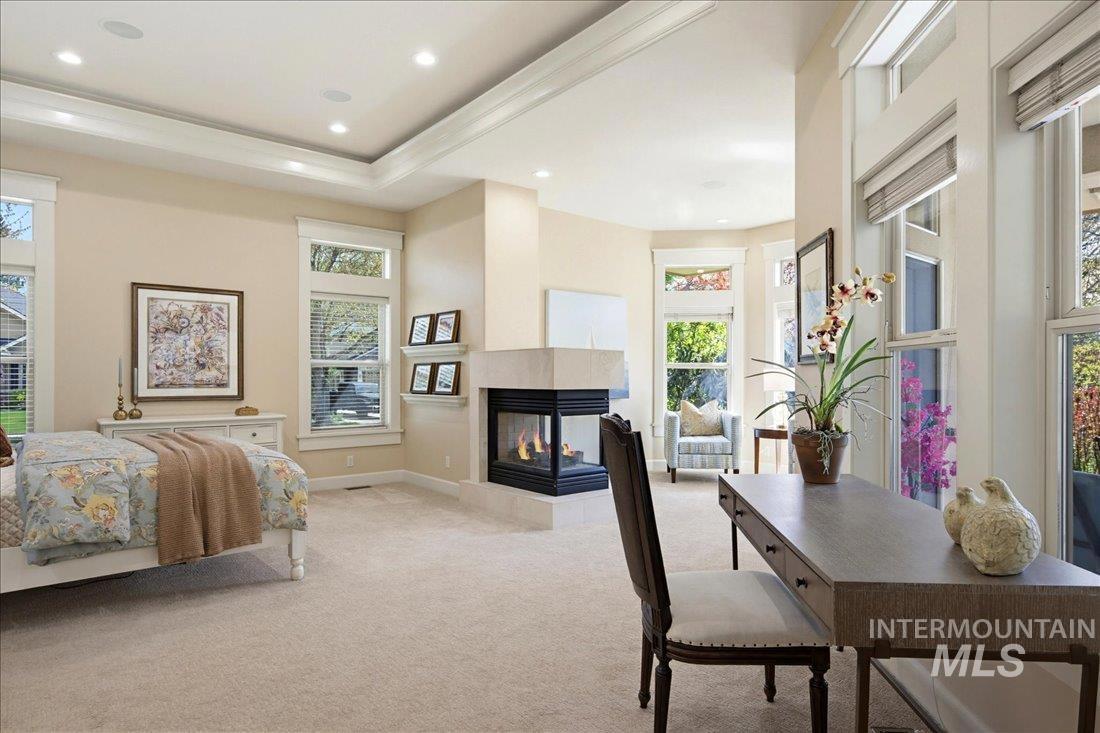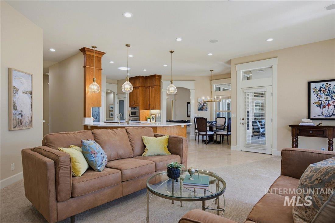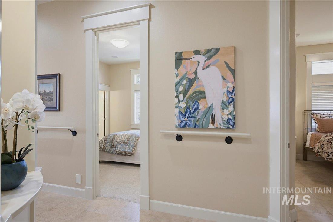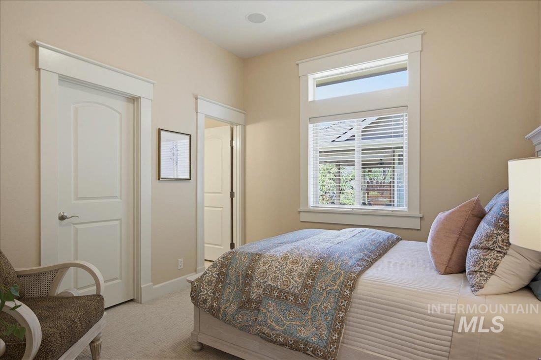 Meticulously maintained single-level home offering 4 bedrooms and 3.5 bathrooms, including three bedrooms with ensuite baths. The oversized primary suite provides a peaceful retreat with a cozy fireside lounge. Large transom windows throughout the home fill the space with natural light and capture beautiful views from the primary suite, living room, kitchen, and family room. Step outside to a spacious covered patio with a gas BBQ included—perfect for entertaining or relaxing while enjoying miles of neighborhood walking paths just beyond the patio in a tranquil greenbelt setting with mature trees. The oversized 3-car garage features impressive floor-to-ceiling cabinetry and a built-in workbench, offering exceptional storage and workspace. Ideally located just minutes from downtown Eagle.