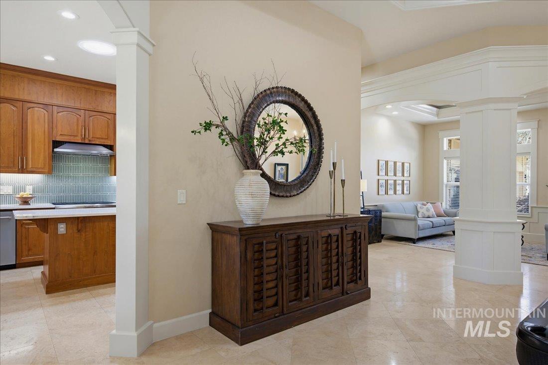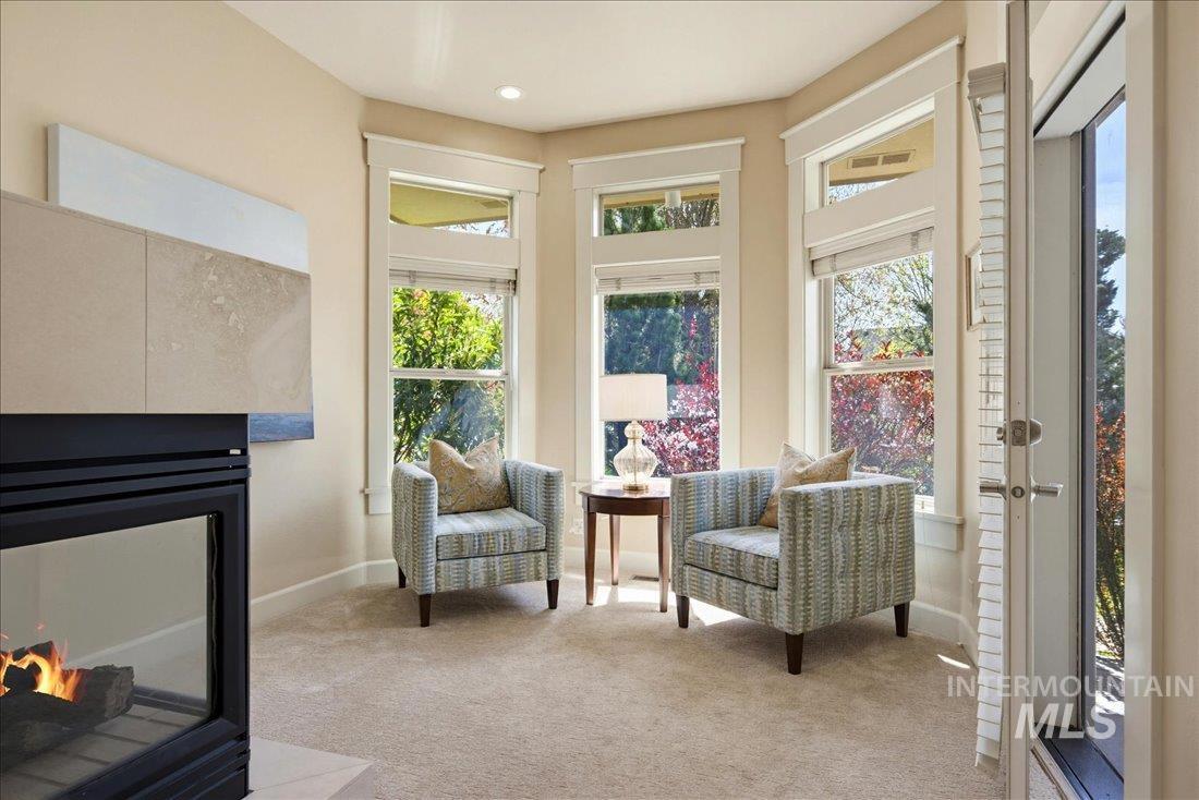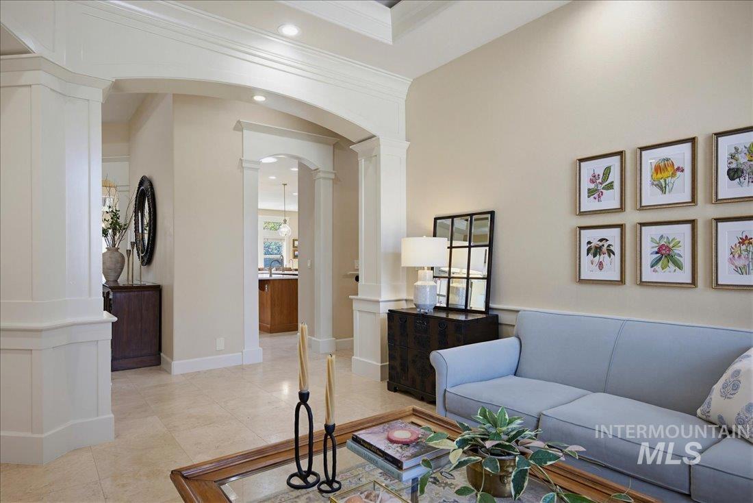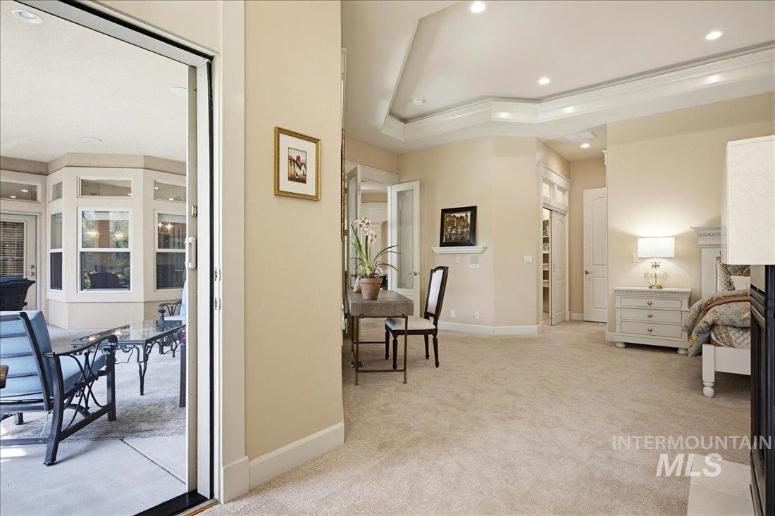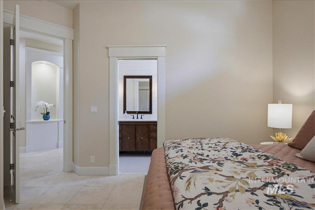 Meticulously maintained single-level home offering 4 bedrooms and 3.5 bathrooms, including three bedrooms with ensuite baths. The oversized primary suite provides a peaceful retreat with a cozy fireside lounge. Large transom windows throughout the home fill the space with natural light and capture beautiful views from the primary suite, living room, kitchen, and family room. Step outside to a spacious covered patio with a gas BBQ included—perfect for entertaining or relaxing while enjoying miles of neighborhood walking paths just beyond the patio in a tranquil greenbelt setting with mature trees. The oversized 3-car garage features impressive floor-to-ceiling cabinetry and a built-in workbench, offering exceptional storage and workspace. Ideally located just minutes from downtown Eagle.