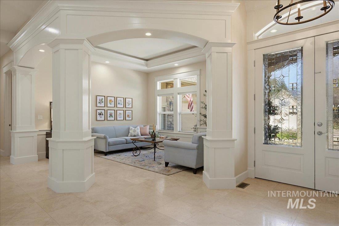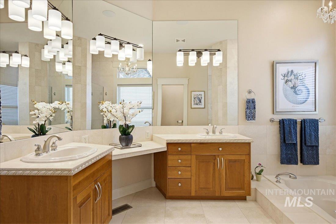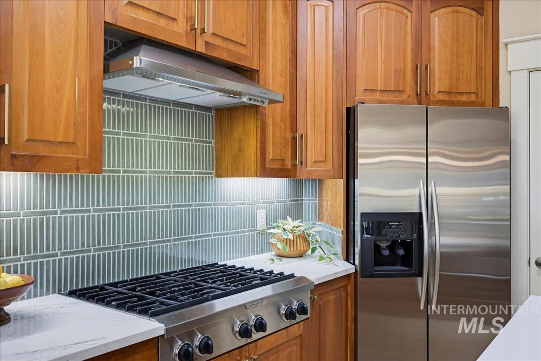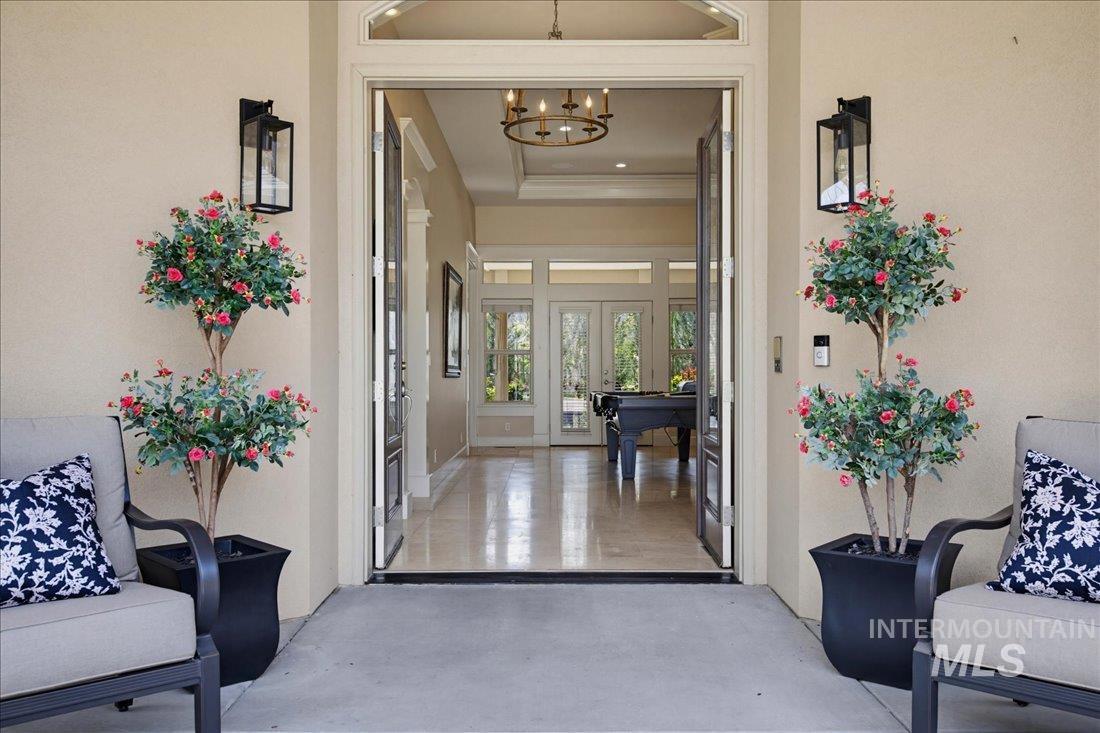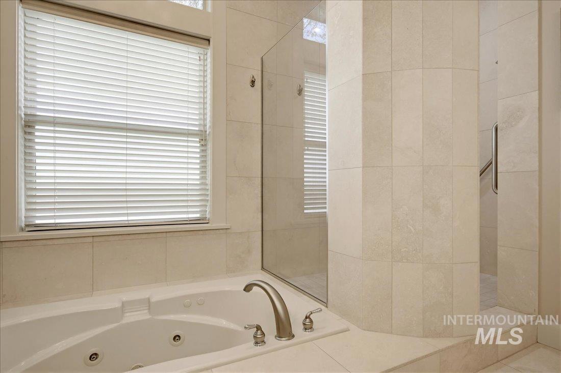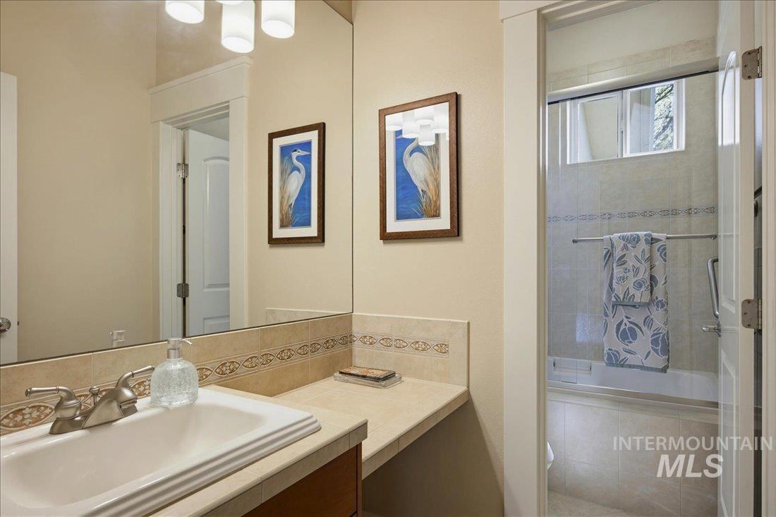 Meticulously maintained single-level home offering 4 bedrooms and 3.5 bathrooms, including three bedrooms with ensuite baths. The oversized primary suite provides a peaceful retreat with a cozy fireside lounge. Large transom windows throughout the home fill the space with natural light and capture beautiful views from the primary suite, living room, kitchen, and family room. Step outside to a spacious covered patio with a gas BBQ included—perfect for entertaining or relaxing while enjoying miles of neighborhood walking paths just beyond the patio in a tranquil greenbelt setting with mature trees. The oversized 3-car garage features impressive floor-to-ceiling cabinetry and a built-in workbench, offering exceptional storage and workspace. Ideally located just minutes from downtown Eagle.