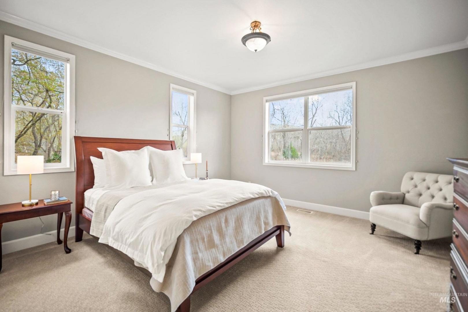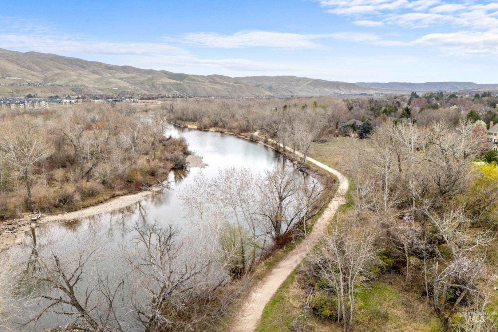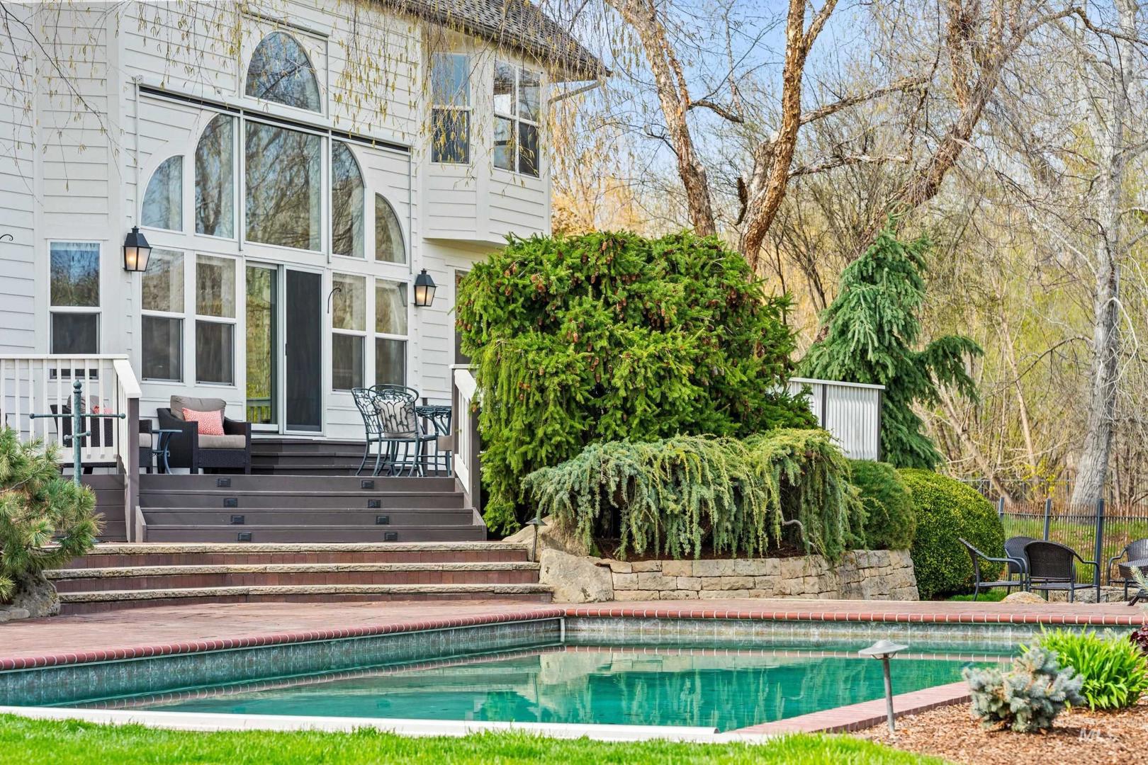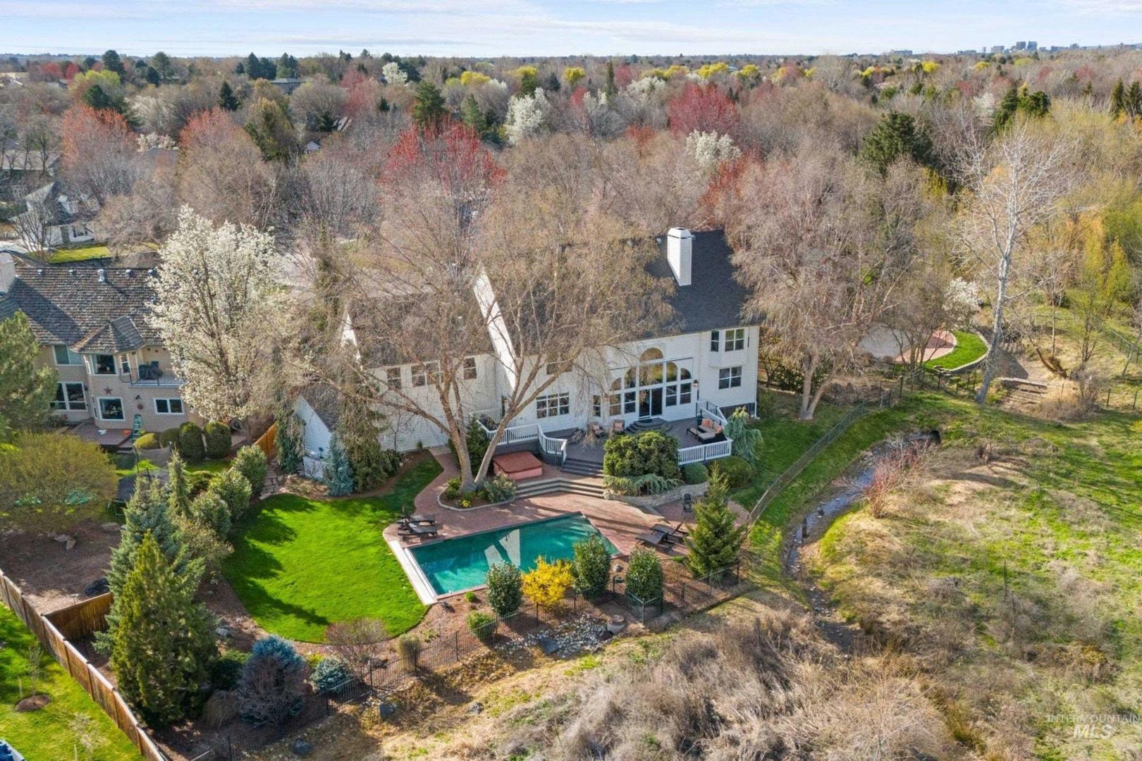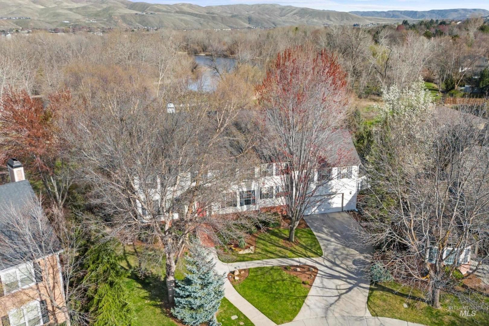 Tucked along a protected wildlife area along the Boise River, this Wood Duck Island home offers privacy, natural beauty, and an exceptional location. The backyard features a saltwater pool and spa, fire pit, tranquil creek, and direct access to the Boise River and Greenbelt. Located on a quiet cul de sac between Barber Park and Bown Crossing, the home provides easy access to recreation, dining, and everyday amenities. Inside, the light filled living room welcomes you with mountain views, a grand staircase, and open living and dining areas. The main level includes a private office and guest bedroom with adjacent full bath. The renovated kitchen features JennAir appliances, central island, quartz countertops, Italian tile flooring, and a pro style convection oven. Upstairs, the primary suite offers mountain, river and tree lined views, sitting area, and wood burning fireplace. The en suite bath includes an extended double vanity and walk in shower. 3 car tandem garage, fully fenced yard, and multiple outdoor living spaces complete this beautifully maintained home near downtown Boise and top area schools. Please see Docs for detailed amenities/updates list and floor plans. Matterport in Video link.