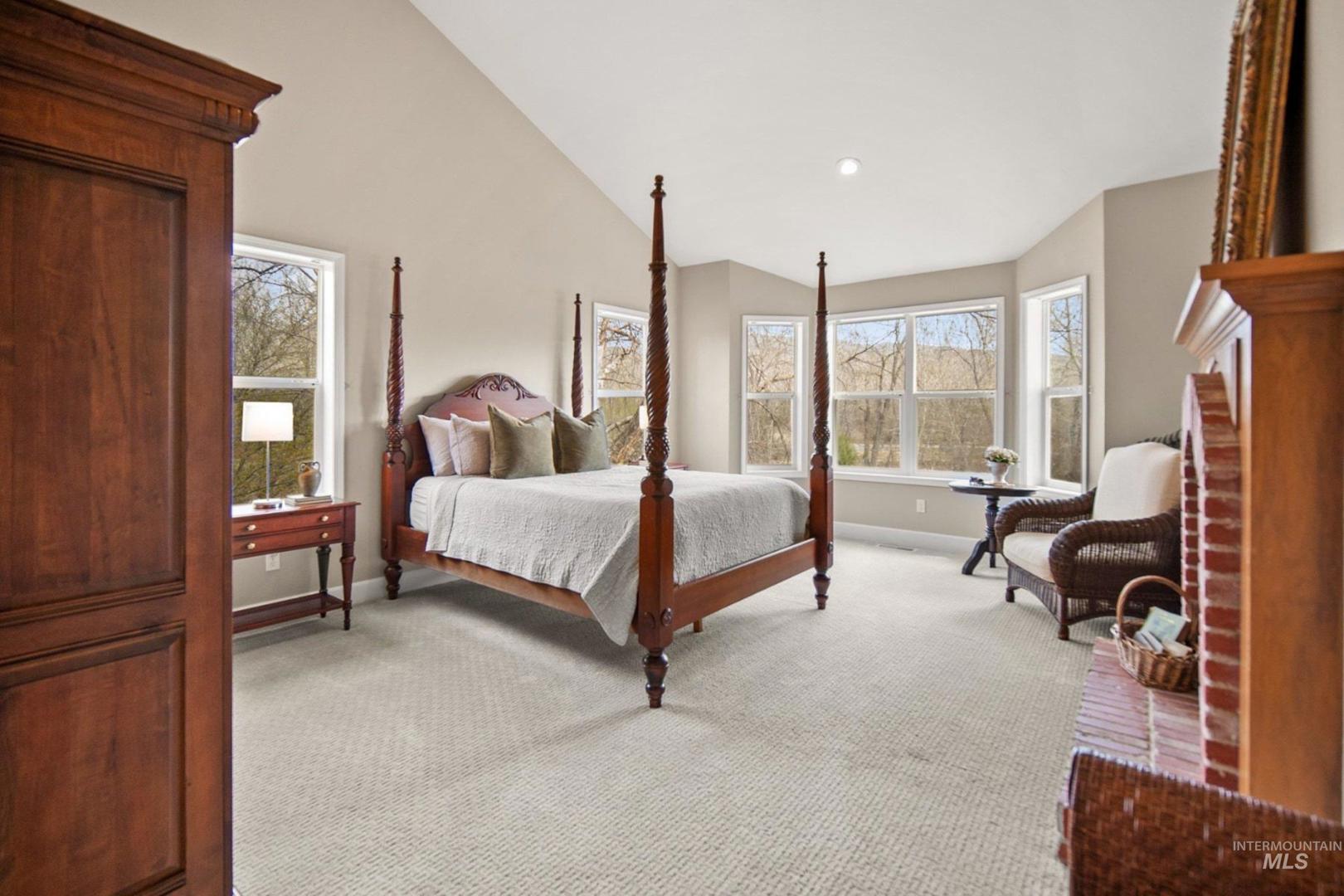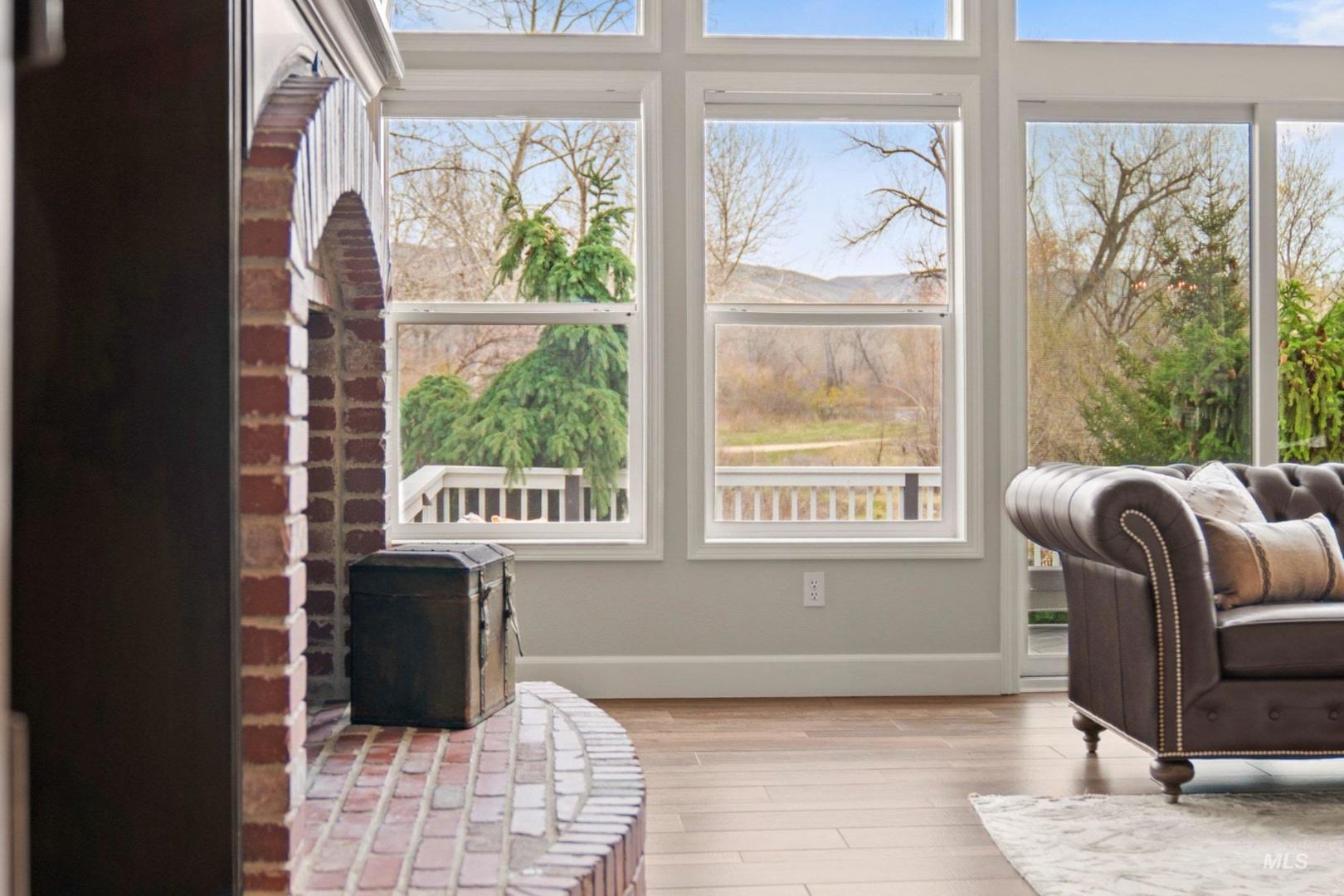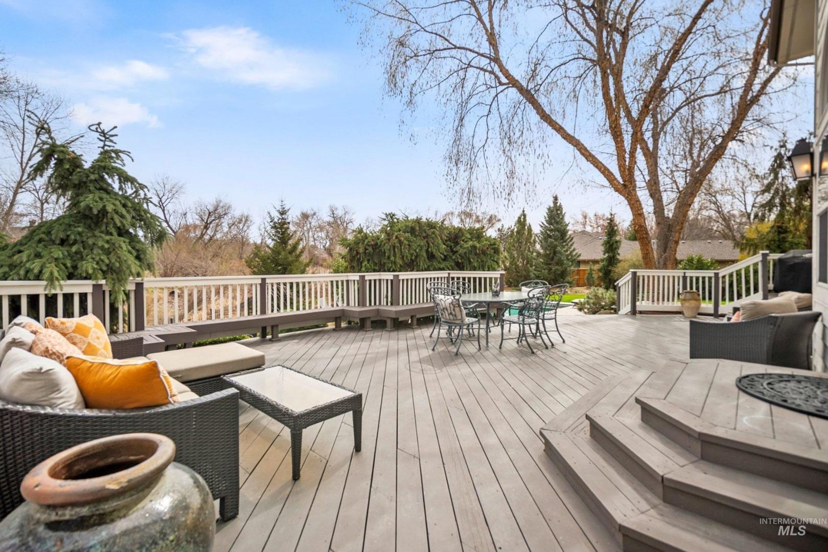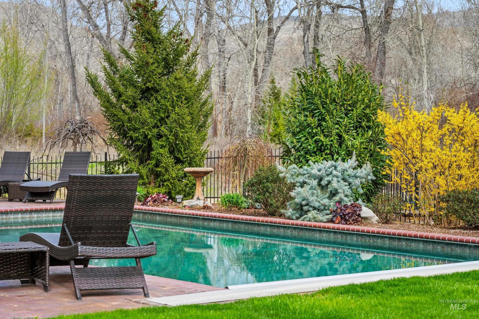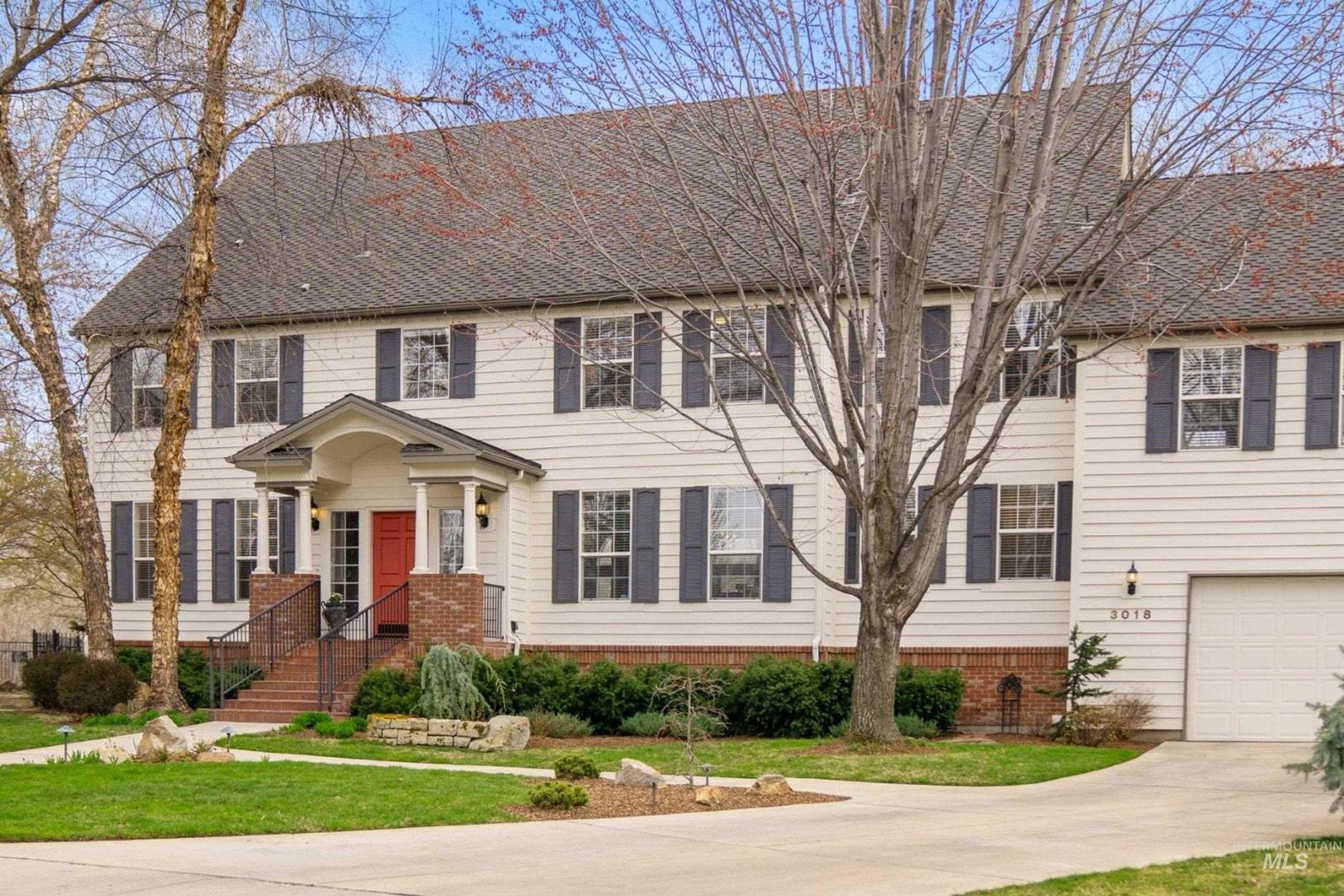 Tucked along a protected wildlife area along the Boise River, this Wood Duck Island home offers privacy, natural beauty, and an exceptional location. The backyard features a saltwater pool and spa, fire pit, tranquil creek, and direct access to the Boise River and Greenbelt. Located on a quiet cul de sac between Barber Park and Bown Crossing, the home provides easy access to recreation, dining, and everyday amenities. Inside, the light filled living room welcomes you with mountain views, a grand staircase, and open living and dining areas. The main level includes a private office and guest bedroom with adjacent full bath. The renovated kitchen features JennAir appliances, central island, quartz countertops, Italian tile flooring, and a pro style convection oven. Upstairs, the primary suite offers mountain, river and tree lined views, sitting area, and wood burning fireplace. The en suite bath includes an extended double vanity and walk in shower. 3 car tandem garage, fully fenced yard, and multiple outdoor living spaces complete this beautifully maintained home near downtown Boise and top area schools. Please see Docs for detailed amenities/updates list and floor plans. Matterport in Video link.