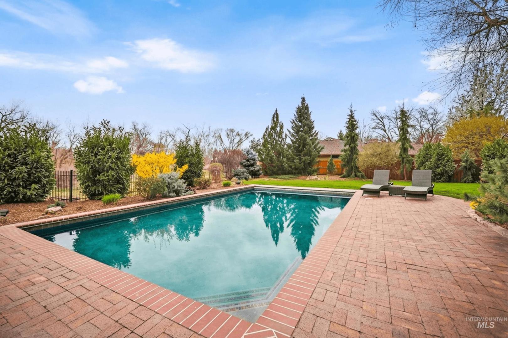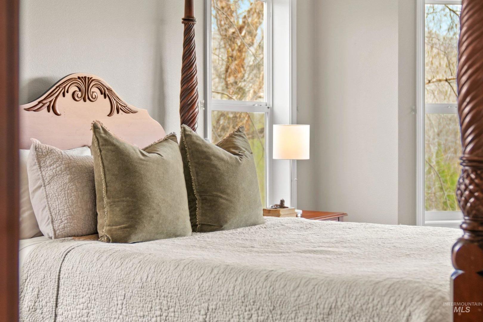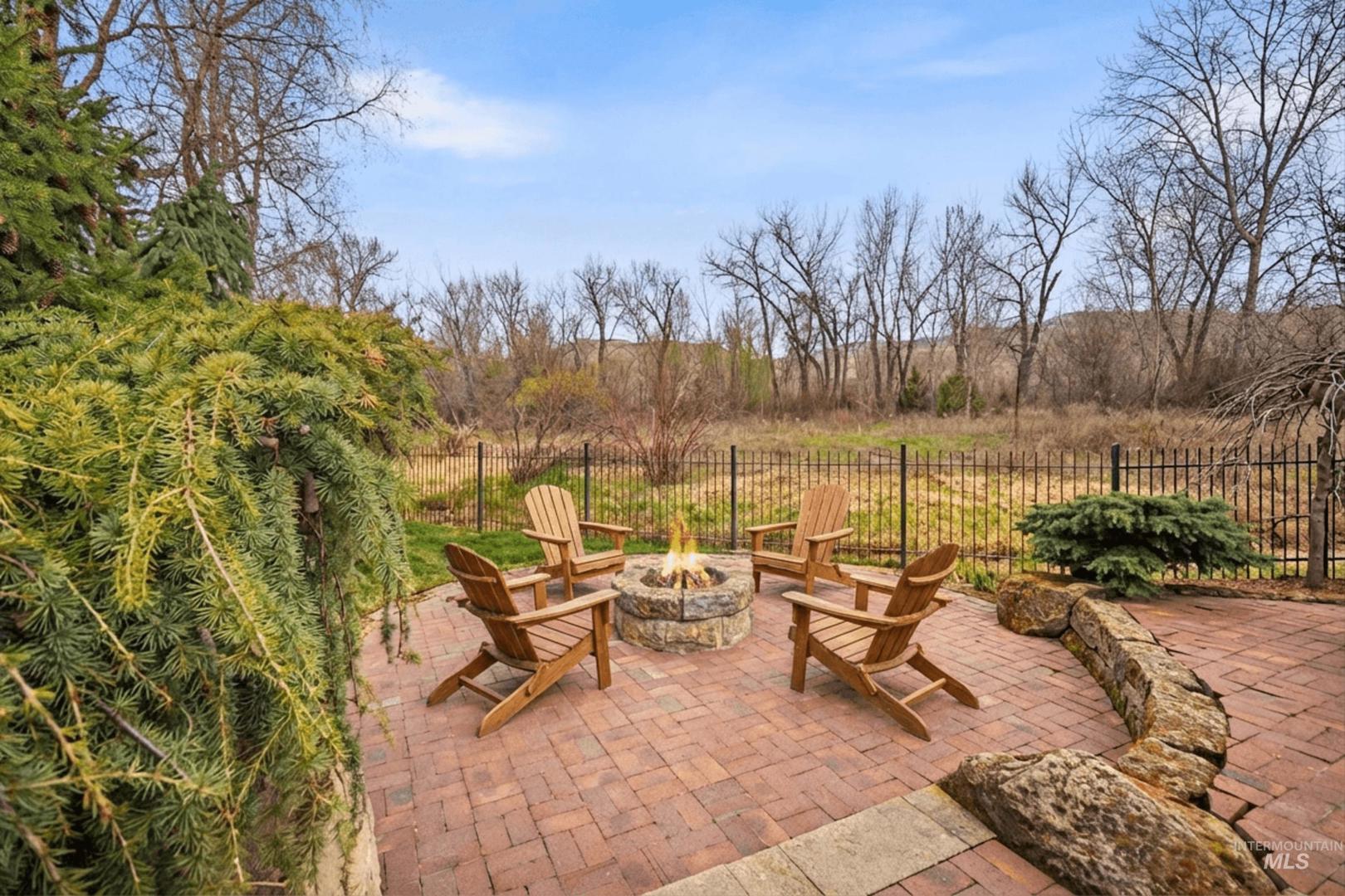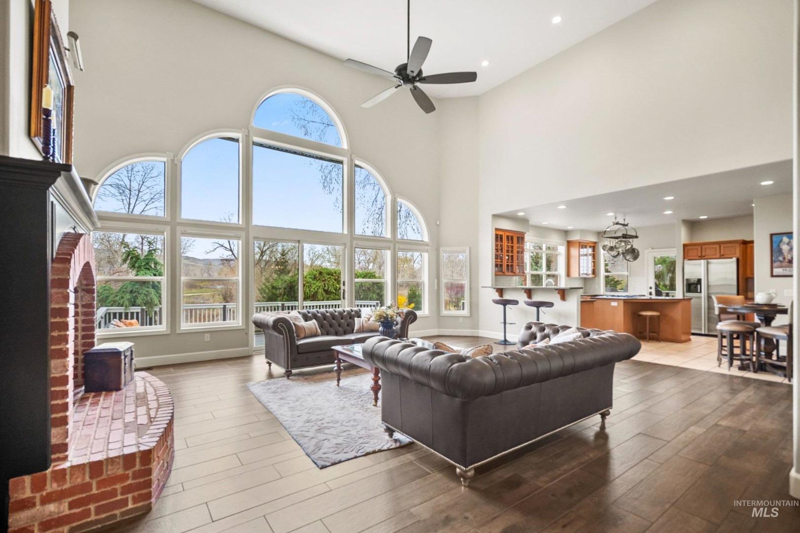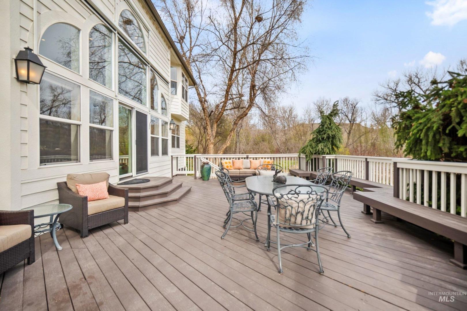 Tucked along a protected wildlife area along the Boise River, this Wood Duck Island home offers privacy, natural beauty, and an exceptional location. The backyard features a saltwater pool and spa, fire pit, tranquil creek, and direct access to the Boise River and Greenbelt. Located on a quiet cul de sac between Barber Park and Bown Crossing, the home provides easy access to recreation, dining, and everyday amenities. Inside, the light filled living room welcomes you with mountain views, a grand staircase, and open living and dining areas. The main level includes a private office and guest bedroom with adjacent full bath. The renovated kitchen features JennAir appliances, central island, quartz countertops, Italian tile flooring, and a pro style convection oven. Upstairs, the primary suite offers mountain, river and tree lined views, sitting area, and wood burning fireplace. The en suite bath includes an extended double vanity and walk in shower. 3 car tandem garage, fully fenced yard, and multiple outdoor living spaces complete this beautifully maintained home near downtown Boise and top area schools. Please see Docs for detailed amenities/updates list and floor plans. Matterport in Video link.