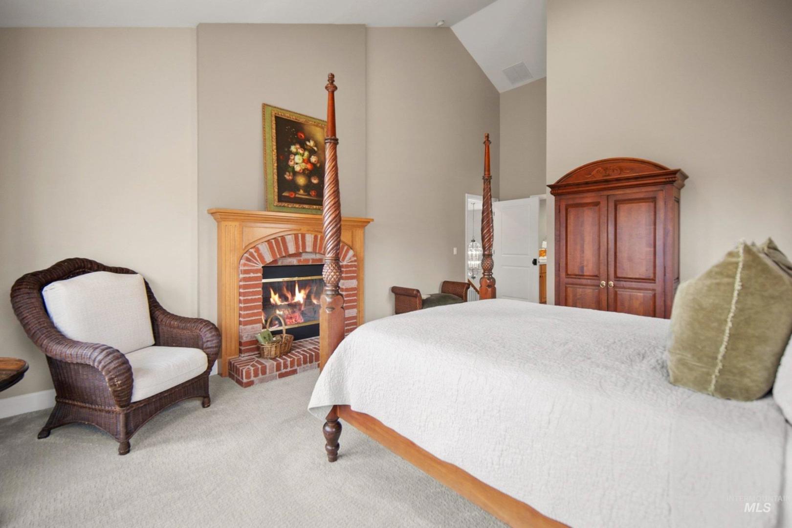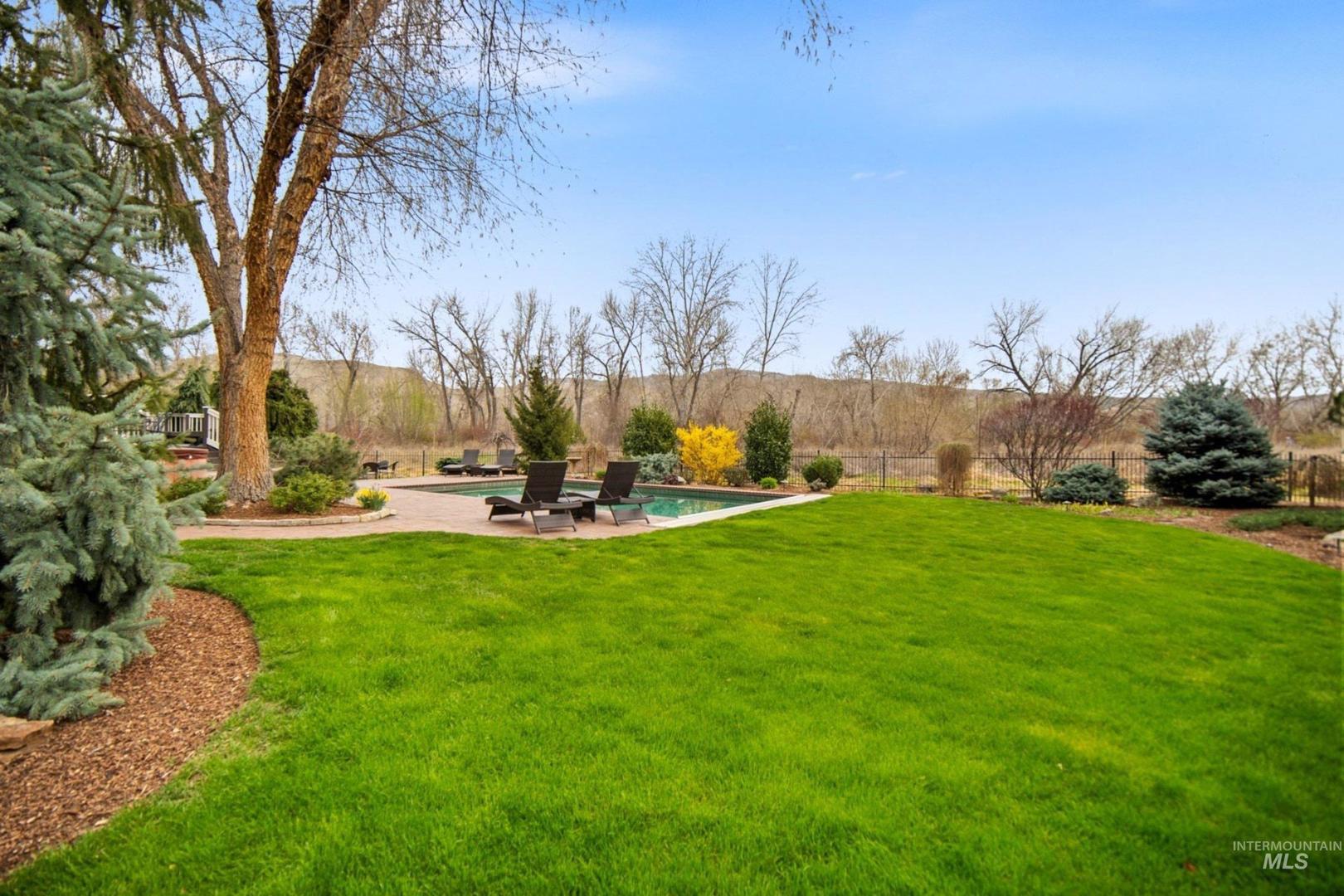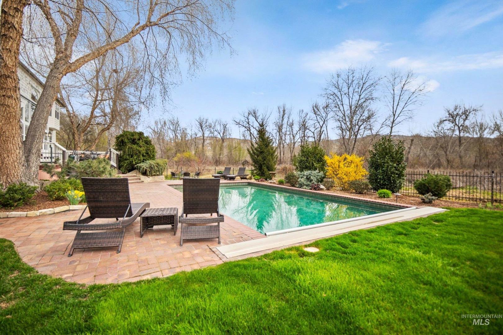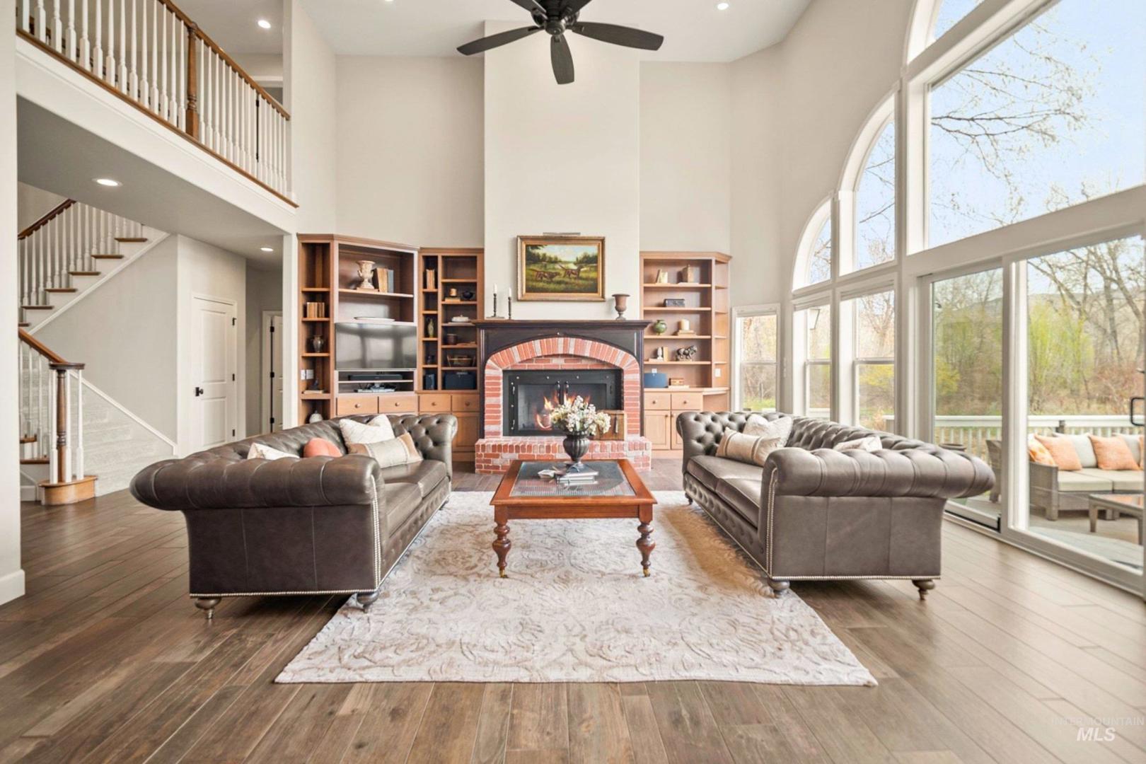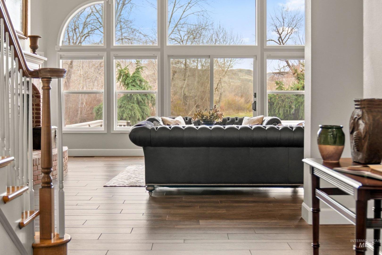 Tucked along a protected wildlife area along the Boise River, this Wood Duck Island home offers privacy, natural beauty, and an exceptional location. The backyard features a saltwater pool and spa, fire pit, tranquil creek, and direct access to the Boise River and Greenbelt. Located on a quiet cul de sac between Barber Park and Bown Crossing, the home provides easy access to recreation, dining, and everyday amenities. Inside, the light filled living room welcomes you with mountain views, a grand staircase, and open living and dining areas. The main level includes a private office and guest bedroom with adjacent full bath. The renovated kitchen features JennAir appliances, central island, quartz countertops, Italian tile flooring, and a pro style convection oven. Upstairs, the primary suite offers mountain, river and tree lined views, sitting area, and wood burning fireplace. The en suite bath includes an extended double vanity and walk in shower. 3 car tandem garage, fully fenced yard, and multiple outdoor living spaces complete this beautifully maintained home near downtown Boise and top area schools. Please see Docs for detailed amenities/updates list and floor plans. Matterport in Video link.