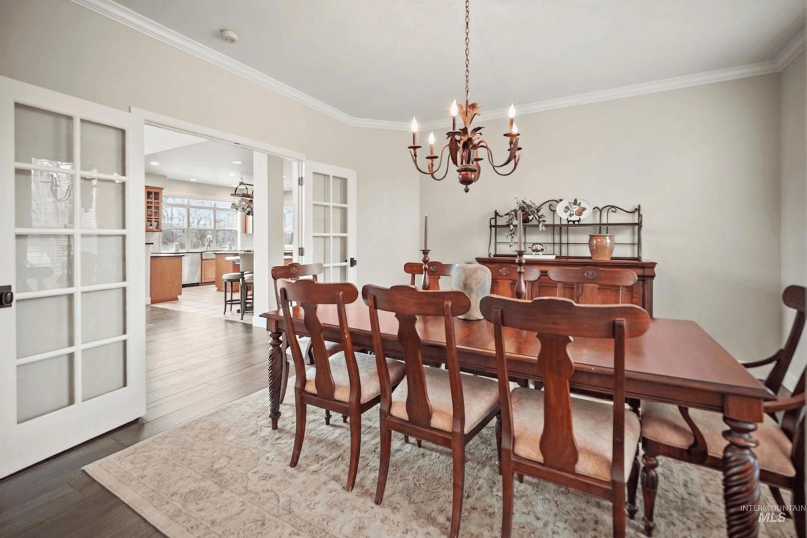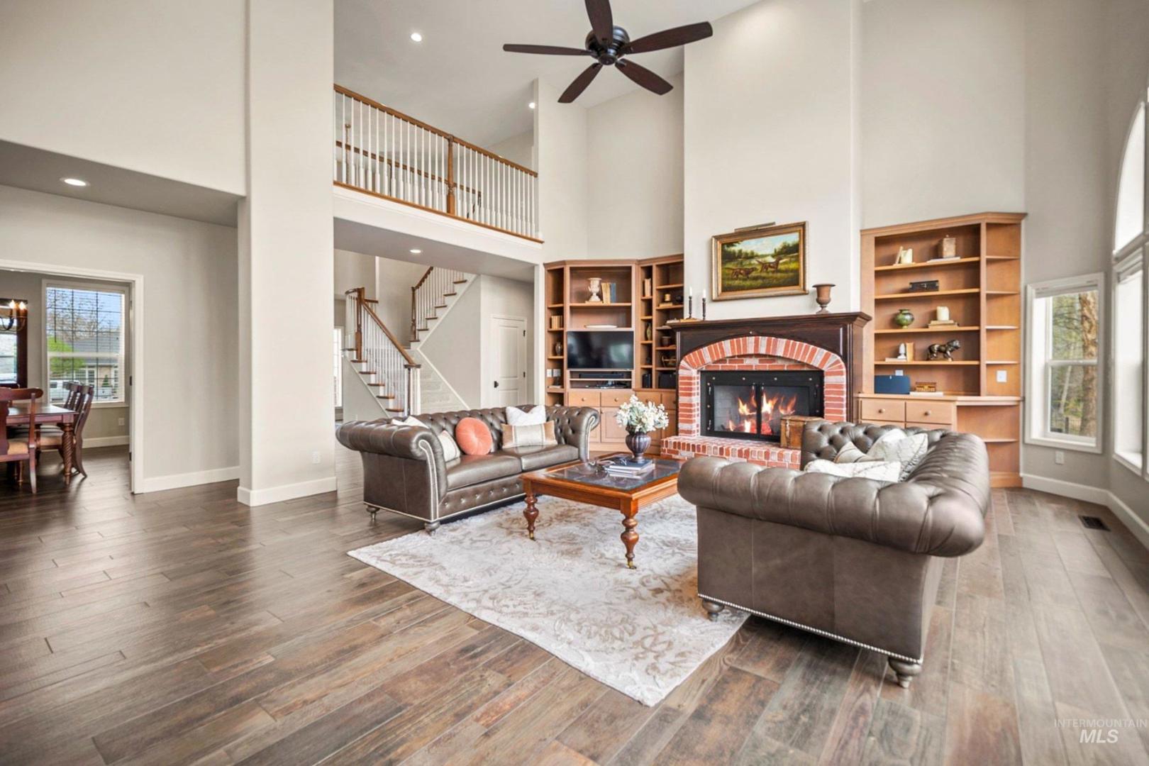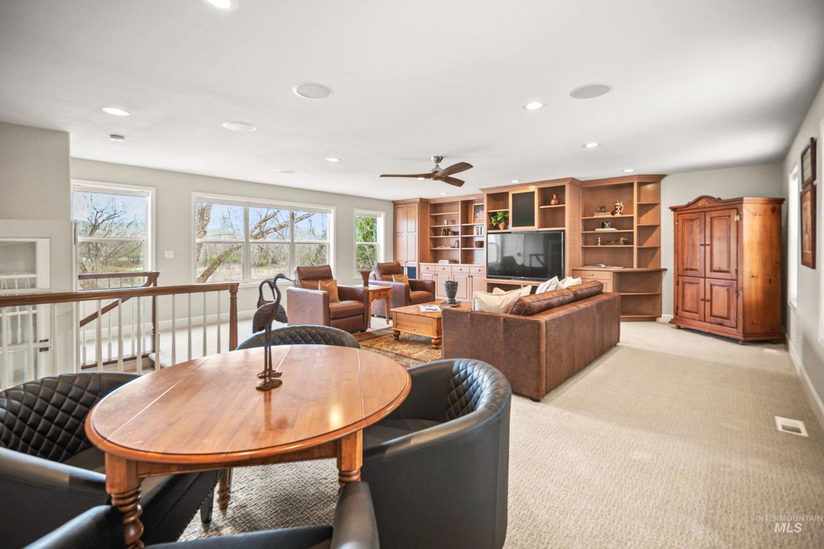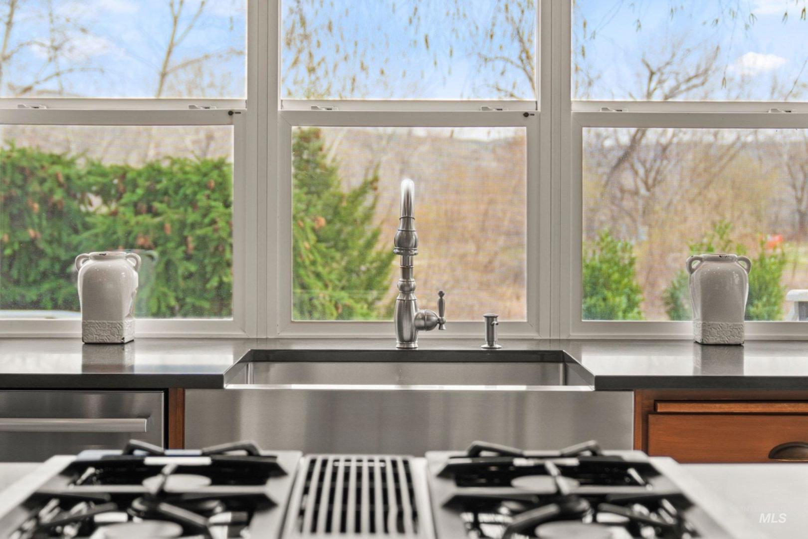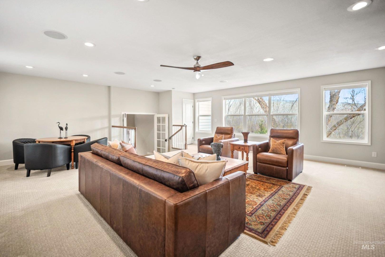 Tucked along a protected wildlife area along the Boise River, this Wood Duck Island home offers privacy, natural beauty, and an exceptional location. The backyard features a saltwater pool and spa, fire pit, tranquil creek, and direct access to the Boise River and Greenbelt. Located on a quiet cul de sac between Barber Park and Bown Crossing, the home provides easy access to recreation, dining, and everyday amenities. Inside, the light filled living room welcomes you with mountain views, a grand staircase, and open living and dining areas. The main level includes a private office and guest bedroom with adjacent full bath. The renovated kitchen features JennAir appliances, central island, quartz countertops, Italian tile flooring, and a pro style convection oven. Upstairs, the primary suite offers mountain, river and tree lined views, sitting area, and wood burning fireplace. The en suite bath includes an extended double vanity and walk in shower. 3 car tandem garage, fully fenced yard, and multiple outdoor living spaces complete this beautifully maintained home near downtown Boise and top area schools. Please see Docs for detailed amenities/updates list and floor plans. Matterport in Video link.
